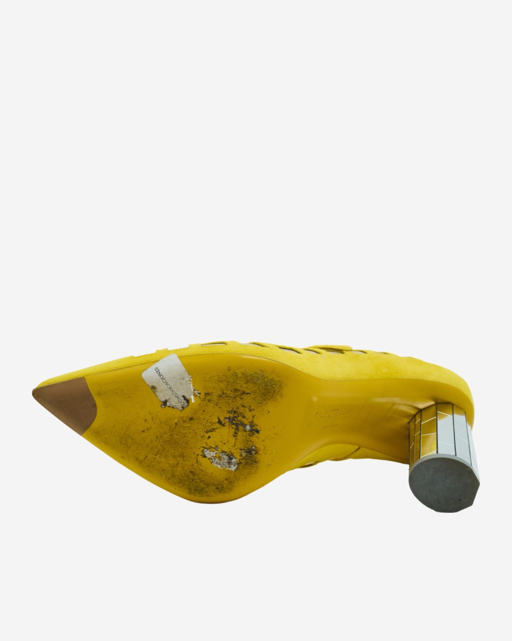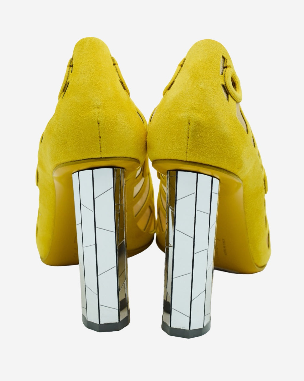 - Descripción: Tacones Ferragamo en gamuza color amarillo, puntera puntiaguda, tacón ancho efecto espejo, logo grabado en el interior