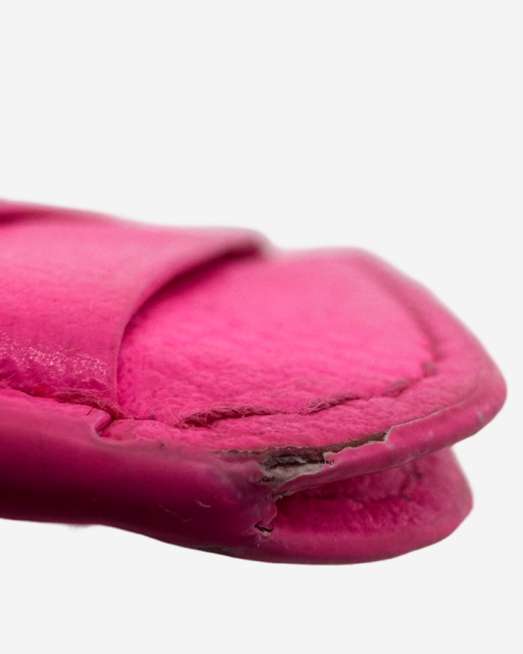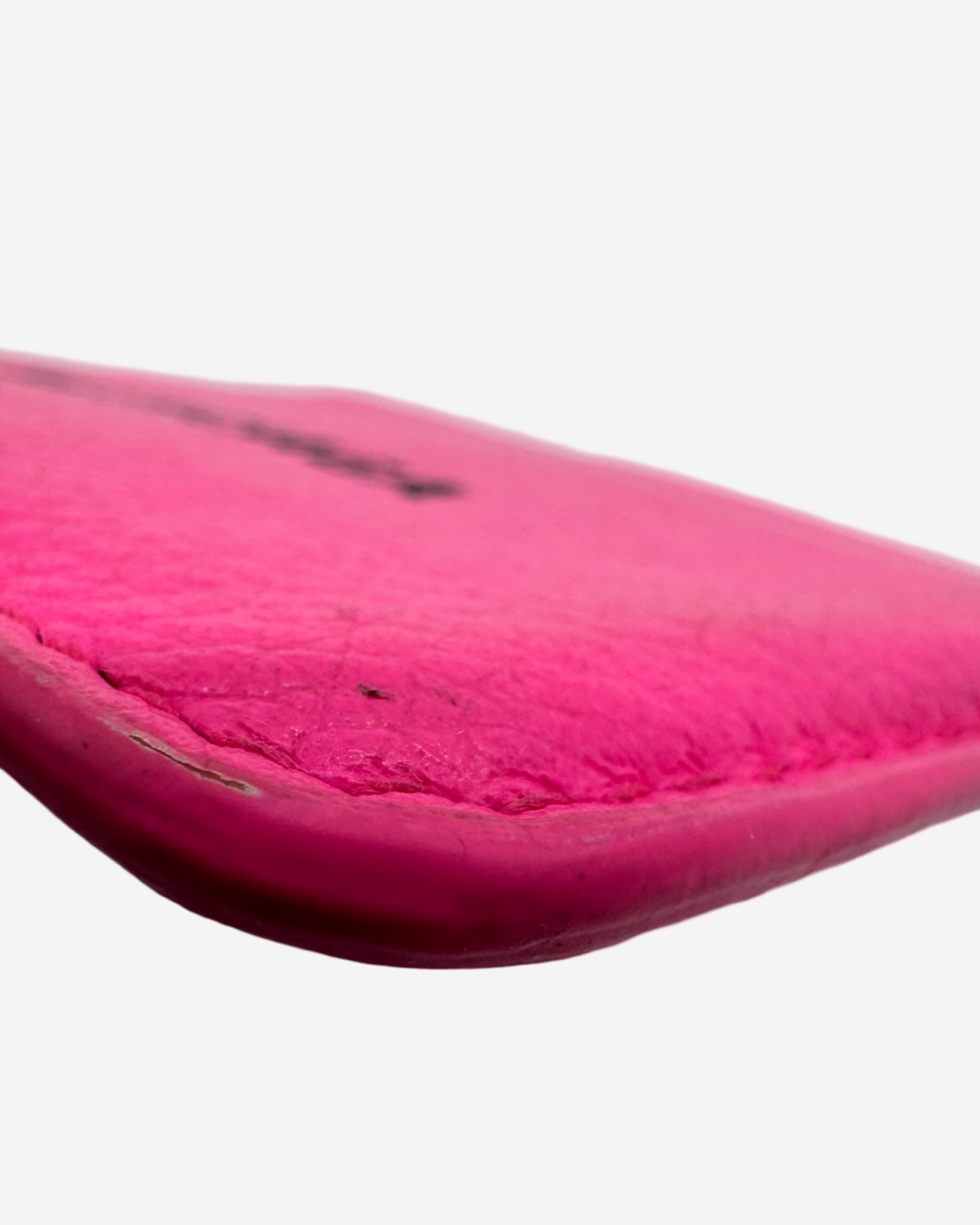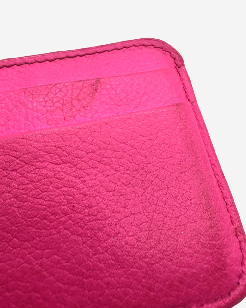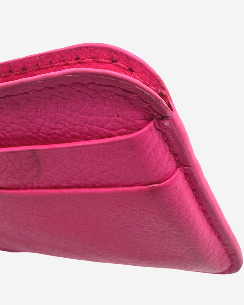 - Descripción: Tarjetero en piel color rosa, logo frontal, puntas redondeadas