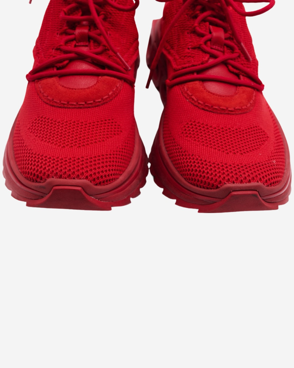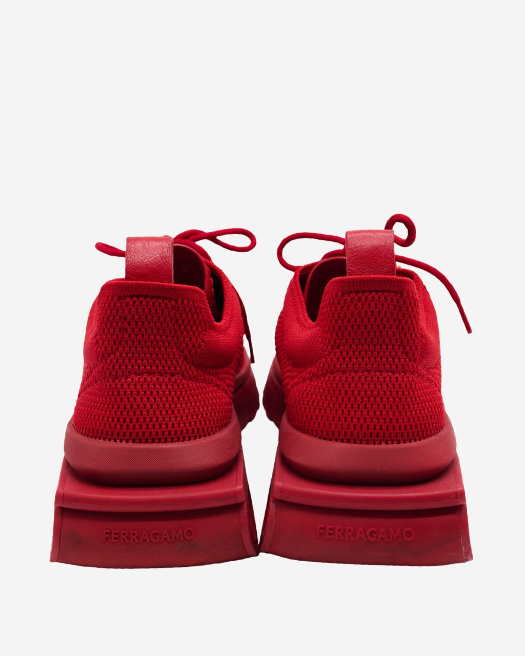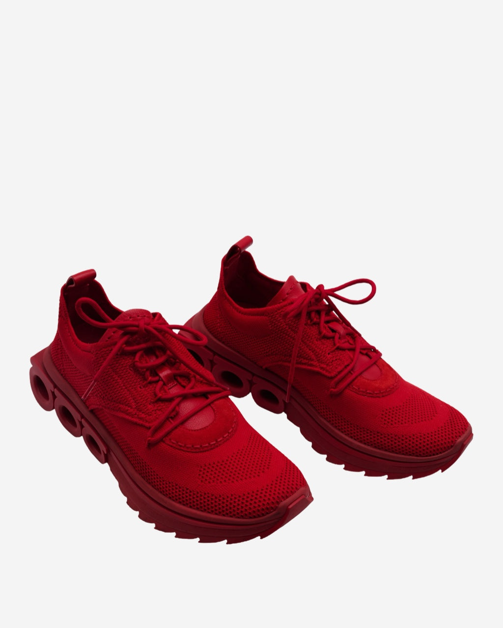 - Descripción: Tenis Ferragamo en color rojo, puntera puntiaguda, ajuste con agujetas, tipo sock, suela oversized con motivo de gancini's, plantilla en piel