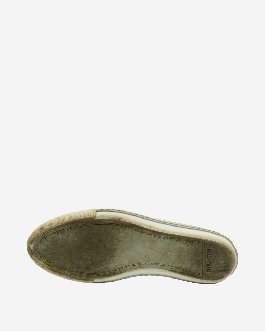 - Descripción: Tenis Miu Miu en piel color dorado, puntera puntiaguda metálica, motivo de rhinestones en la puntera, ajuste con agujetas, suela de goma, logo en la plantilla interior, hardware en tono plateado
