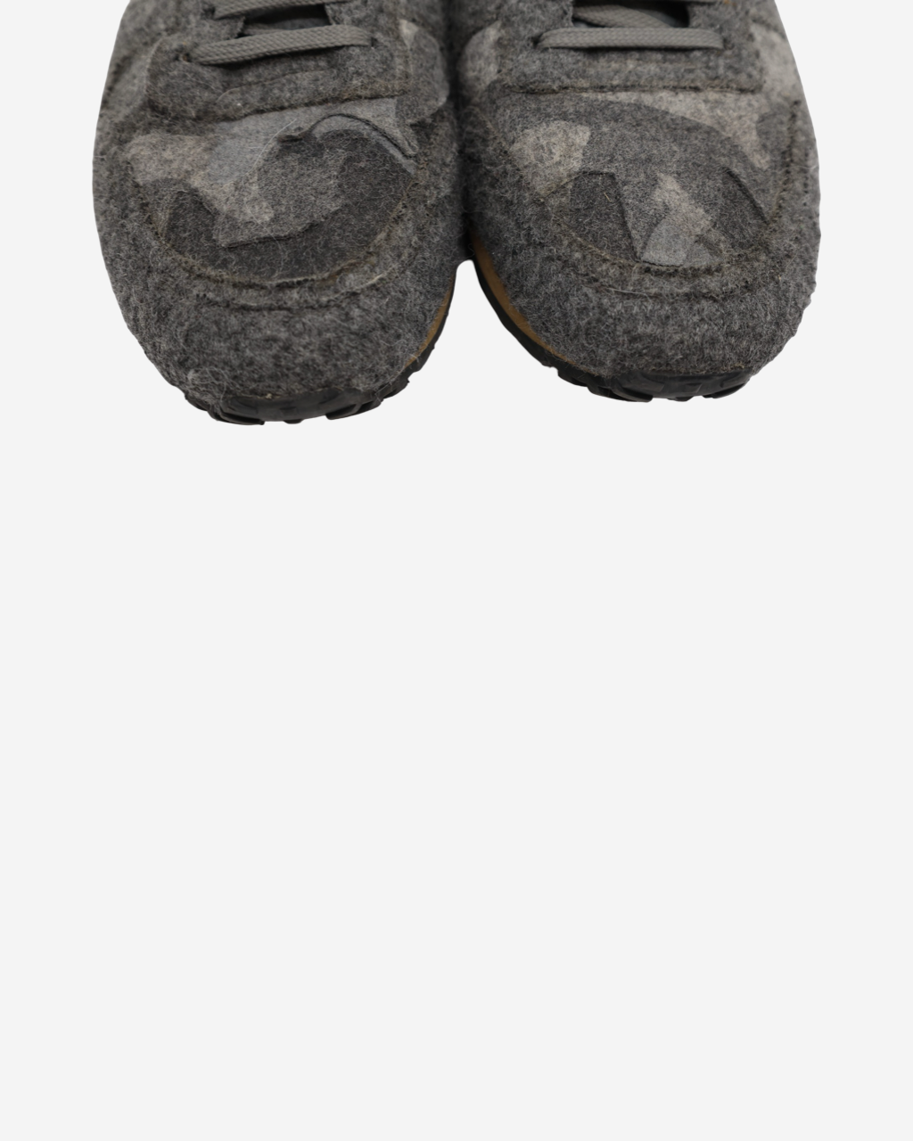 - Descripción: Tenis en cammo color gris, puntera en v, ajuste con agujetas, suela de goma en color beige