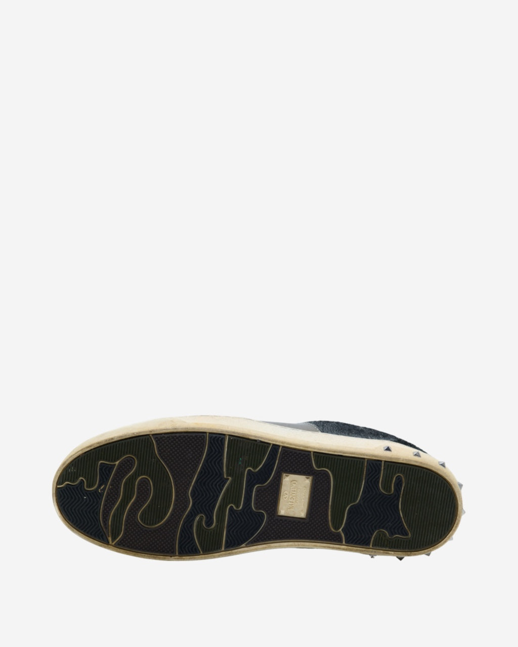 - Descripción: Tenis en fur color plateado, puntera almendrada, suela de goma en color blanco con motivo de studs característicos, ajuste con agujetas, forro interior en piel