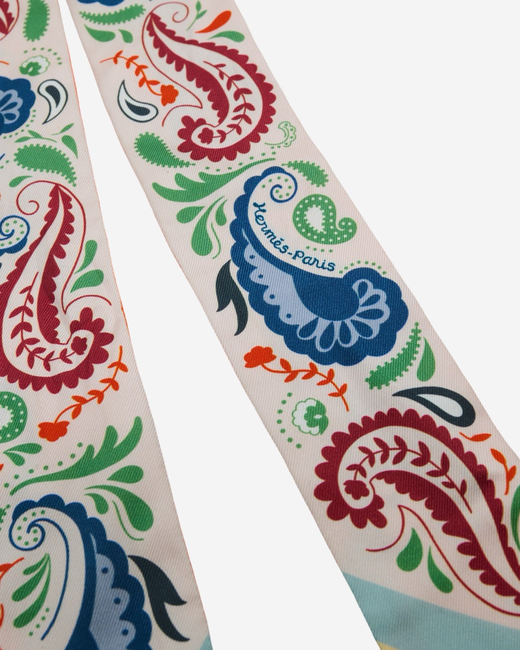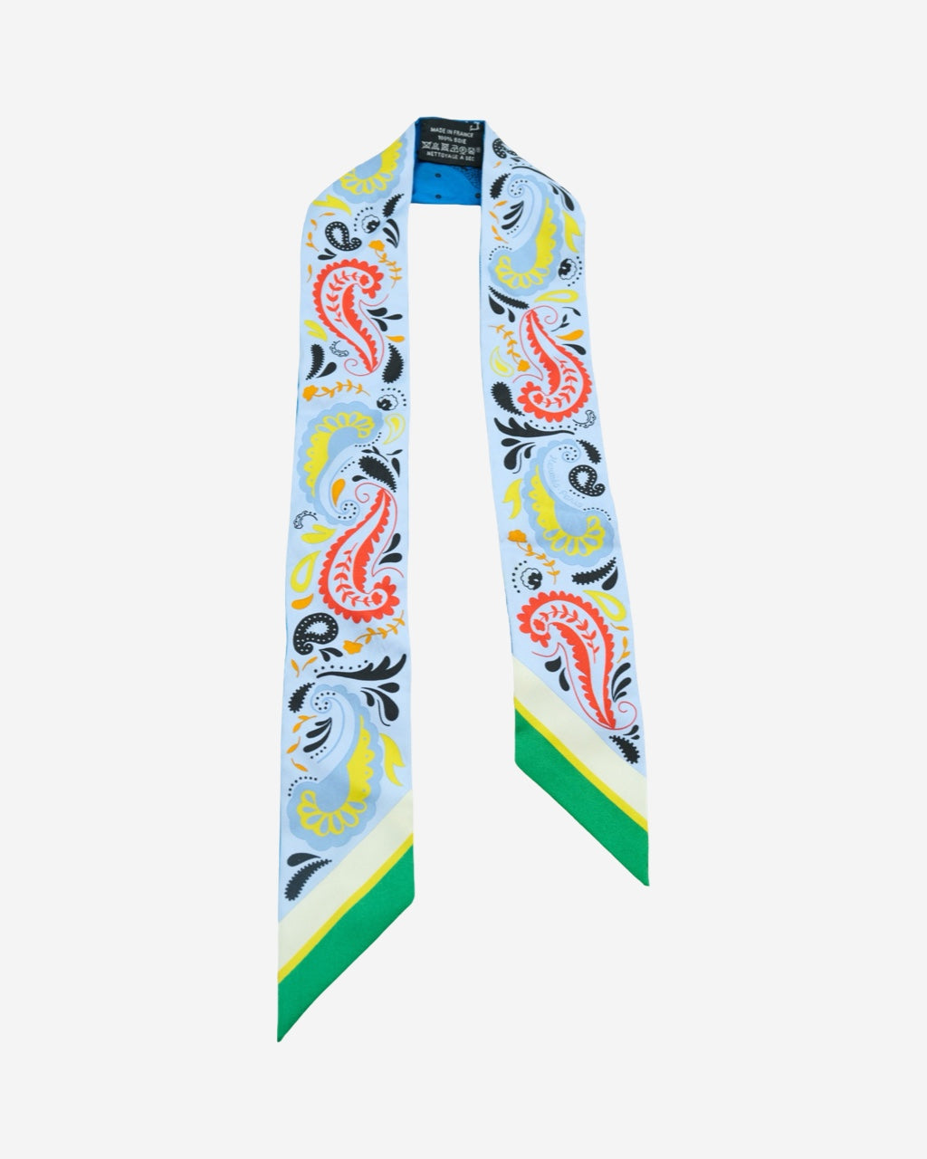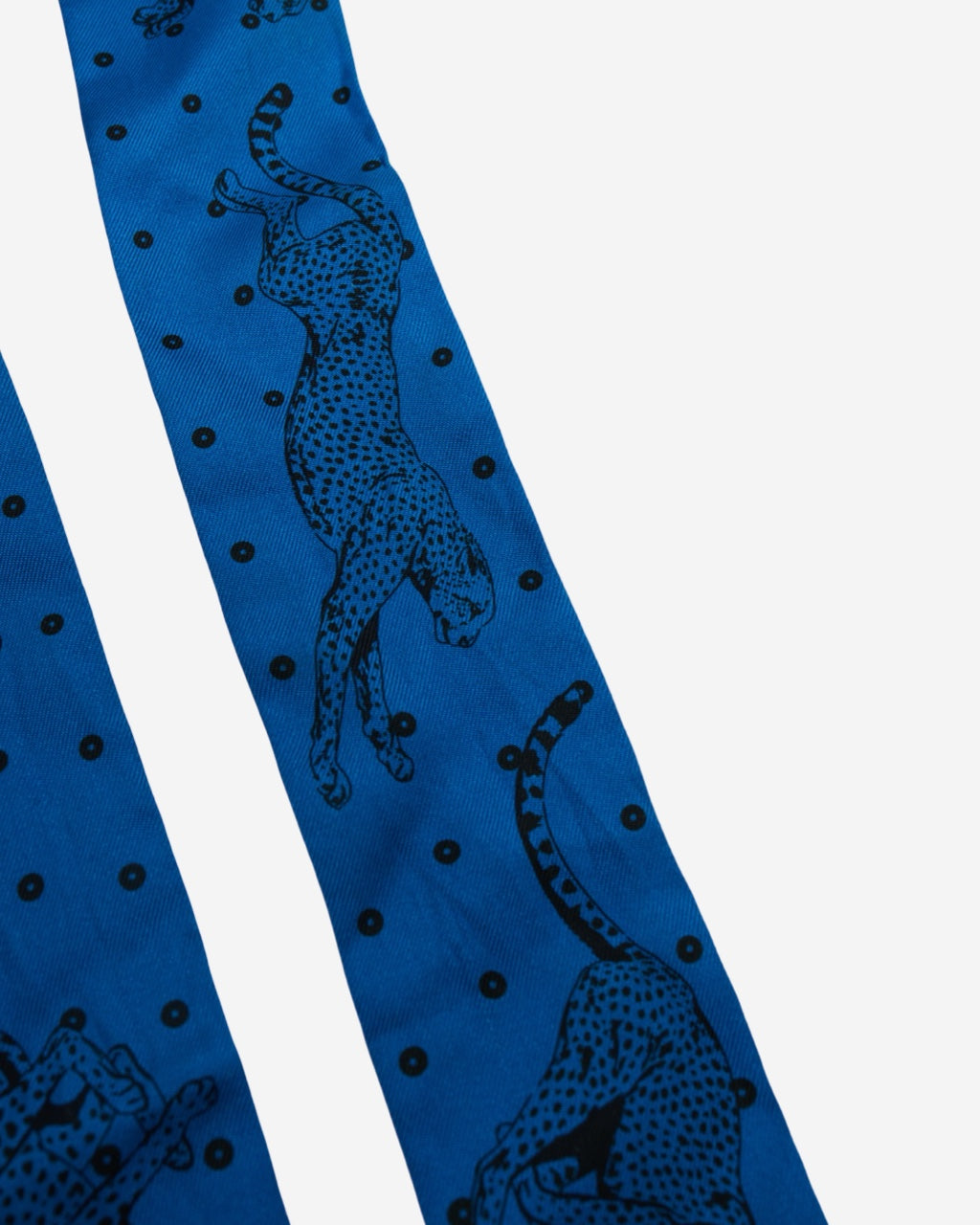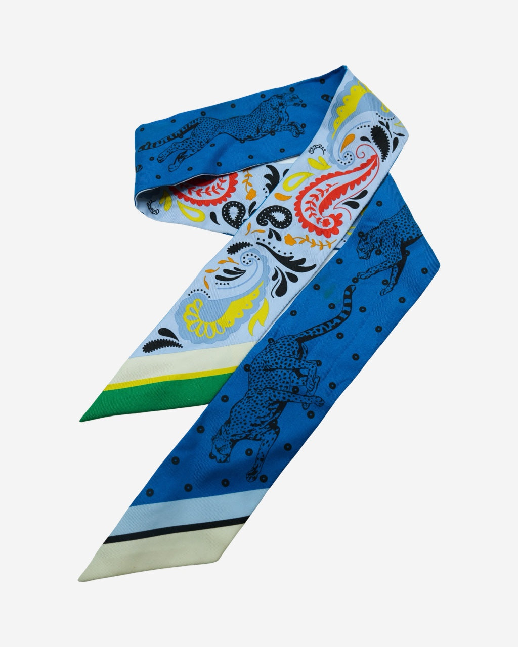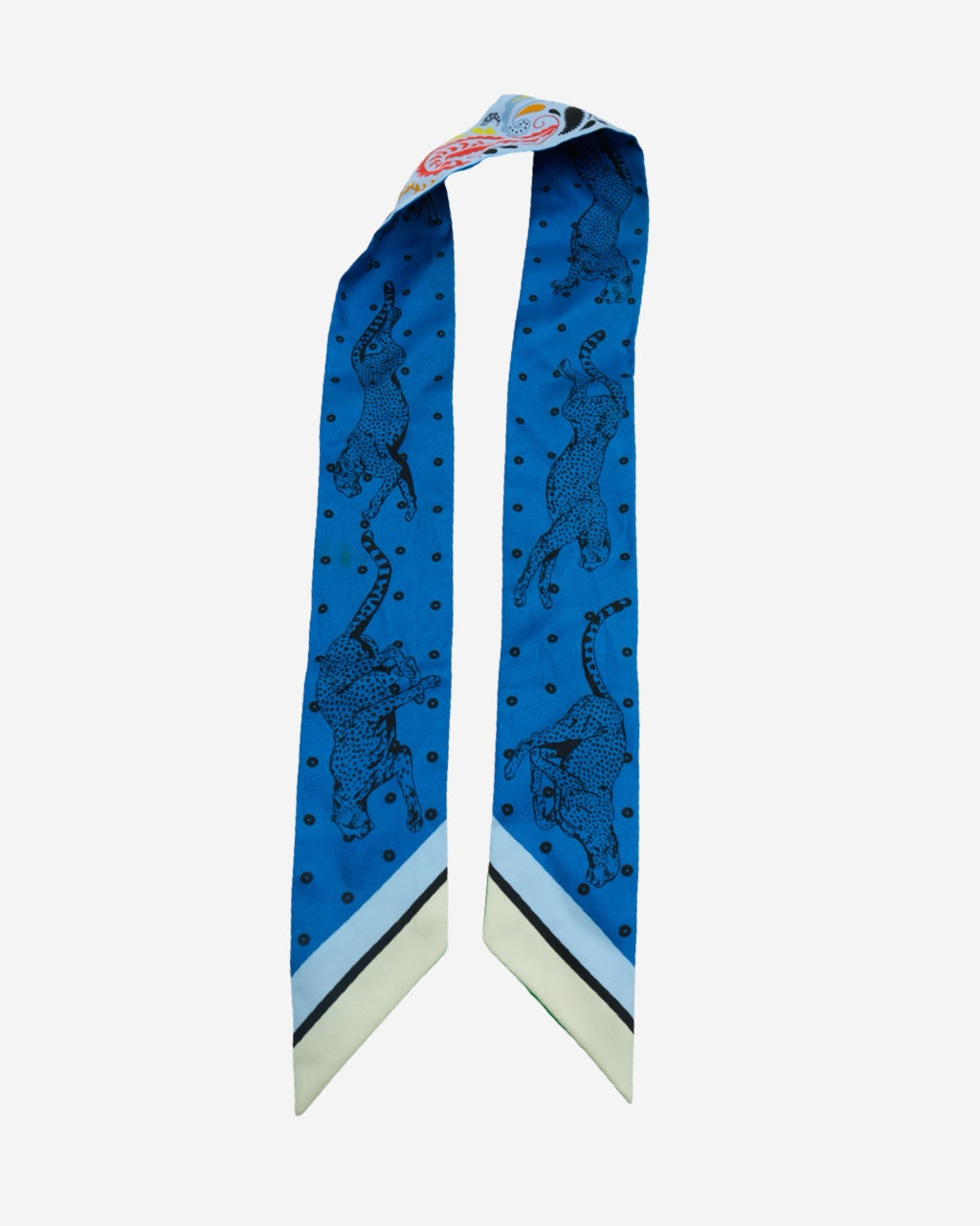 - Descripción: Twilly Hermès con motivos multicolores y panteras, fondo en color azul