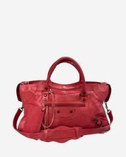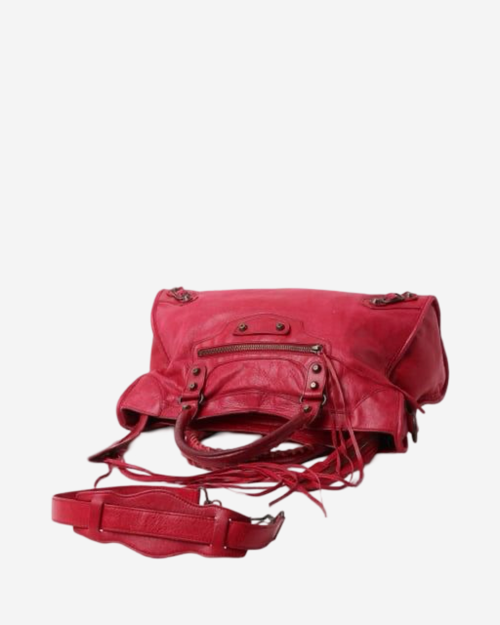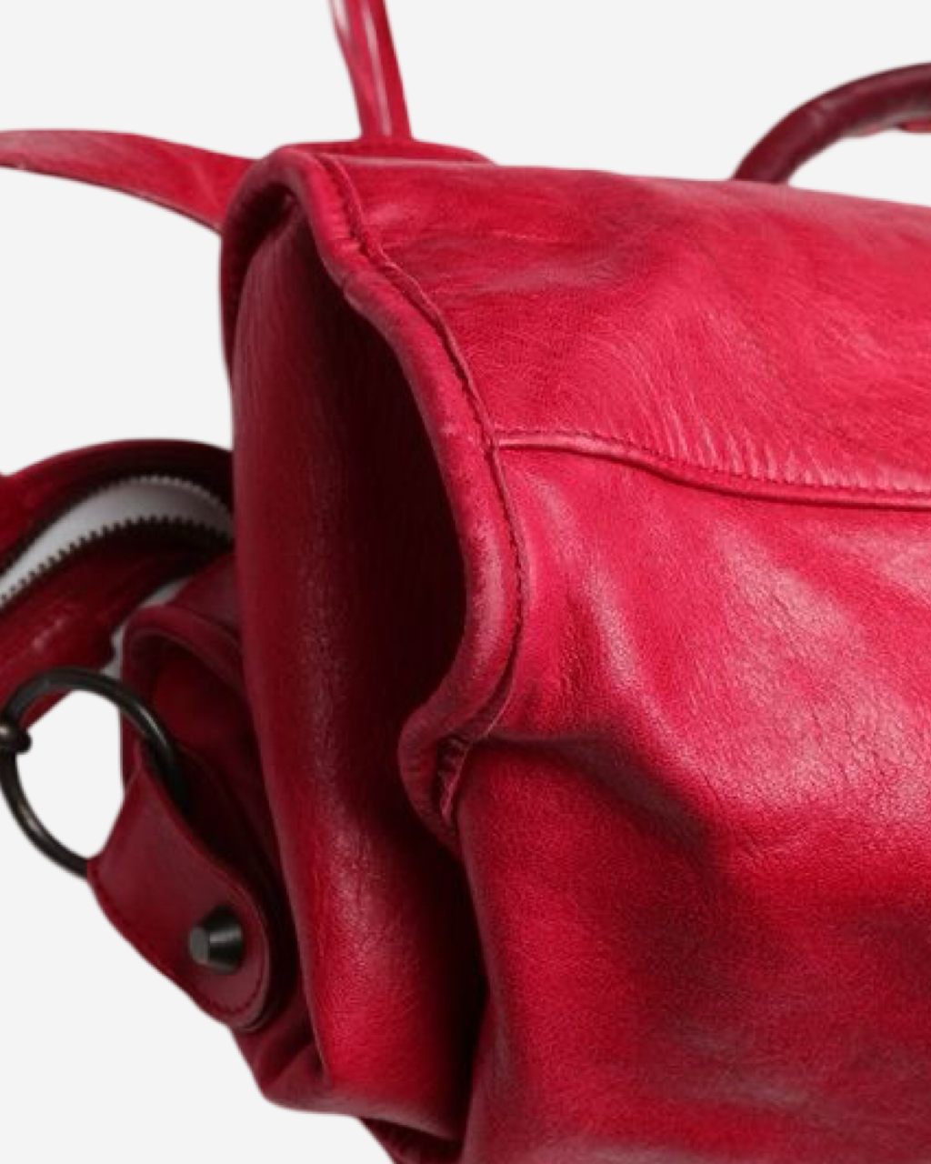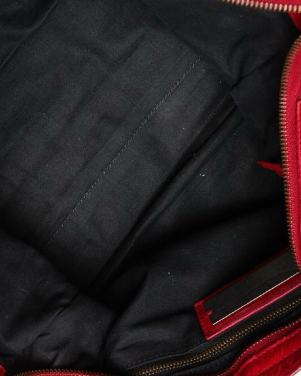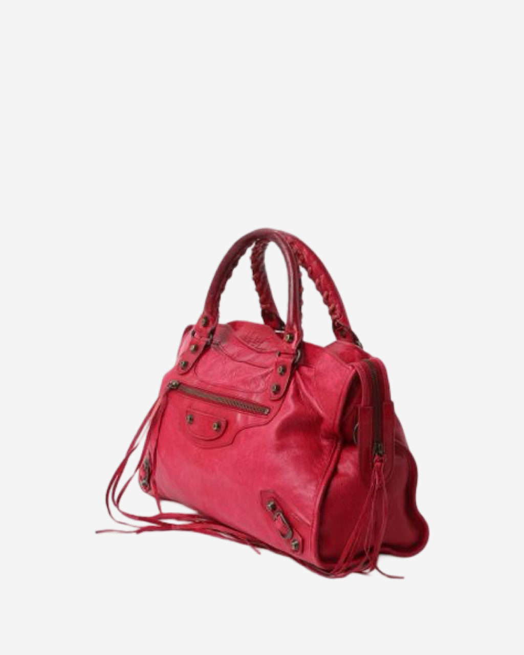 - Descripción: Bolsa de mano con doble asa fija, zipper frontal, detalle de studs, cierre al tope, hardware efecto envejecido, forro interior textil