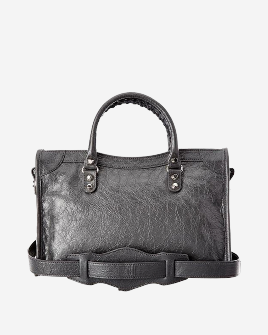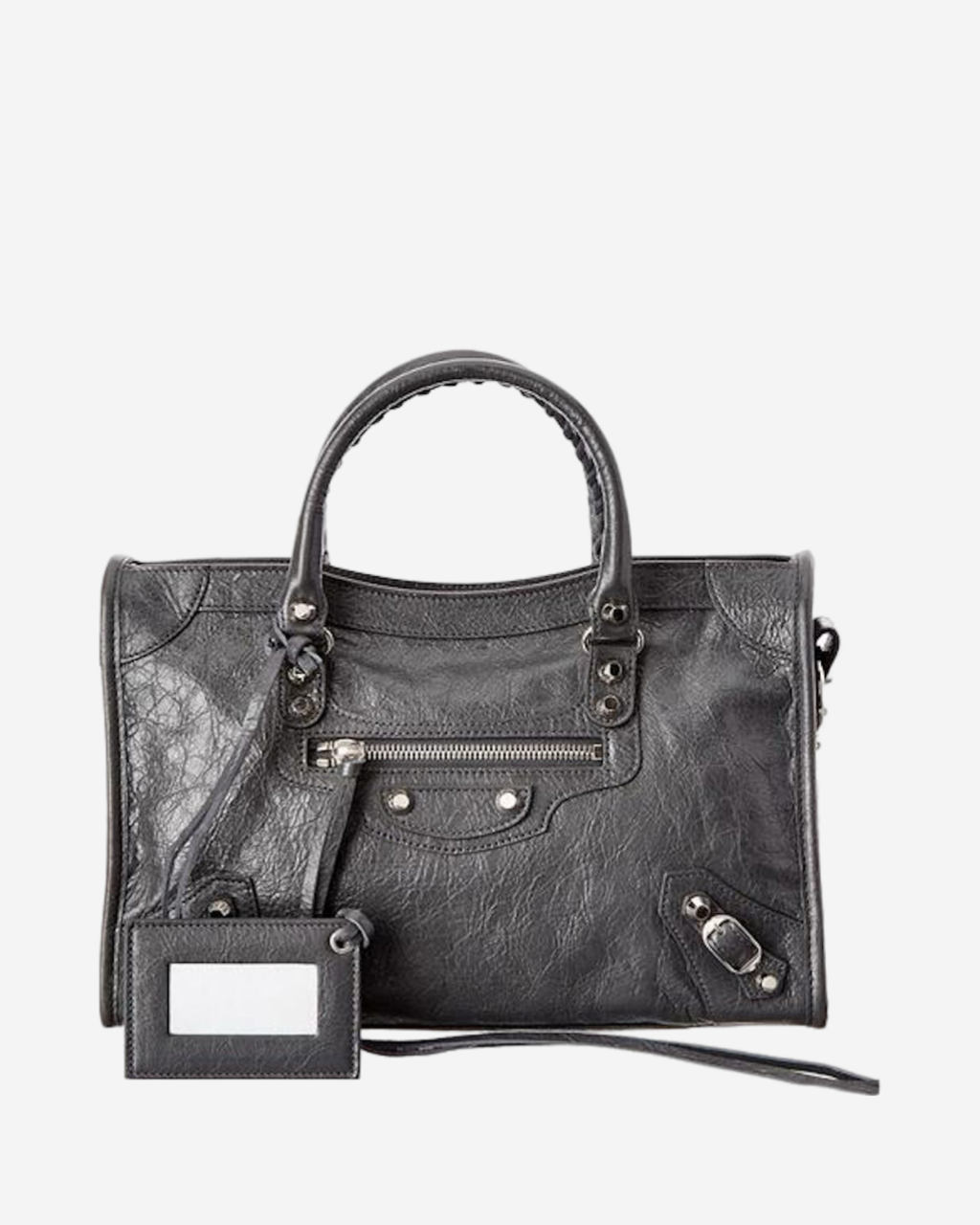 • Descripción: Bolsa de mano con doble asa fija, bolsillo frontal con cierre, cierre al tope, forro textil, hardware efecto envejecido