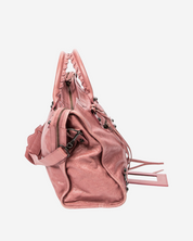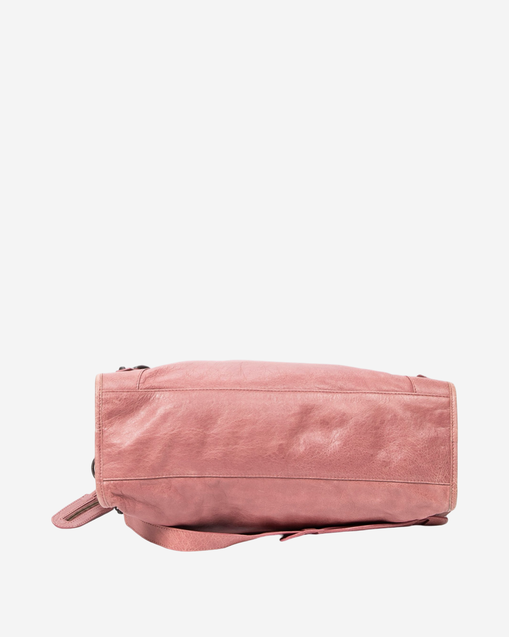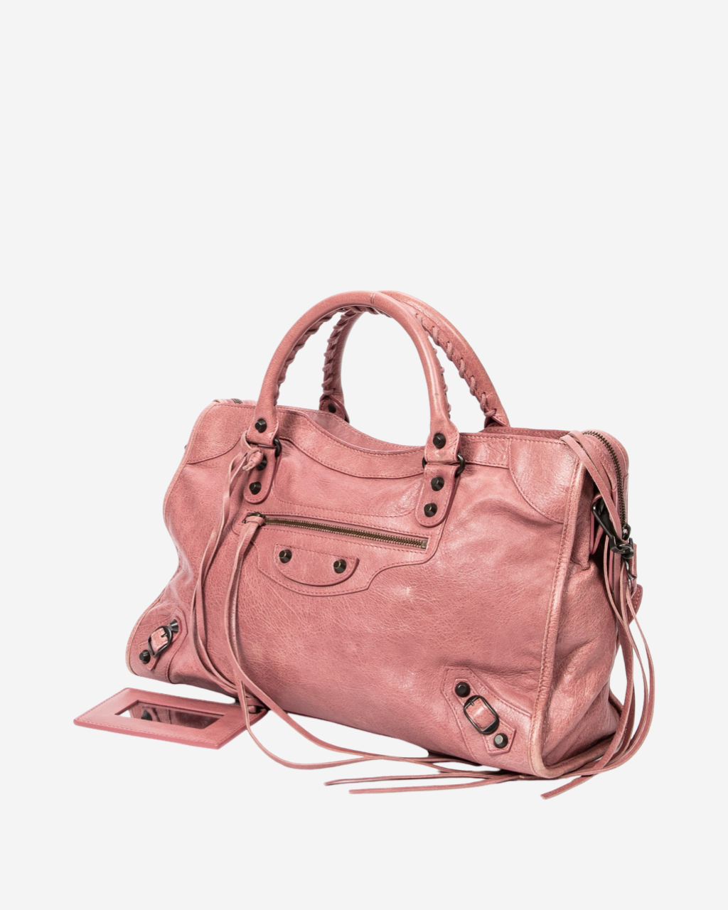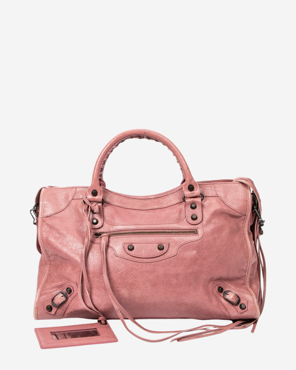 • Descripción: Bolsa de mano con doble asa fija, bolsillo frontal con cierre, cierre al tope, forro textil, hardware efecto envejecido