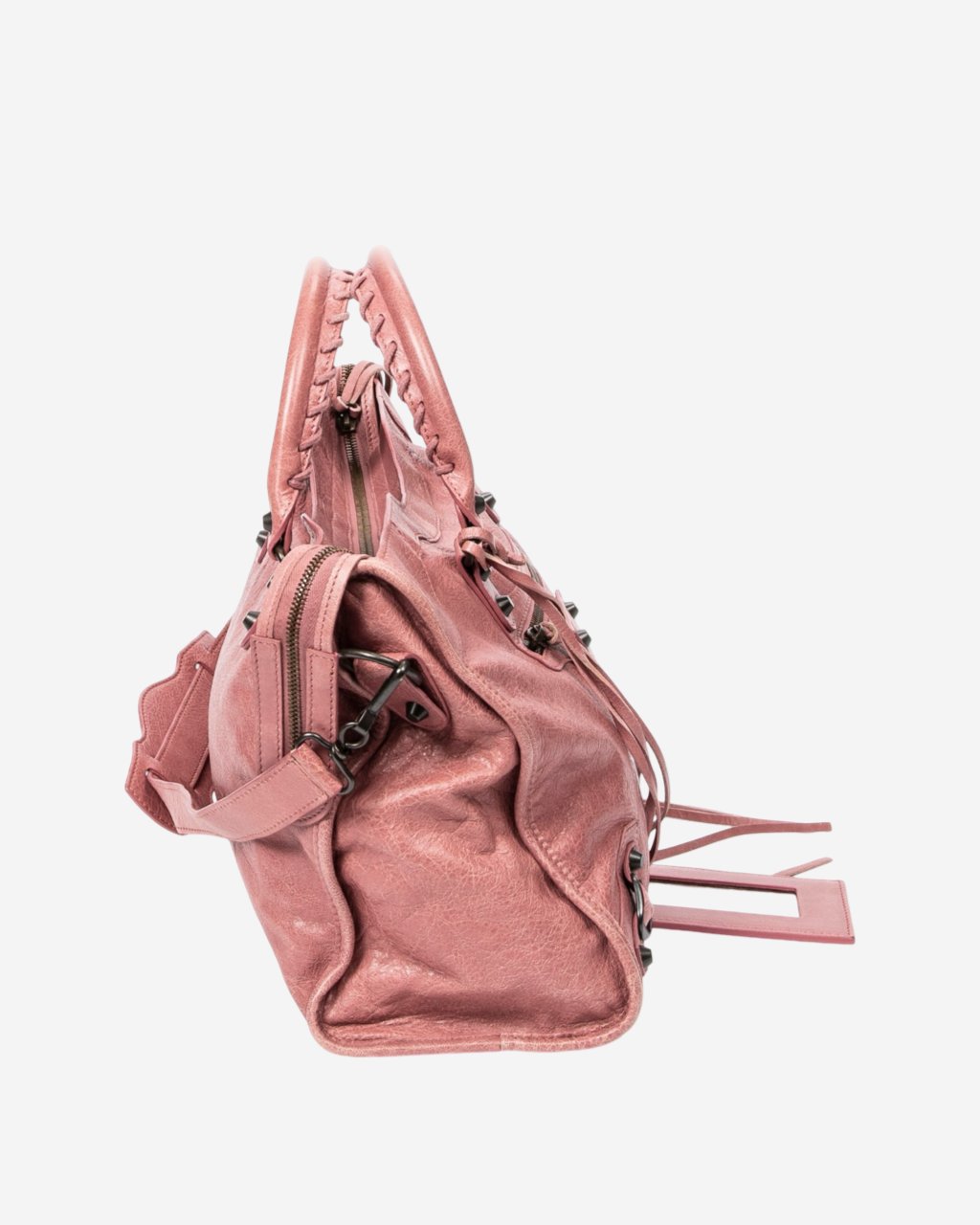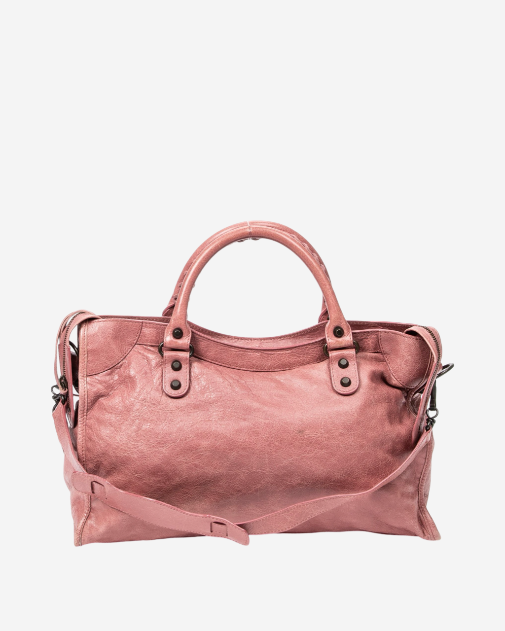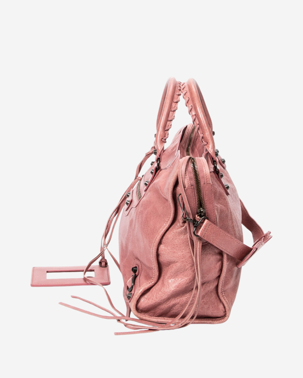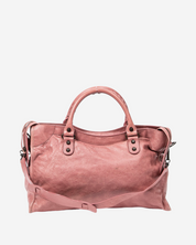 • Descripción: Bolsa de mano con doble asa fija, bolsillo frontal con cierre, cierre al tope, forro textil, hardware efecto envejecido