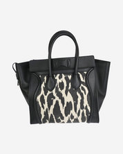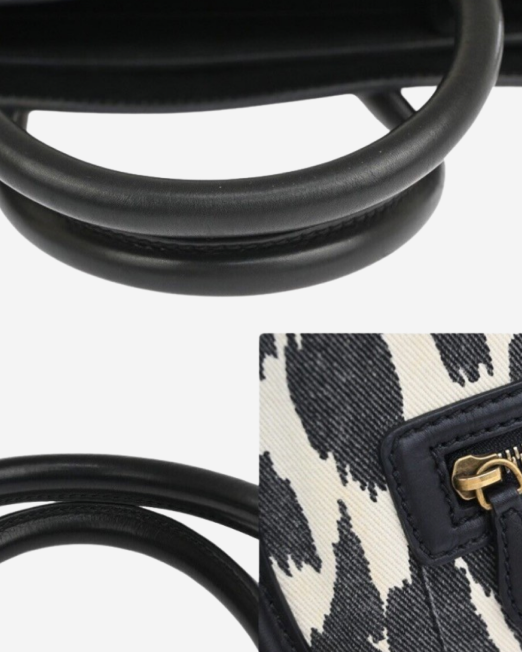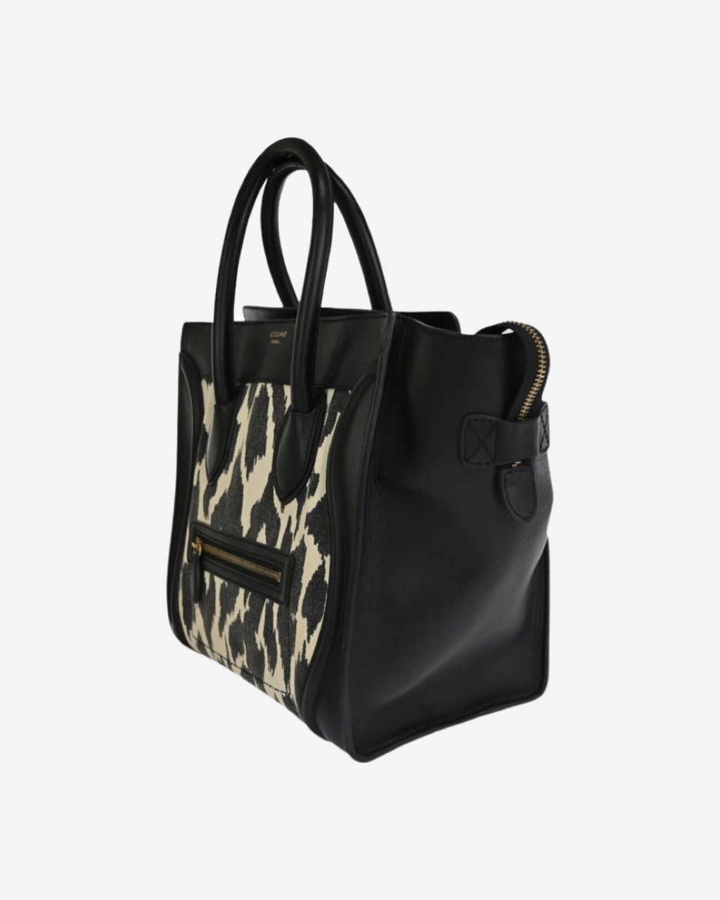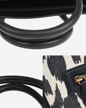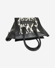 • Descripción: Bolsa de mano bicolor con diseño de animal print en el centro, doble asa, con cierre de cremallera, un bolsillo y dos planos interiores, un bolsillo exterior con cremallera en la parte delantera.