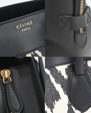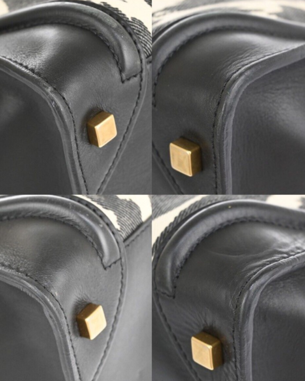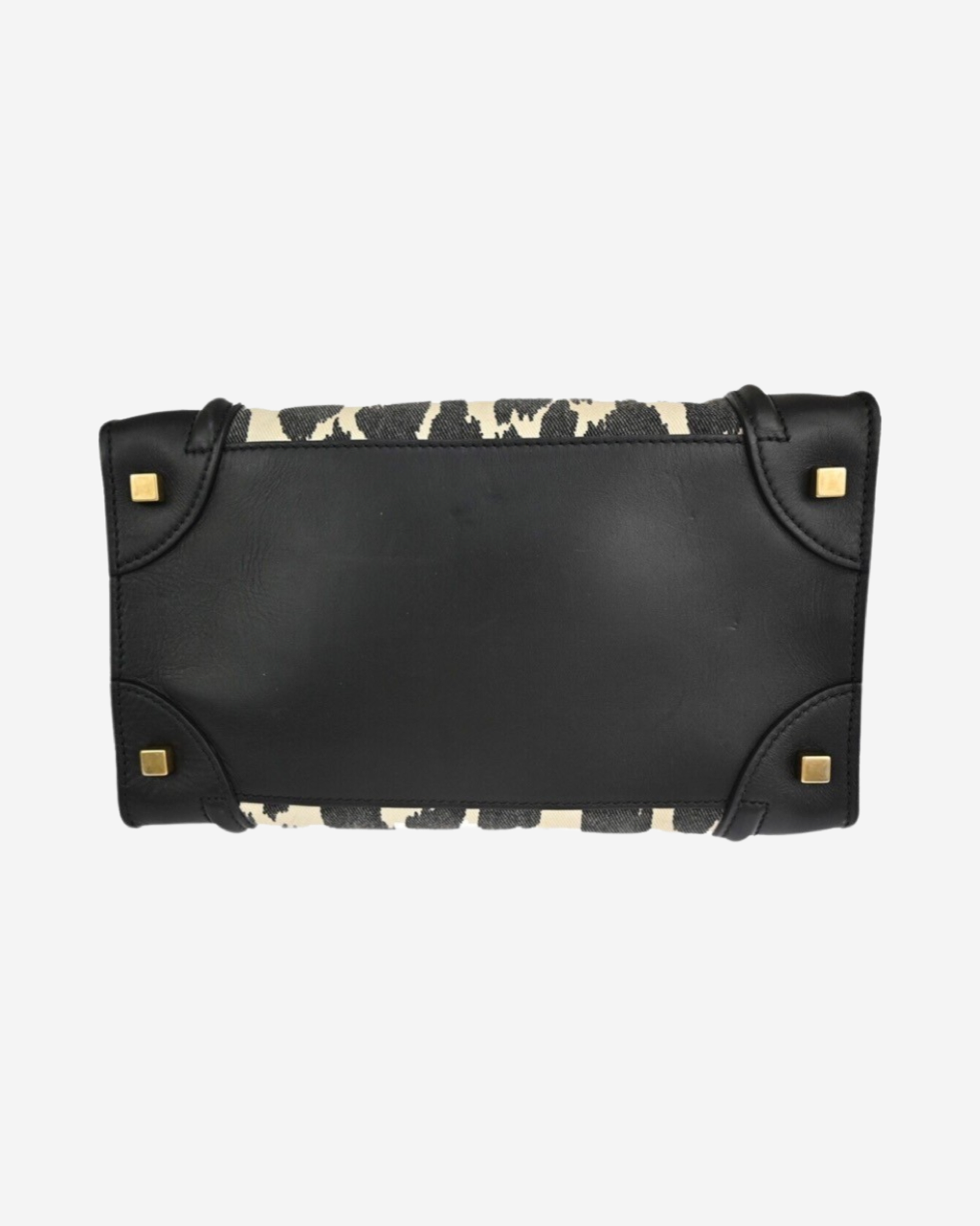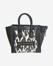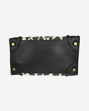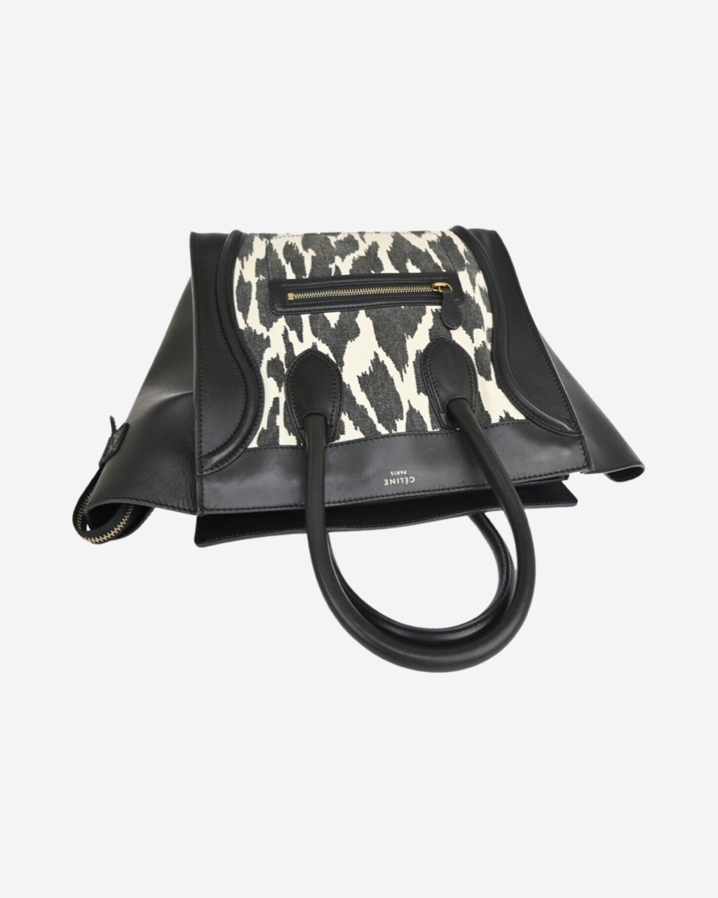 • Descripción: Bolsa de mano bicolor con diseño de animal print en el centro, doble asa, con cierre de cremallera, un bolsillo y dos planos interiores, un bolsillo exterior con cremallera en la parte delantera.