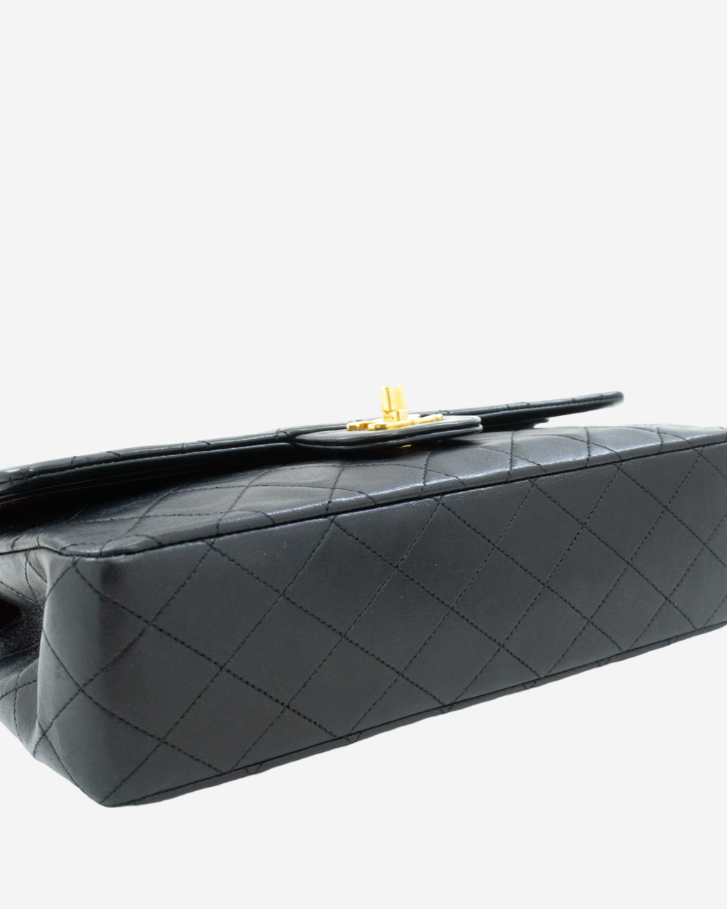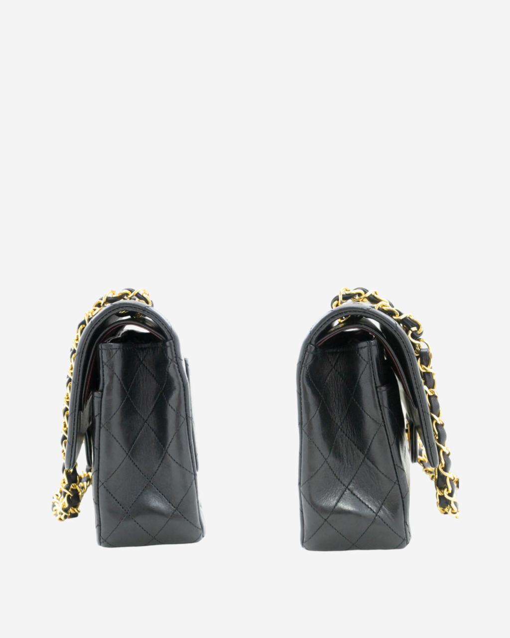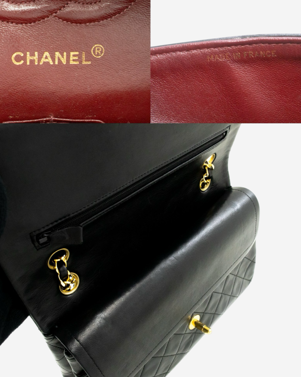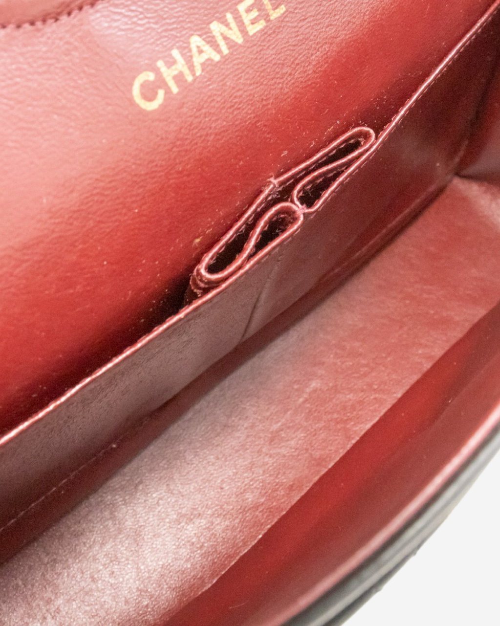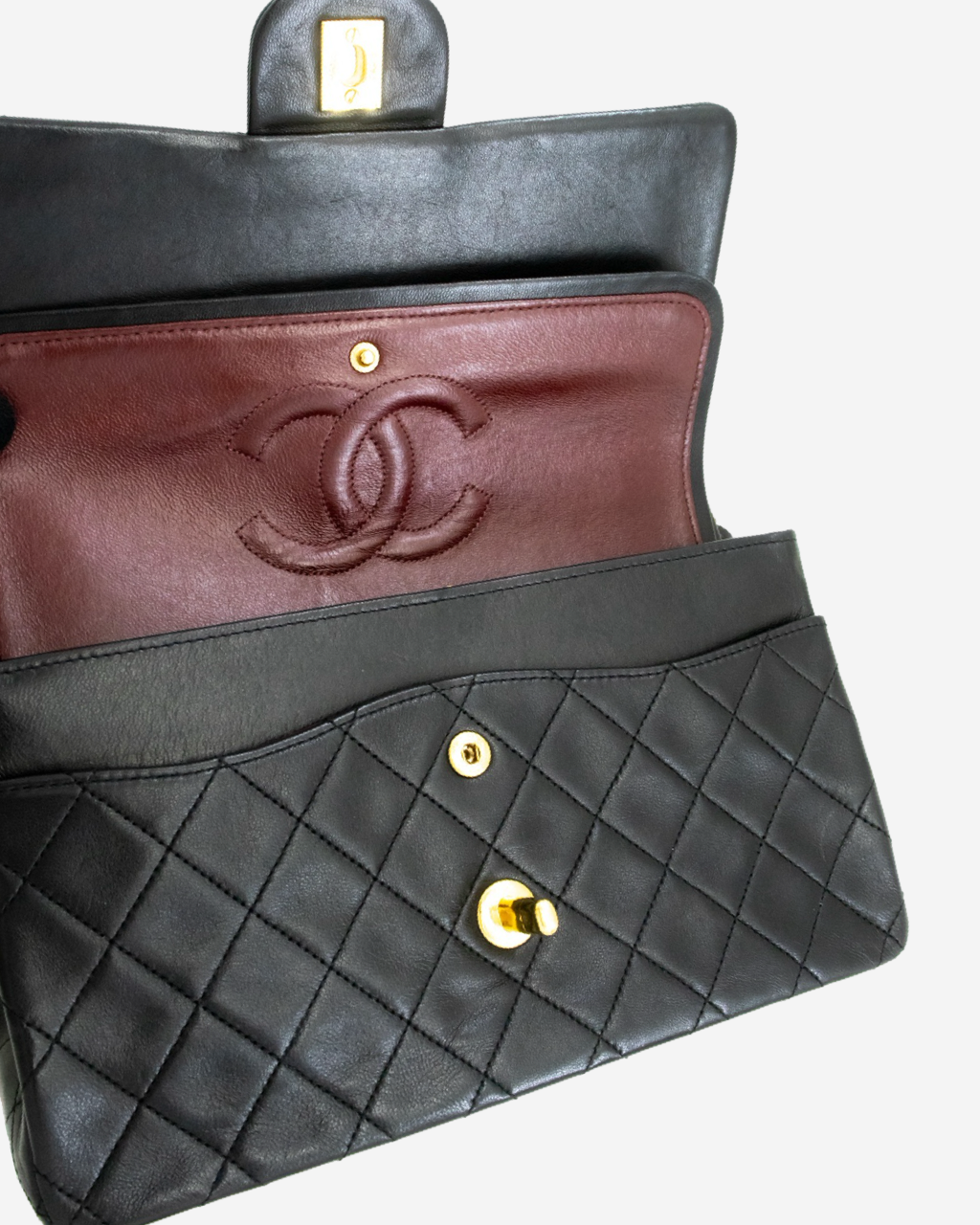 - Descripción: Bolsa de hombro en color negro, broche CC en baño de oro de 24k, interior en color vino, hardware color dorado