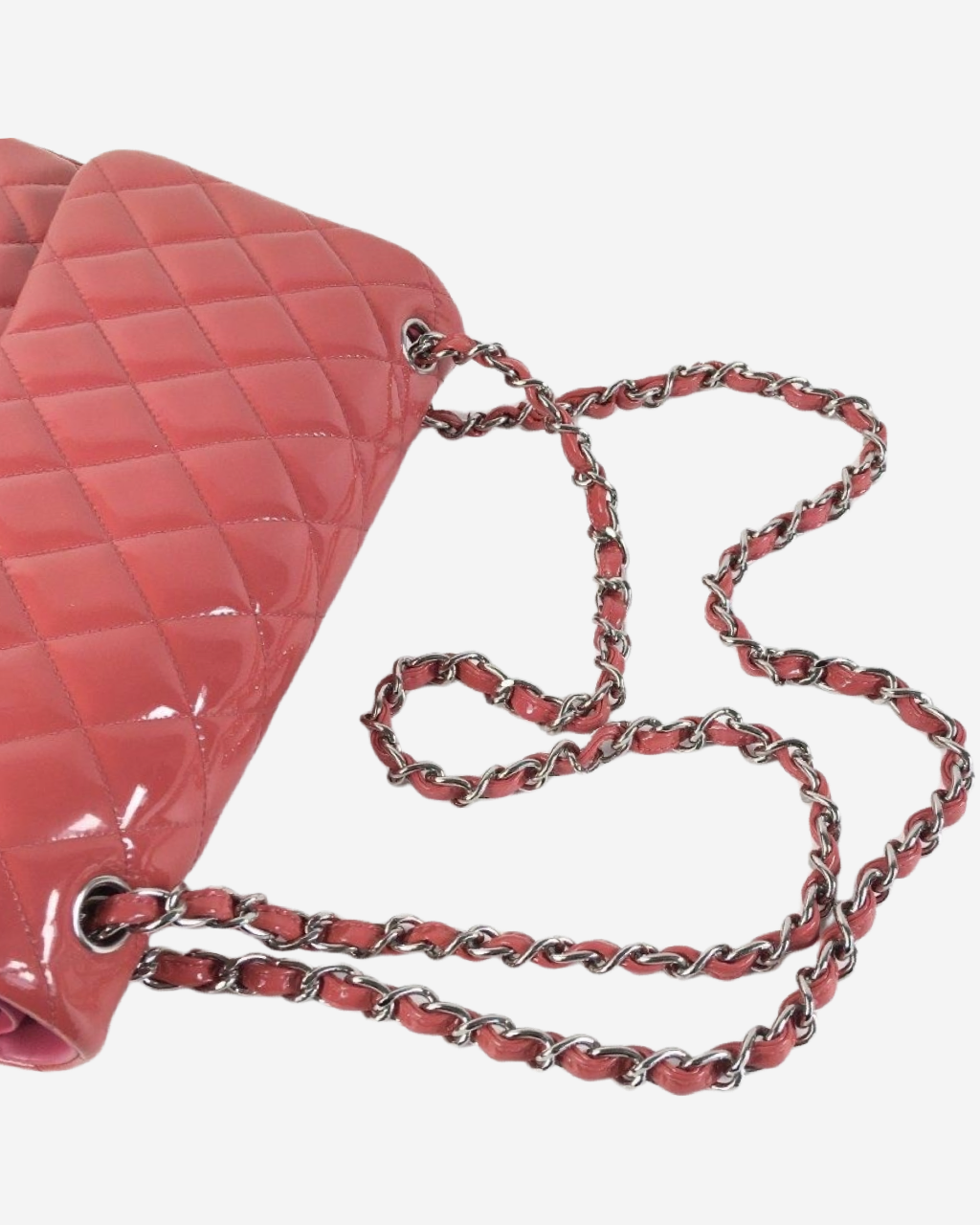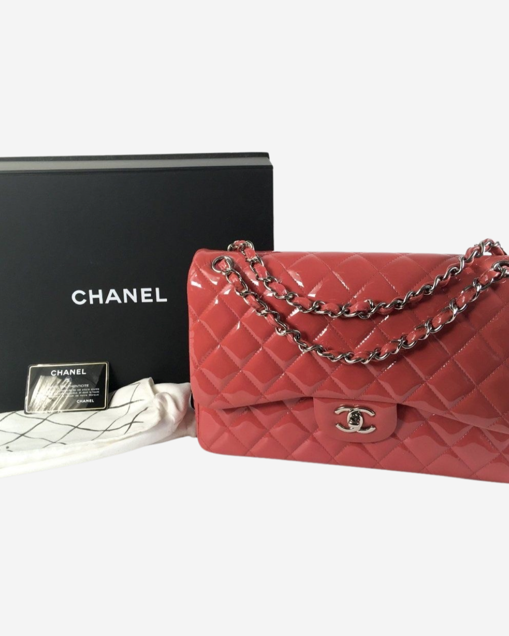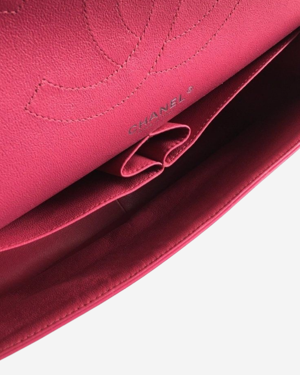 • Descripción: Bolsa Classic Double flap con correa de cadena, cierre giratorio con doble CC característico, con hardware en color plateado.