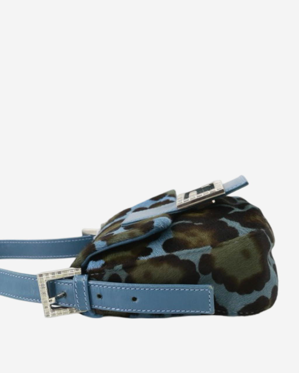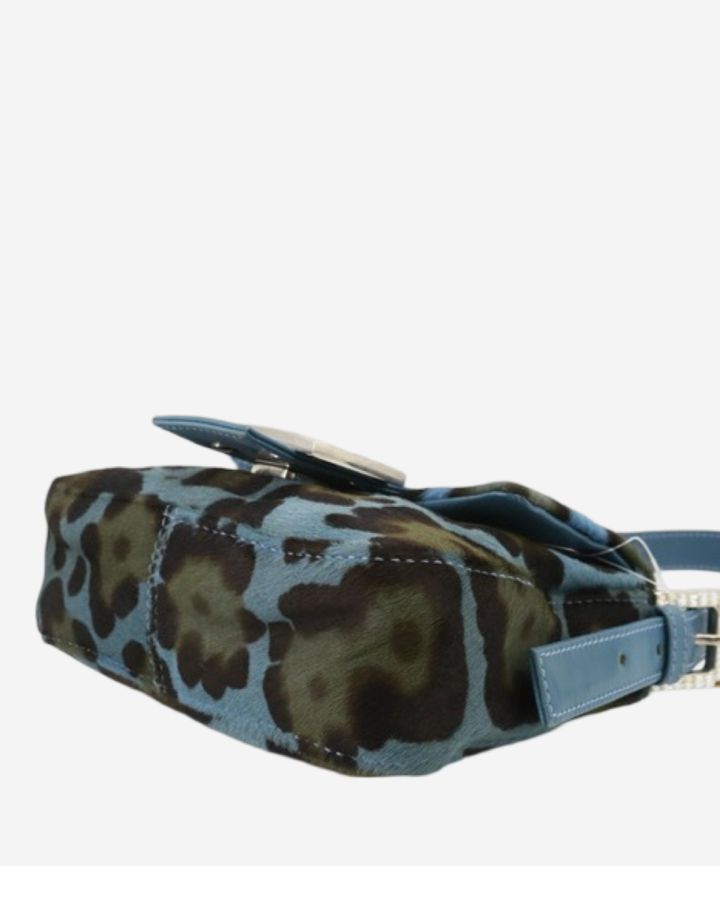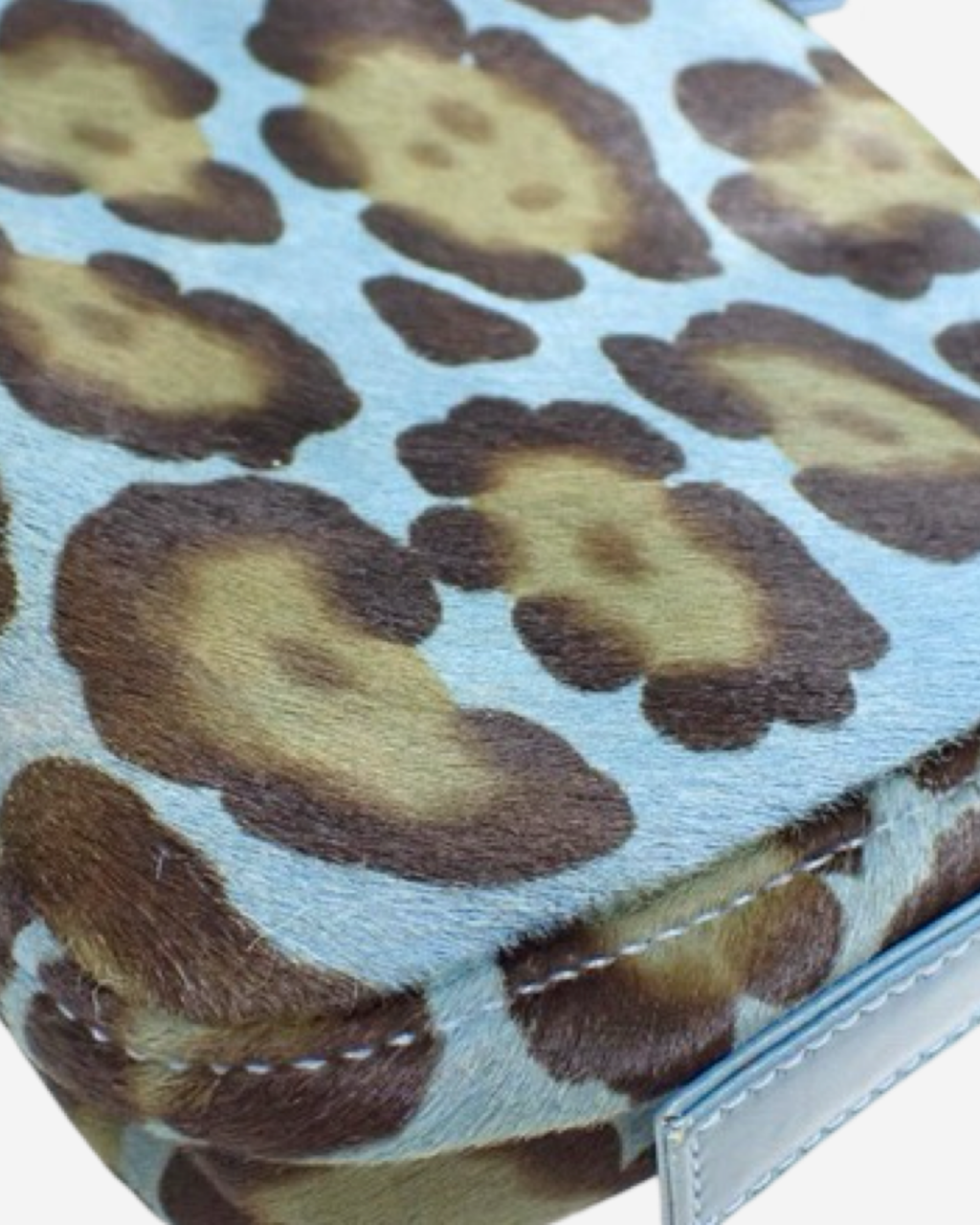 - Descripción: Bolsa fendi baguette mini en animal print fur color azul, broche FF frontal magnético con rhinestones, strap ajustable en piel, hardware color plateado