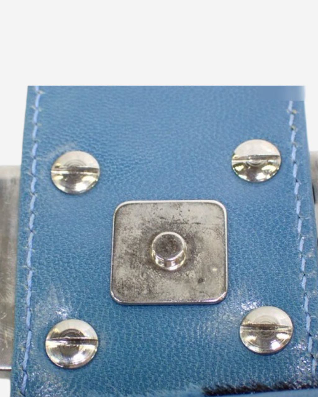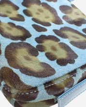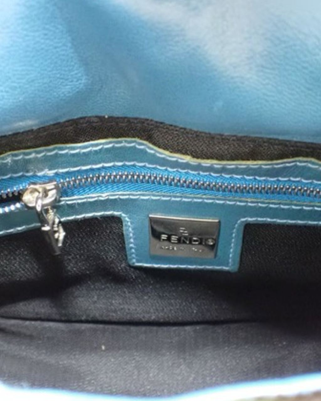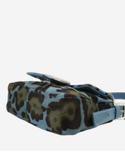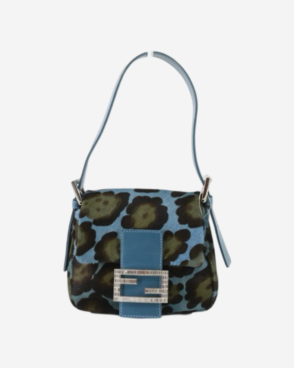 - Descripción: Bolsa fendi baguette mini en animal print fur color azul, broche FF frontal magnético con rhinestones, strap ajustable en piel, hardware color plateado