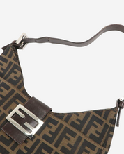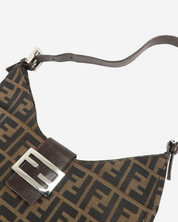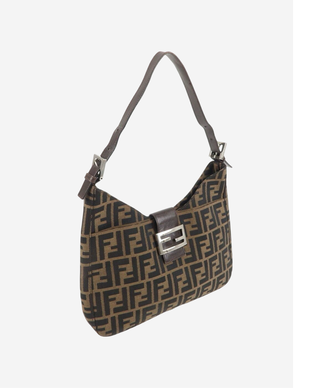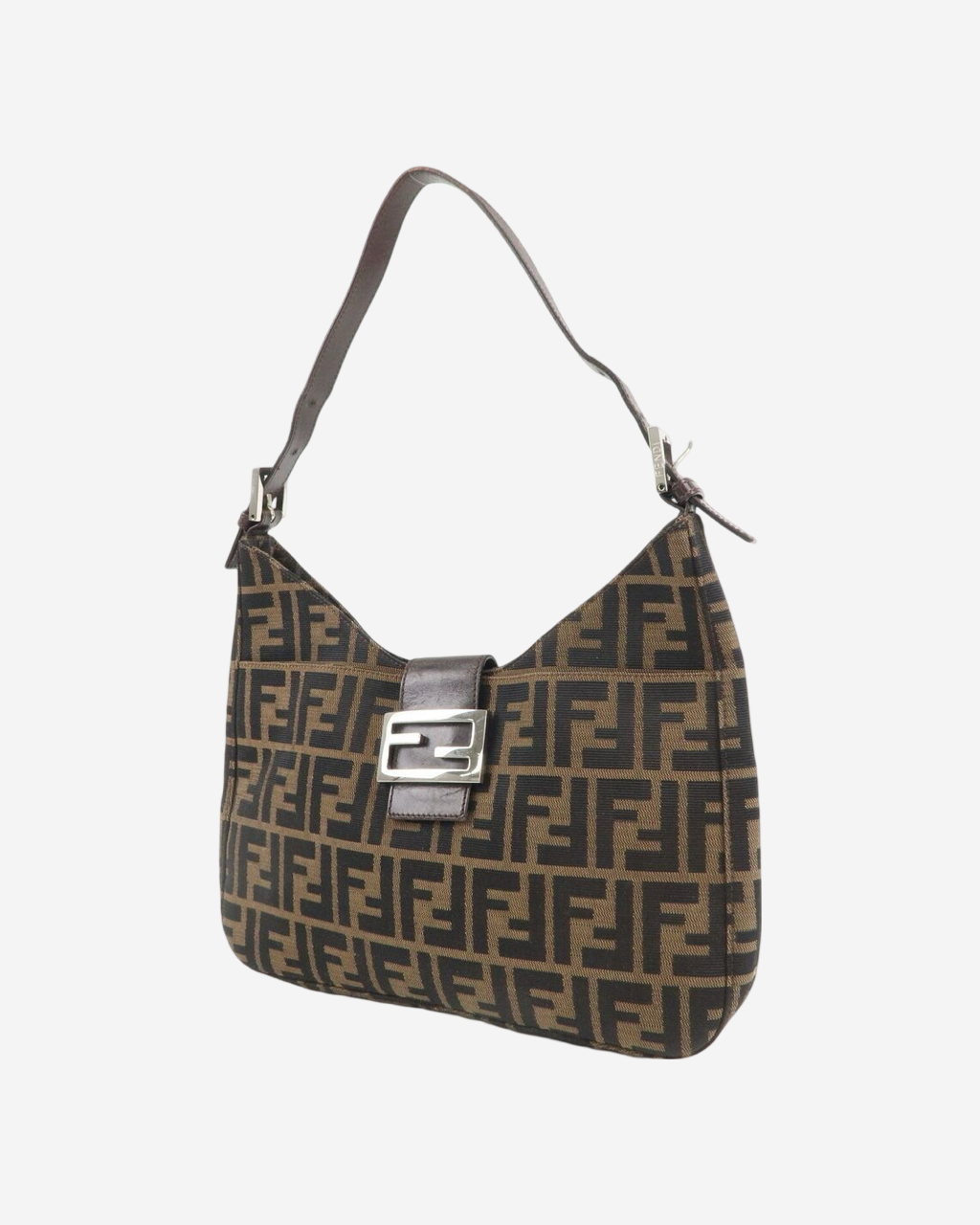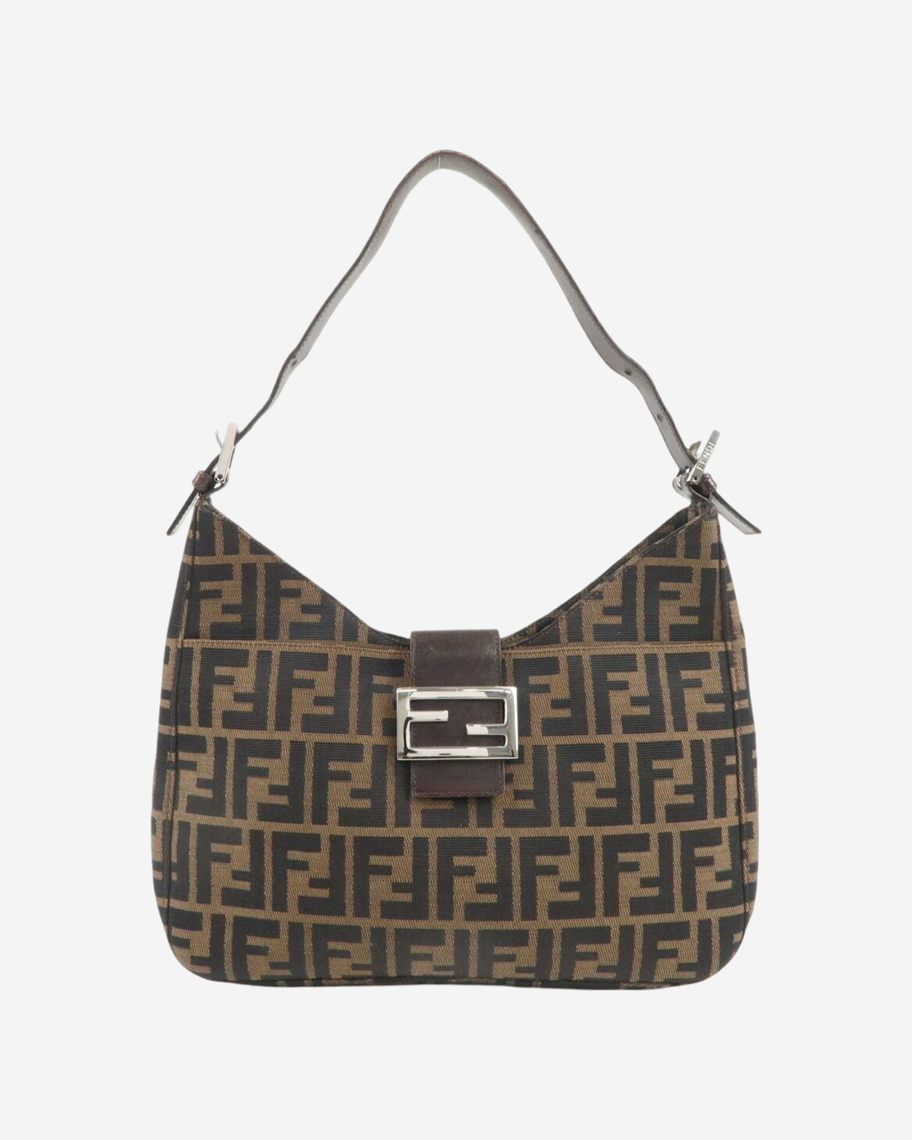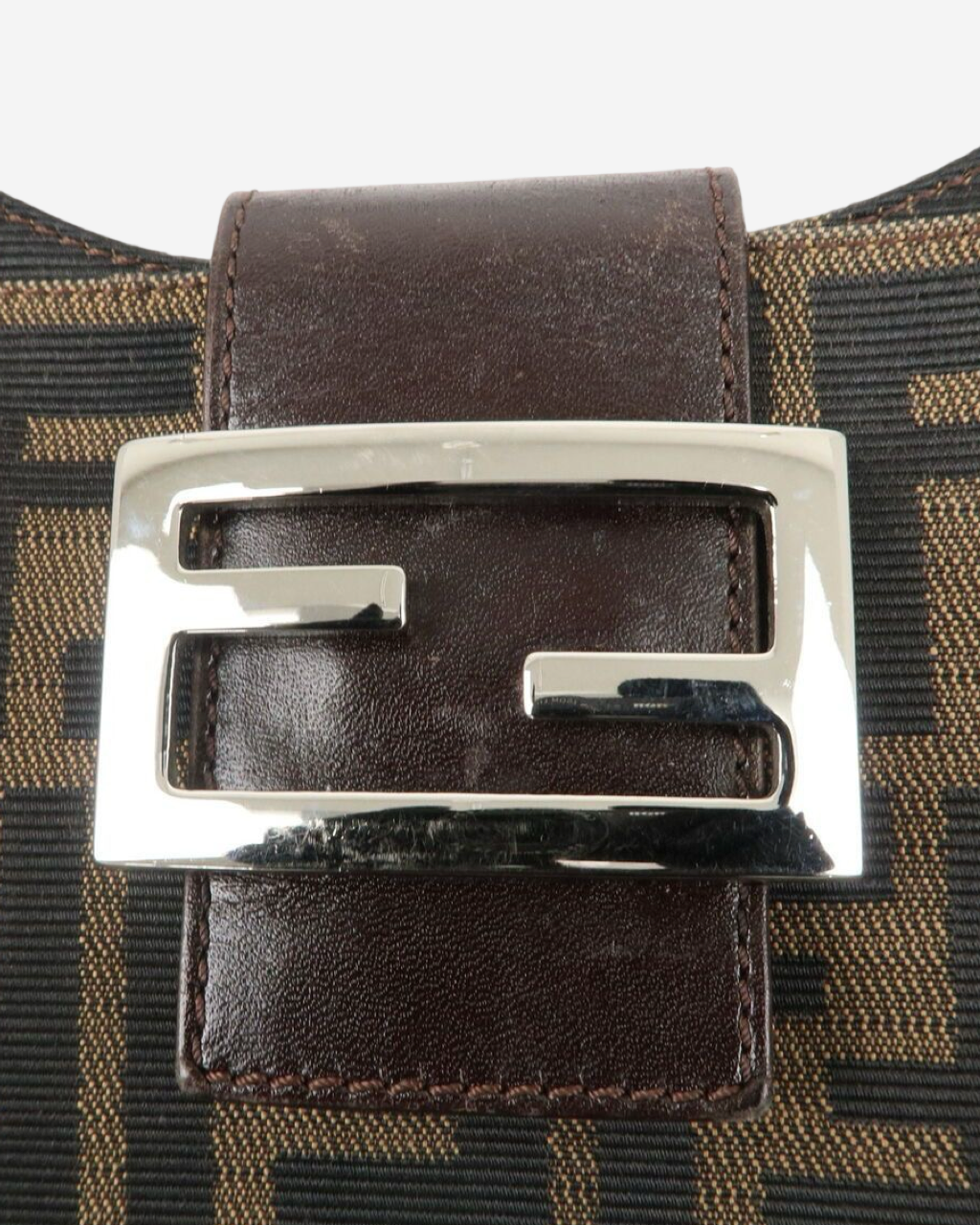 • Descripción: Bolso Baguette en canvas Zucca con broche frontal magnético, asa de hombro en piel, abertura principal con cierre en bolsillo interior, hardware en color plateado