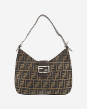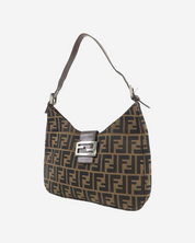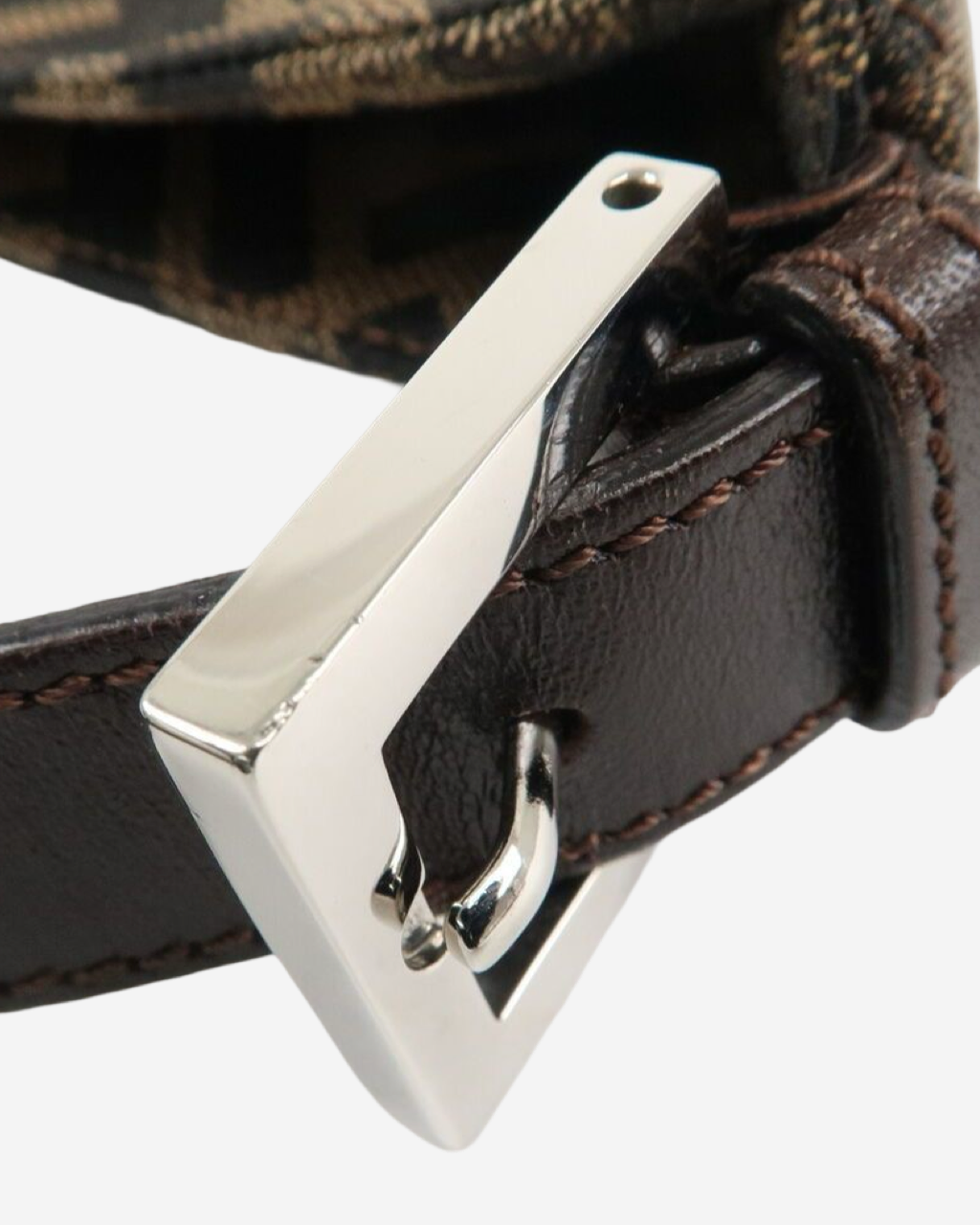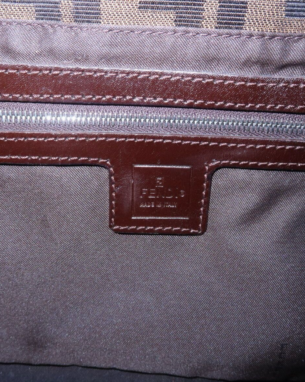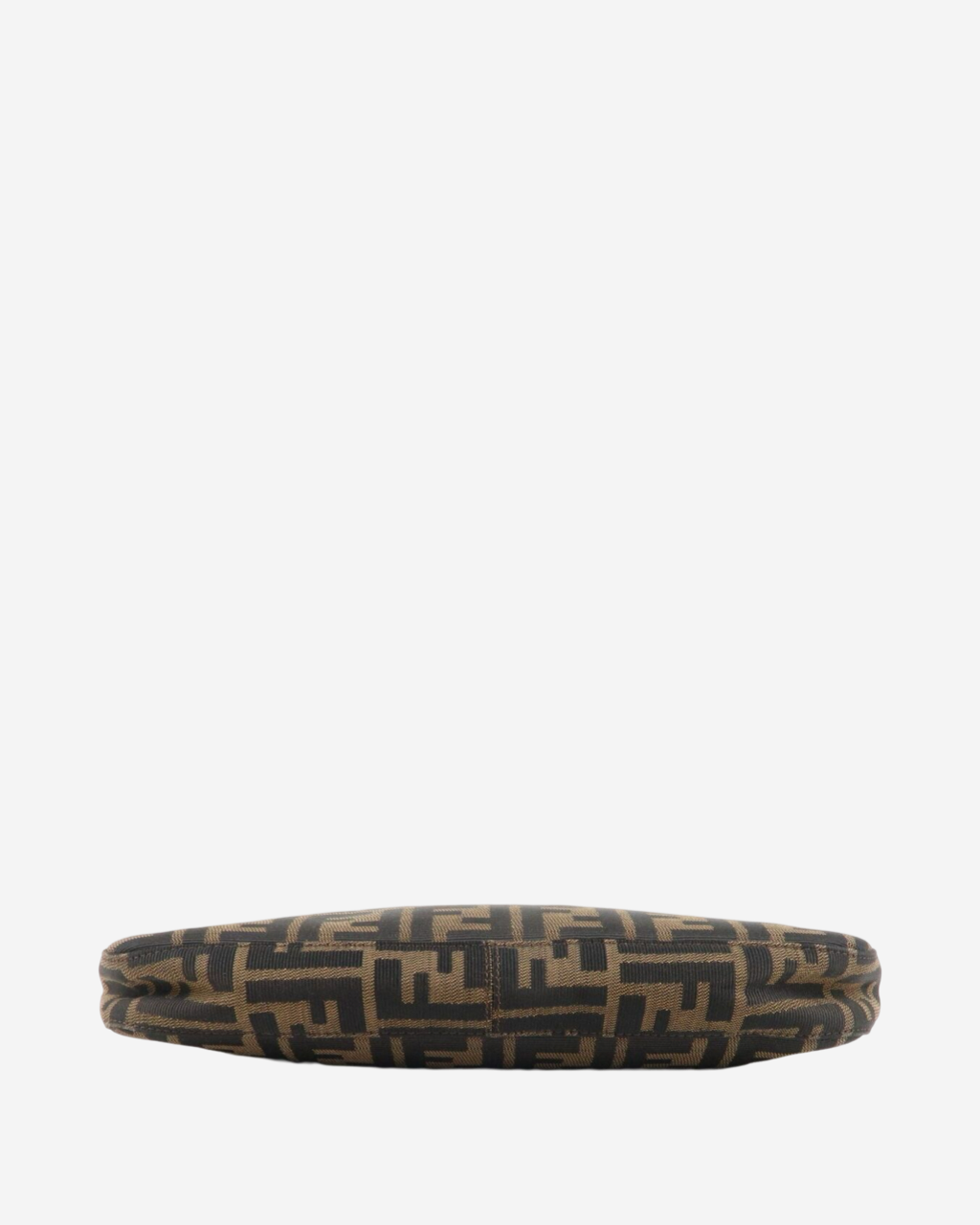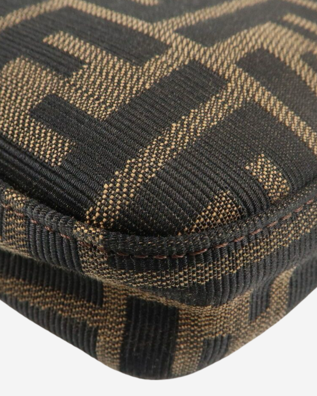 • Descripción: Bolso Baguette en canvas Zucca con broche frontal magnético, asa de hombro en piel, abertura principal con cierre en bolsillo interior, hardware en color plateado
