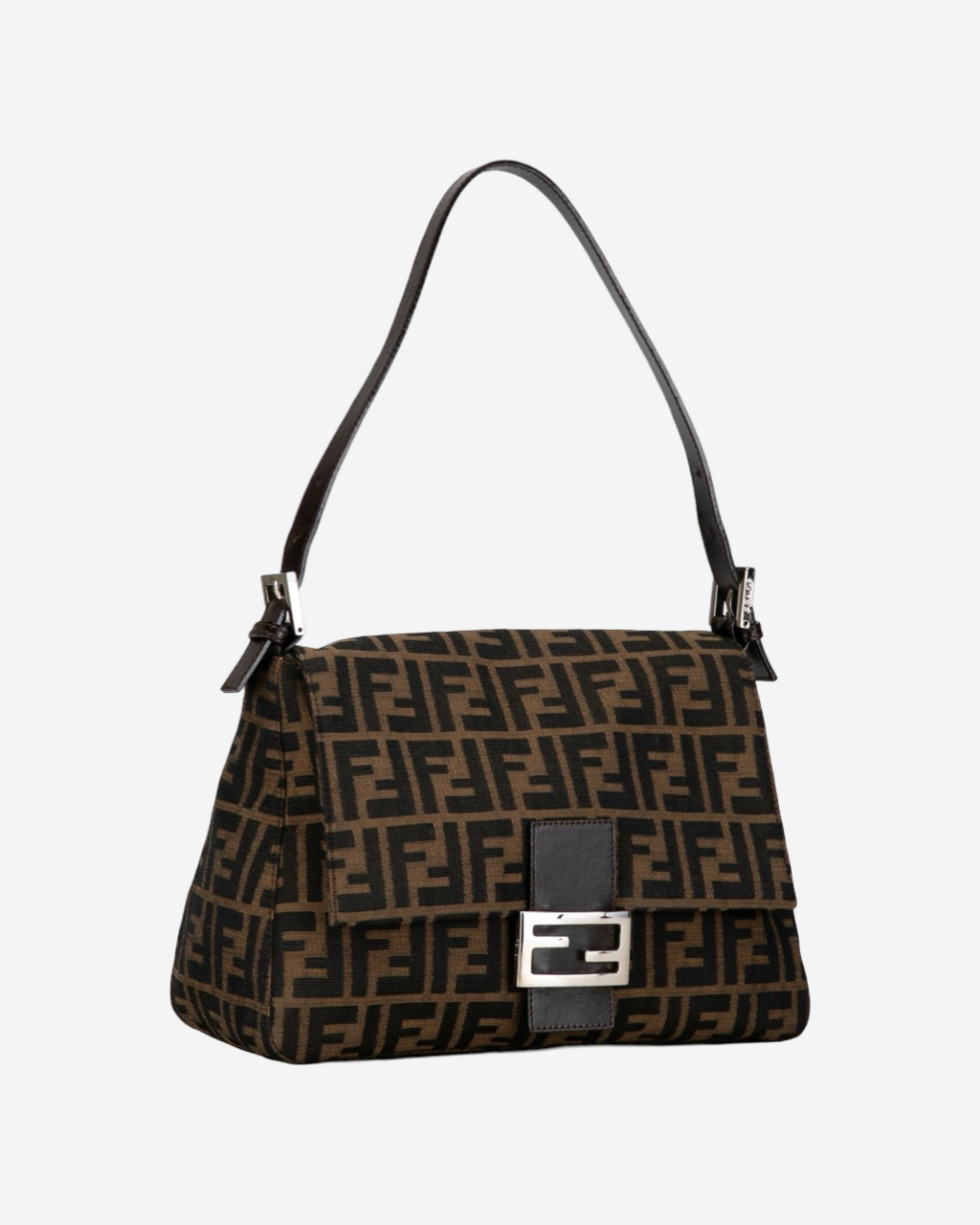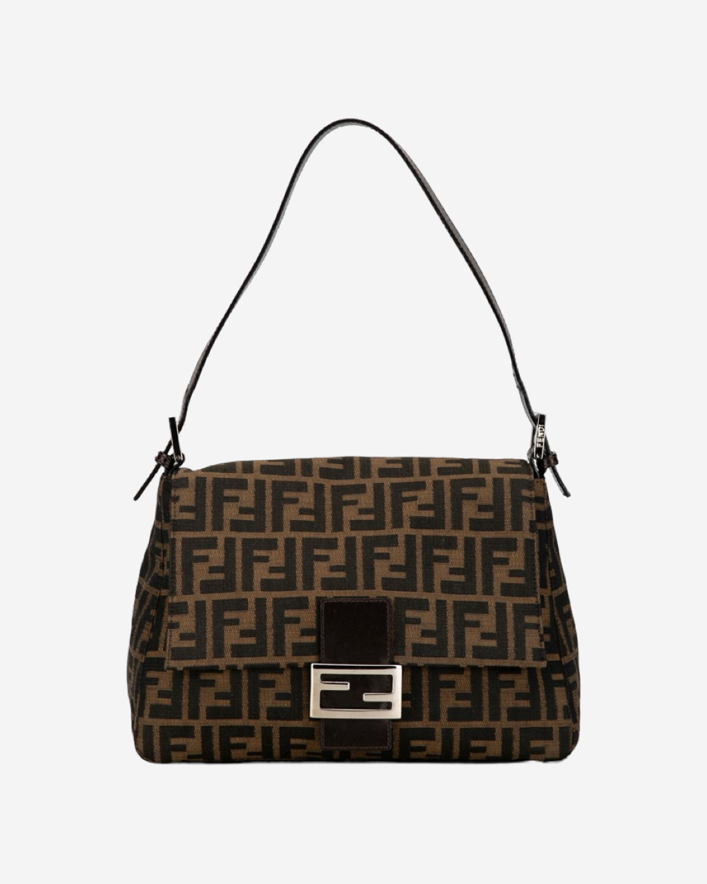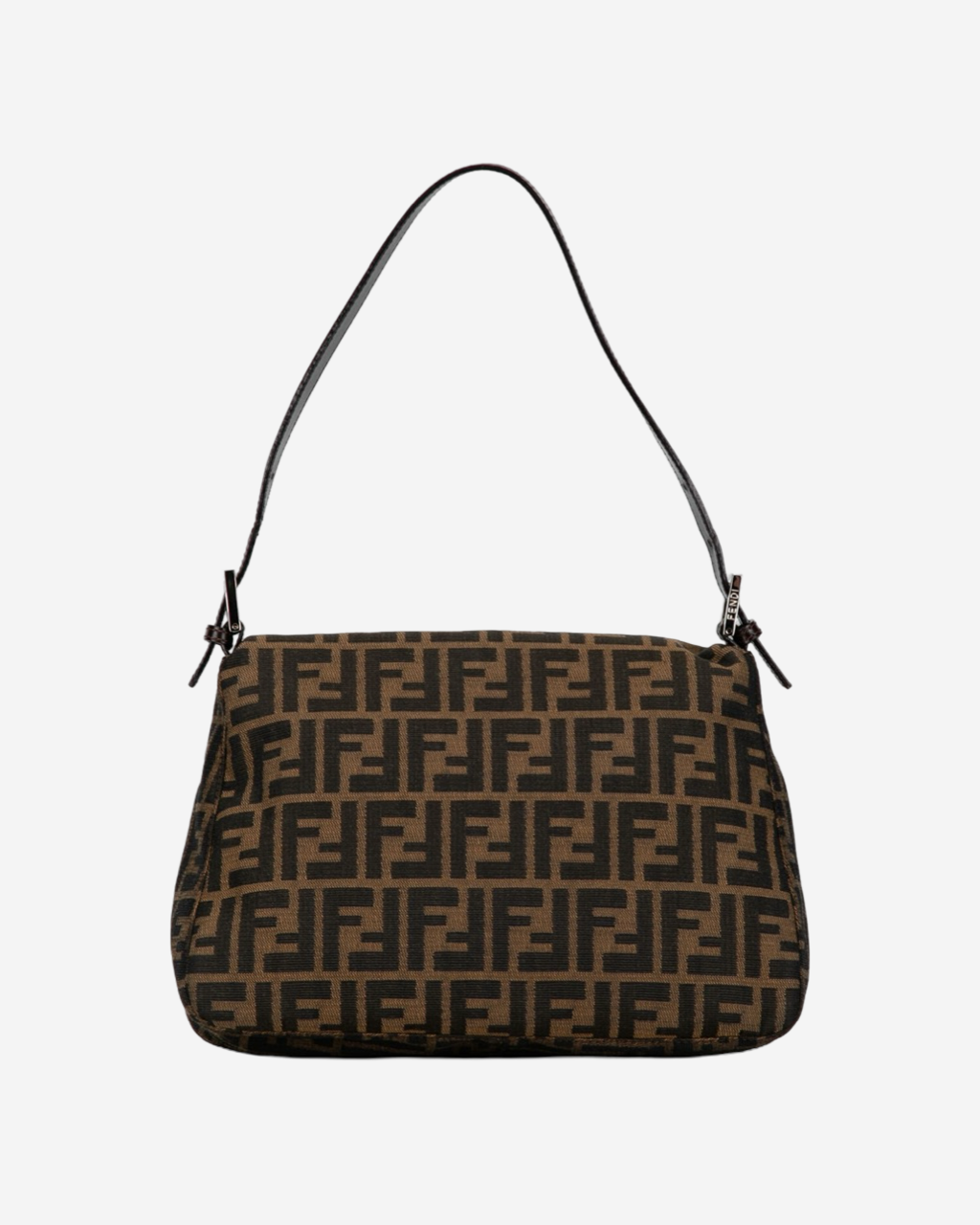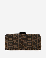 - Descripción: Bolsa Fendi Baguette en canvas color café, broche FF frontal característico, asa fija con cadena y piel, abertura con solapa, forro interior en color negro, hardware color dorado