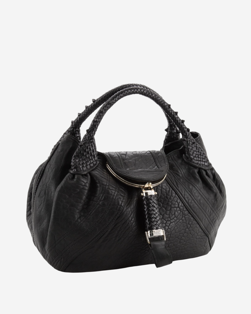 - Descripción: Bolsa de hombro con doble asa fija, broche frontal, abertura con solapa, forro interior textil, hardware color plateado