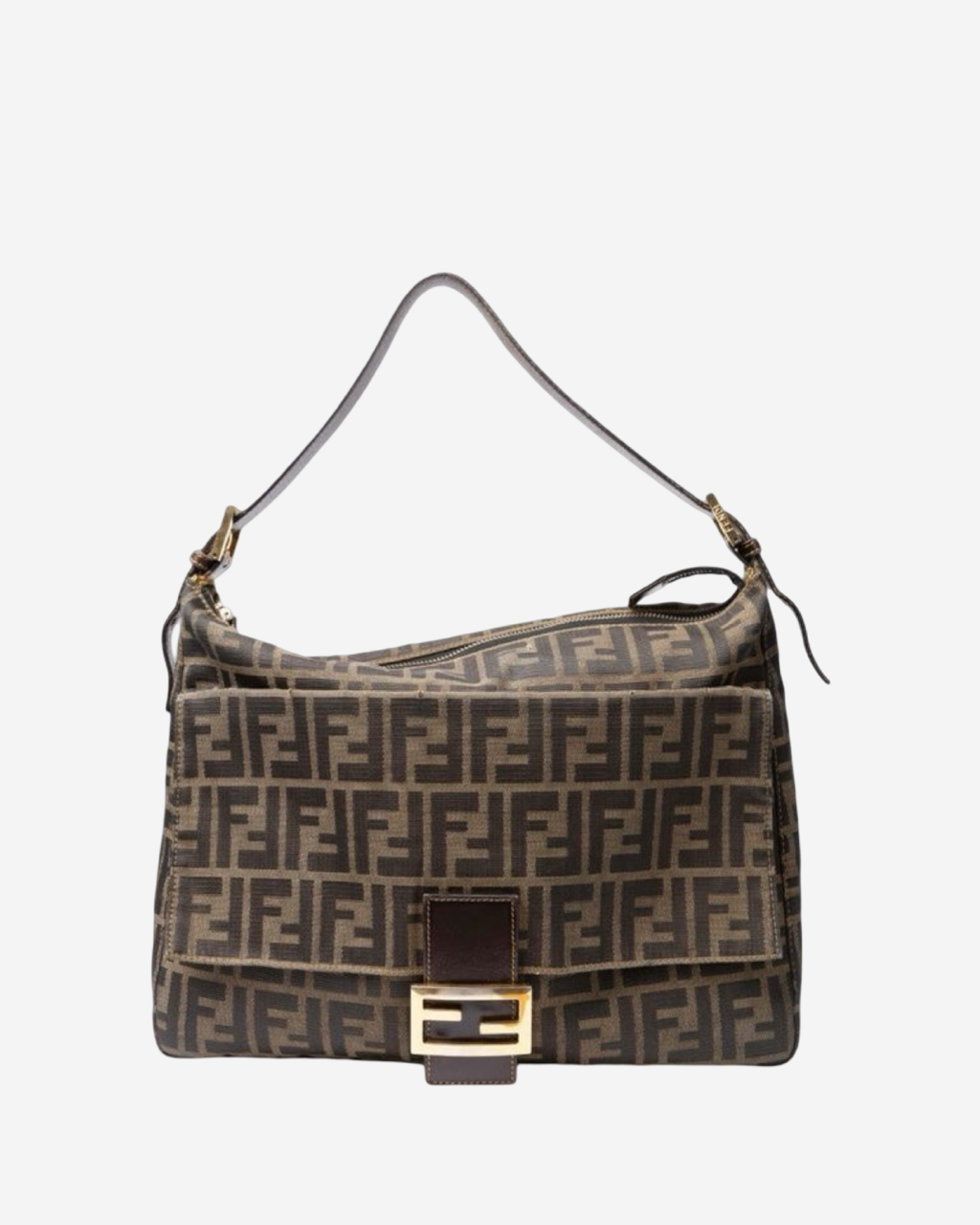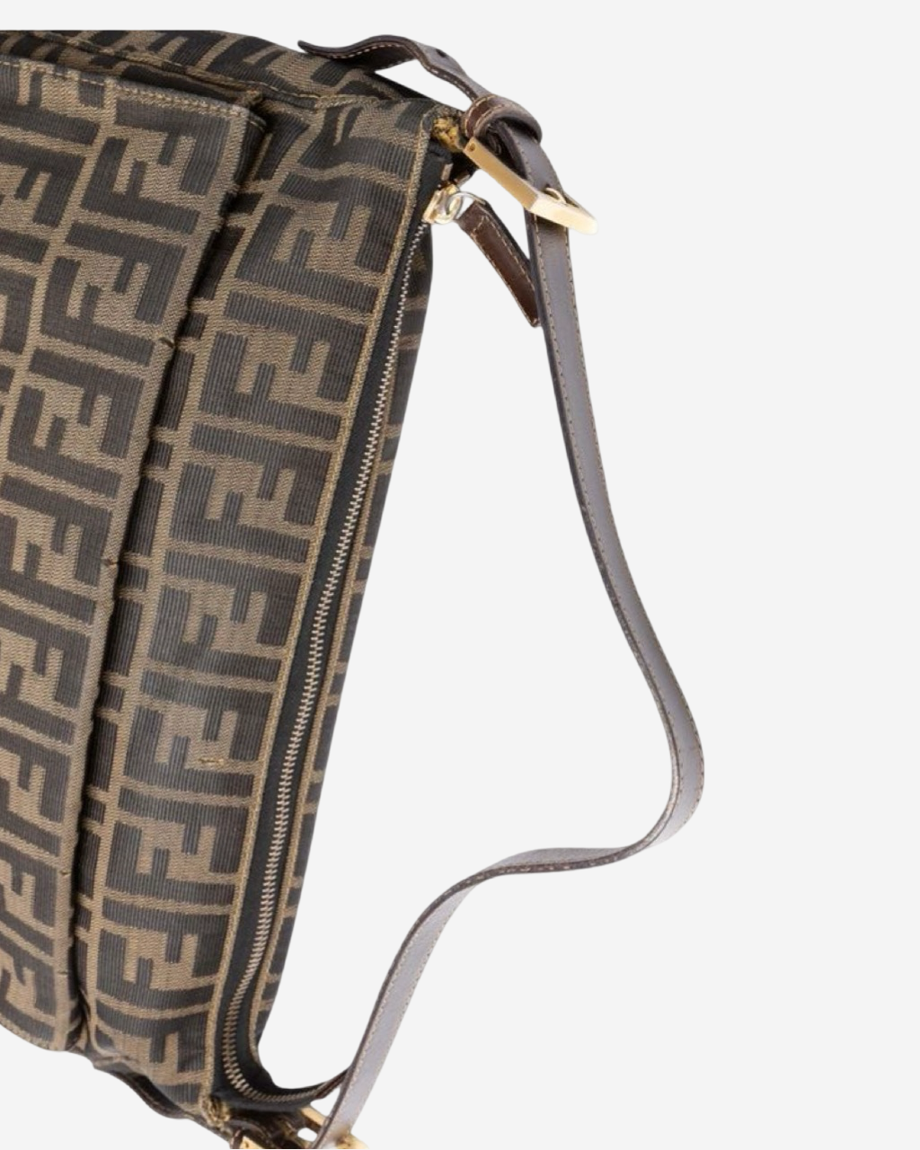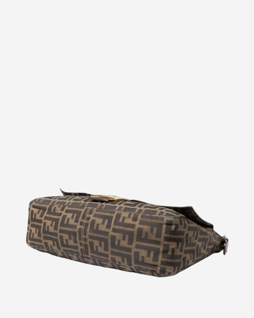 - Descripción: Bolso en canvas FF, broche frontal magnético, asa de hombro en piel, abertura principal con cierre interior, hardware en color dorado
