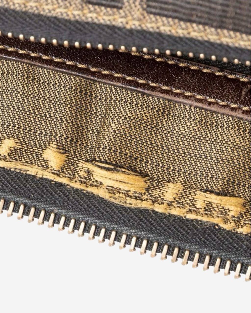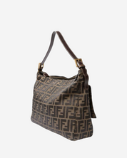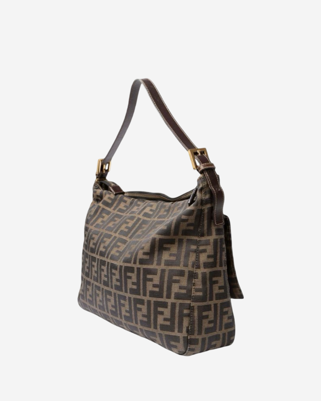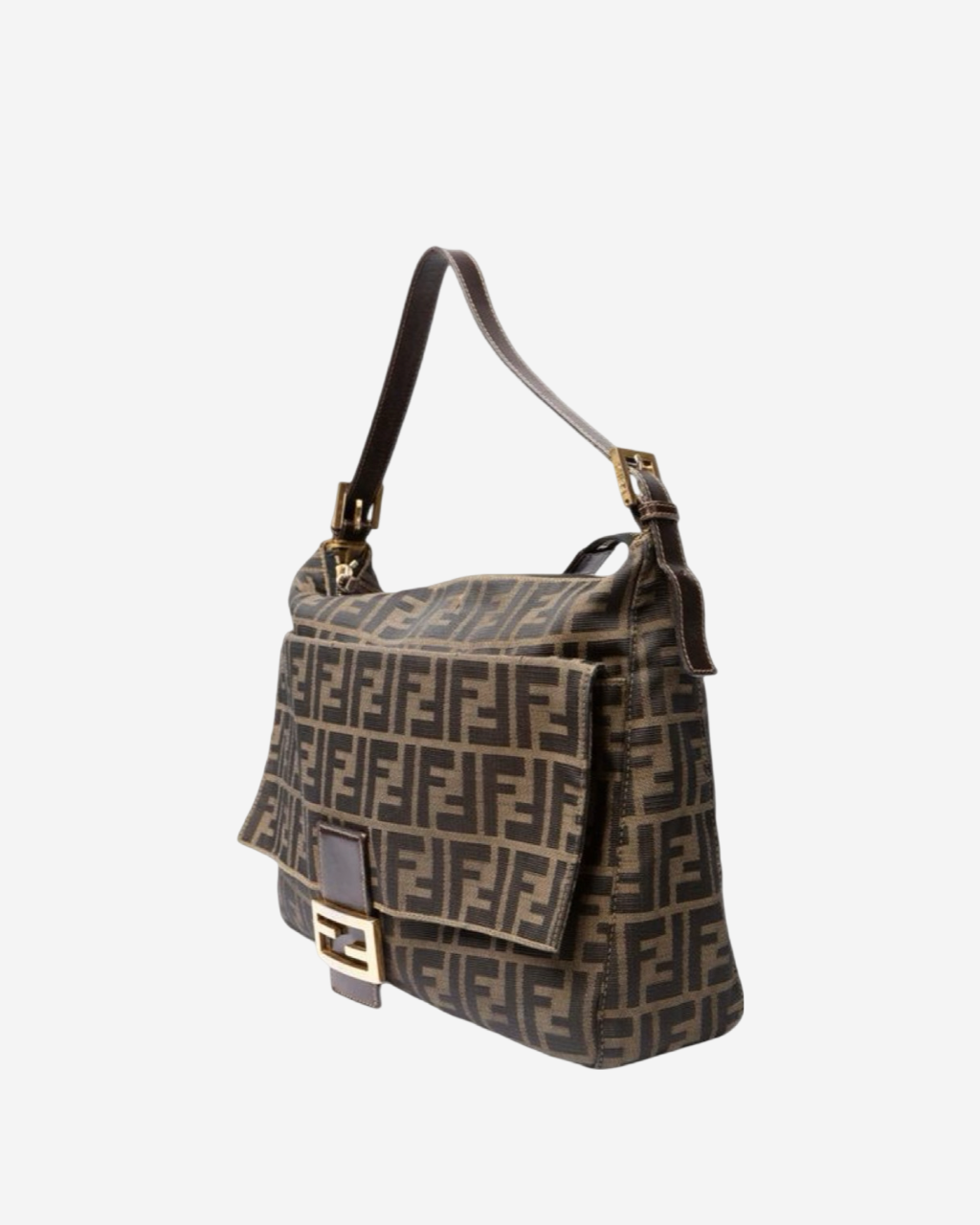 - Descripción: Bolso en canvas FF, broche frontal magnético, asa de hombro en piel, abertura principal con cierre interior, hardware en color dorado
