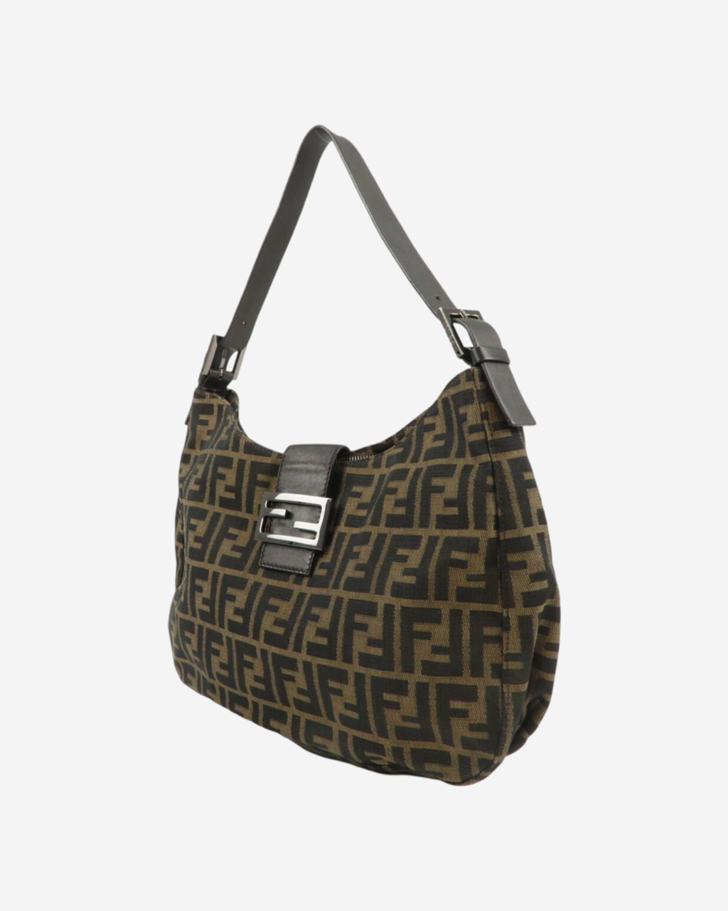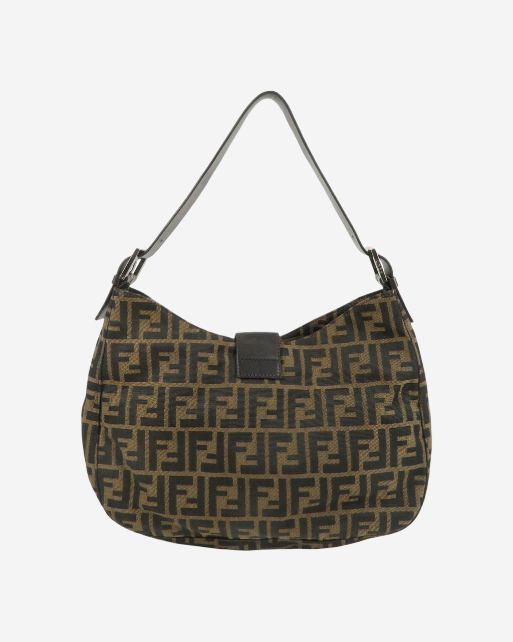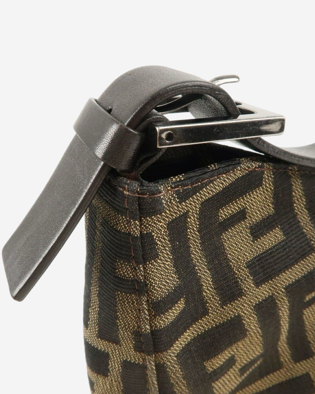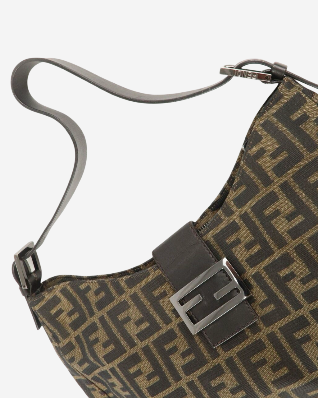 - Descripción: Bolso de hombro en canvas zucca con asa fija, abertura principal abierta, broche FF magnético, hardware color plateado