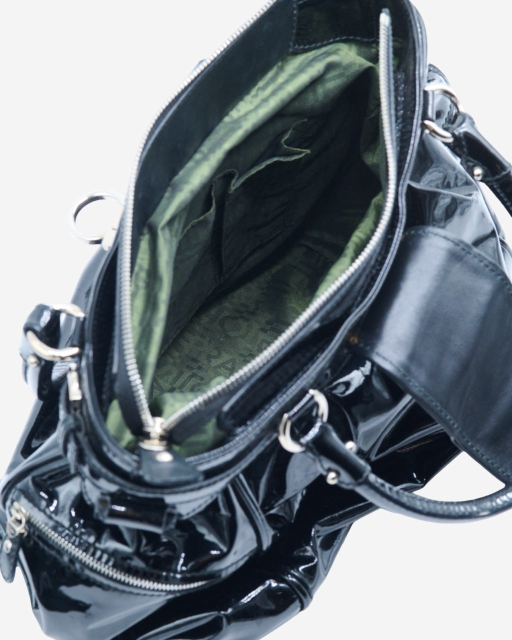 • Descripción: Bolsa de hombro en charol color negro, abertura con broche frontal, cierre al tope, doble asa fija, forro interior textil con bolsillo, hardware en tono plateado