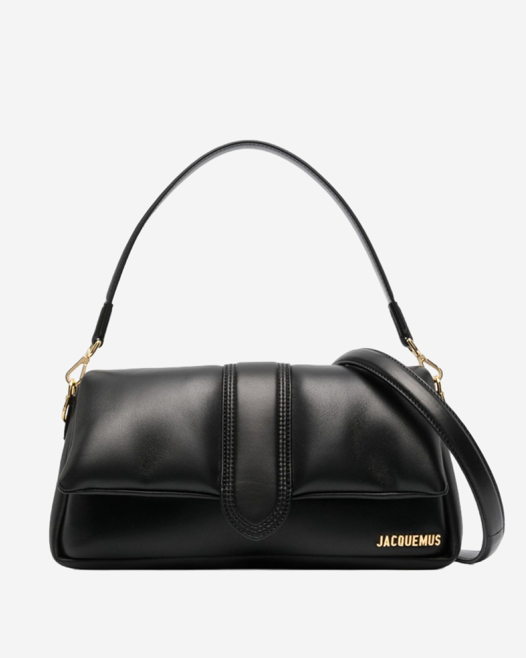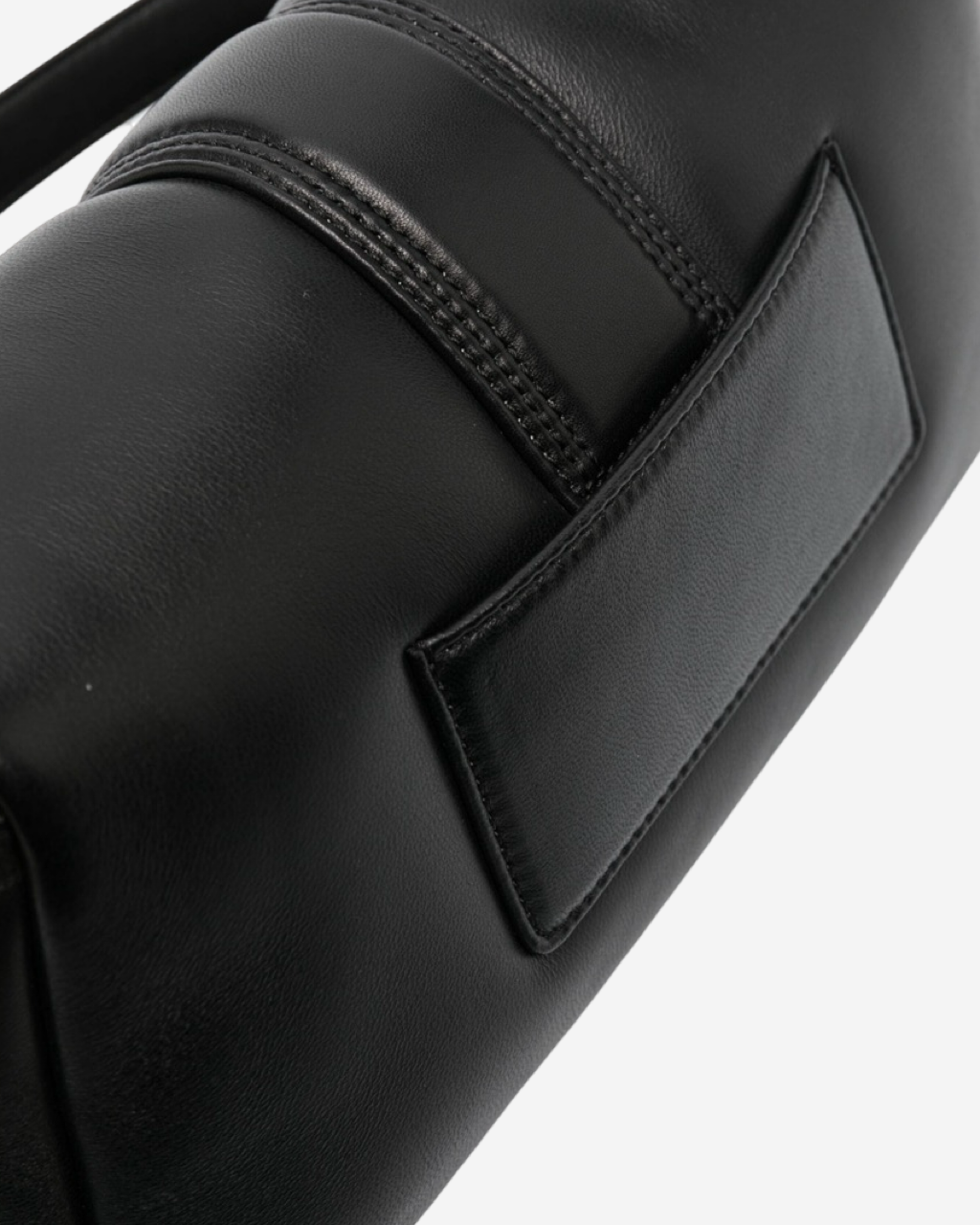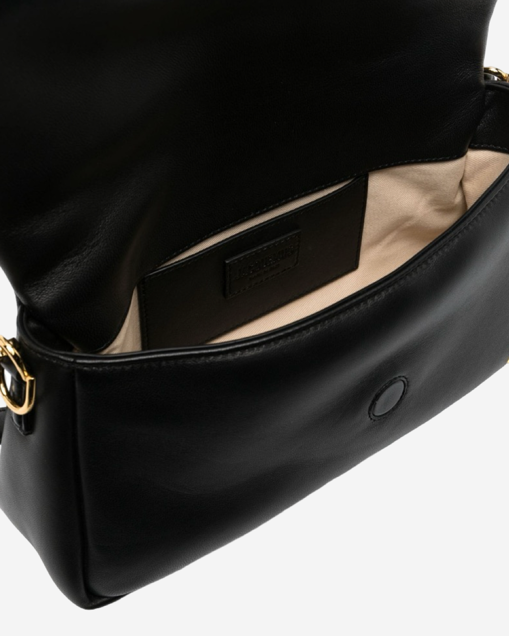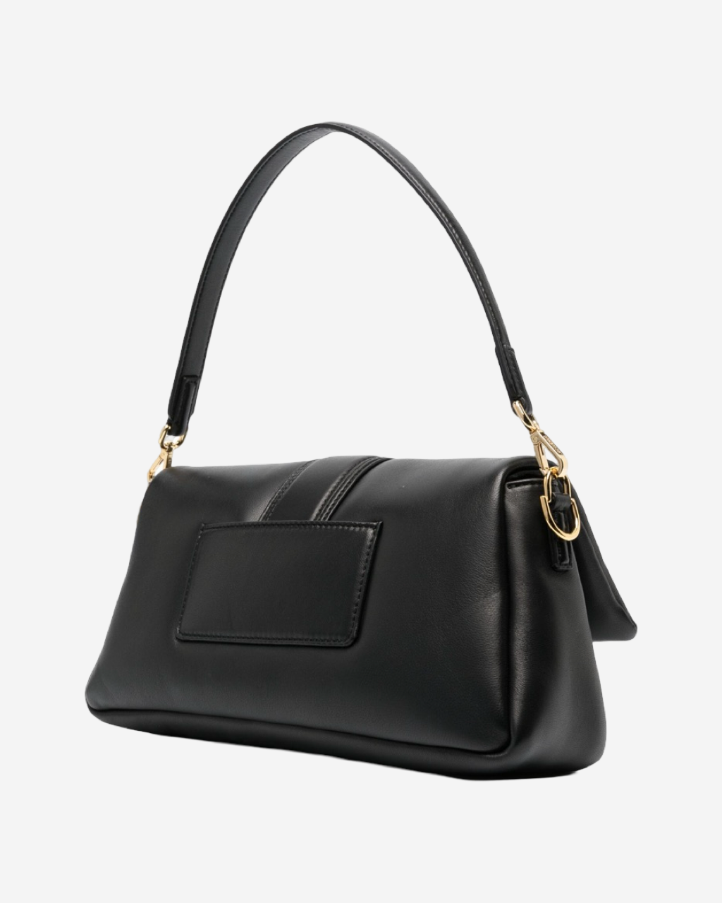 - Descripción: Bolsa de hombro en piel color negro, strap desmontable, placa logo característica, abertura con solapa, hardware color plateado