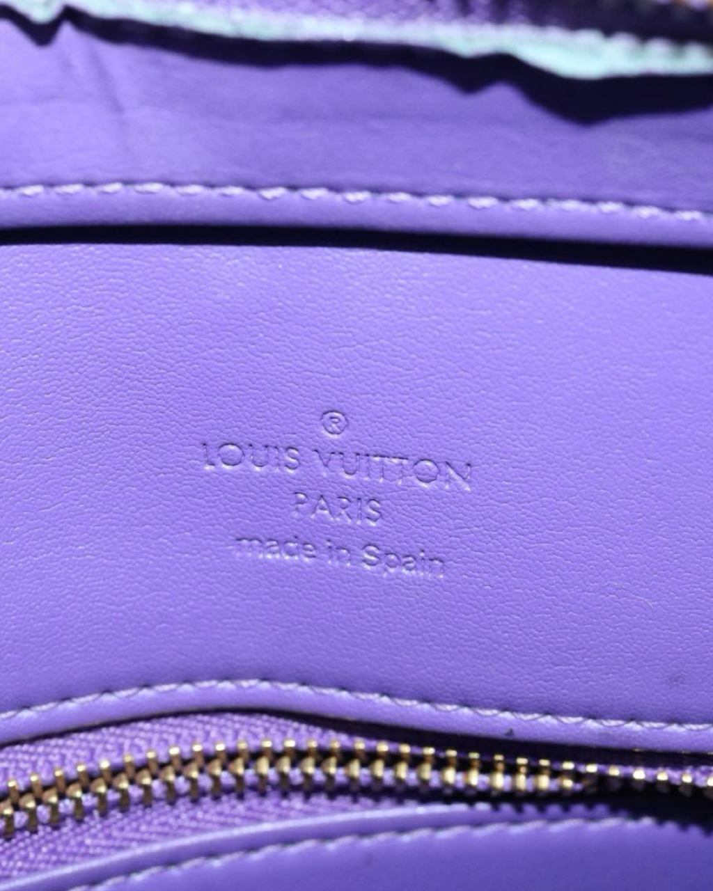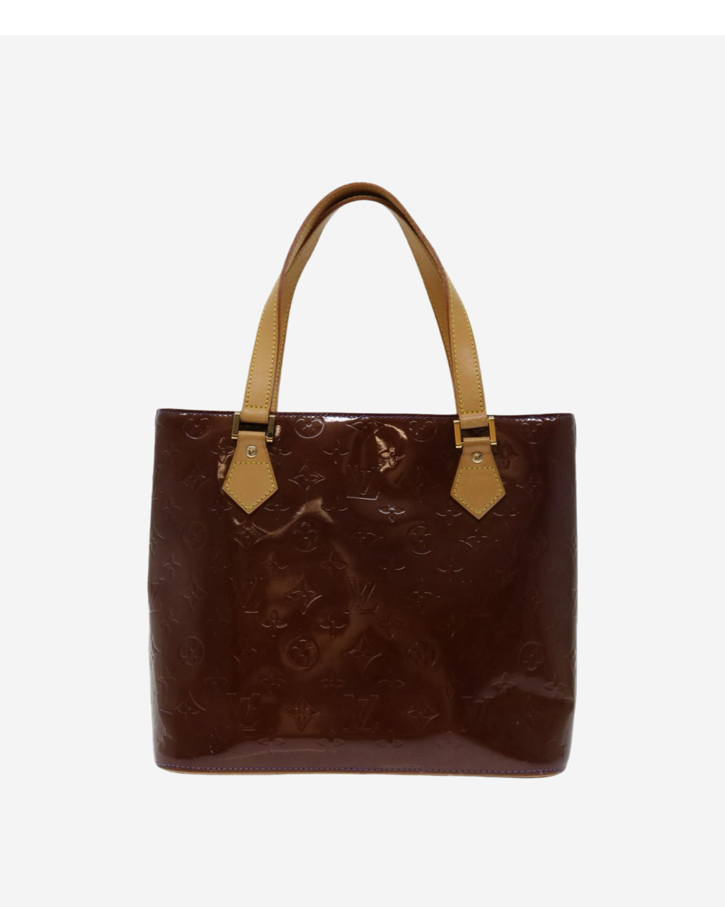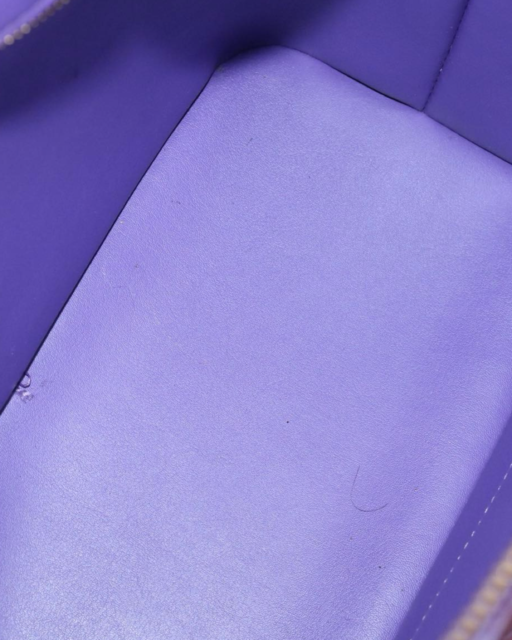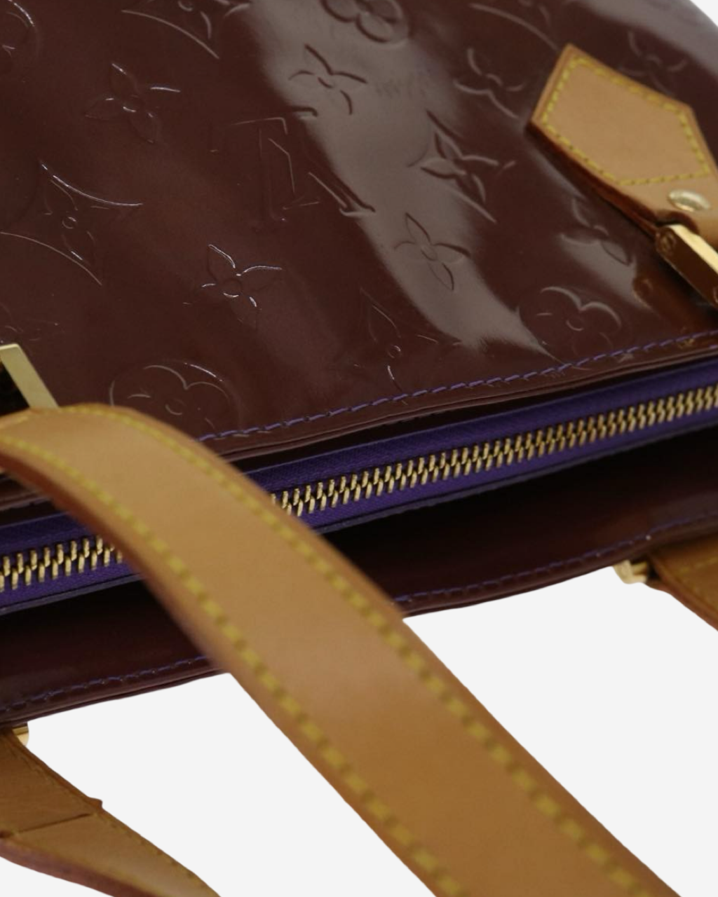 - Descripción: Bolso hombro en piel vernis, doble asa fija, abertura principal con cierre, interior en piel color morado, hardware dorado