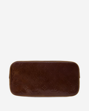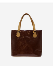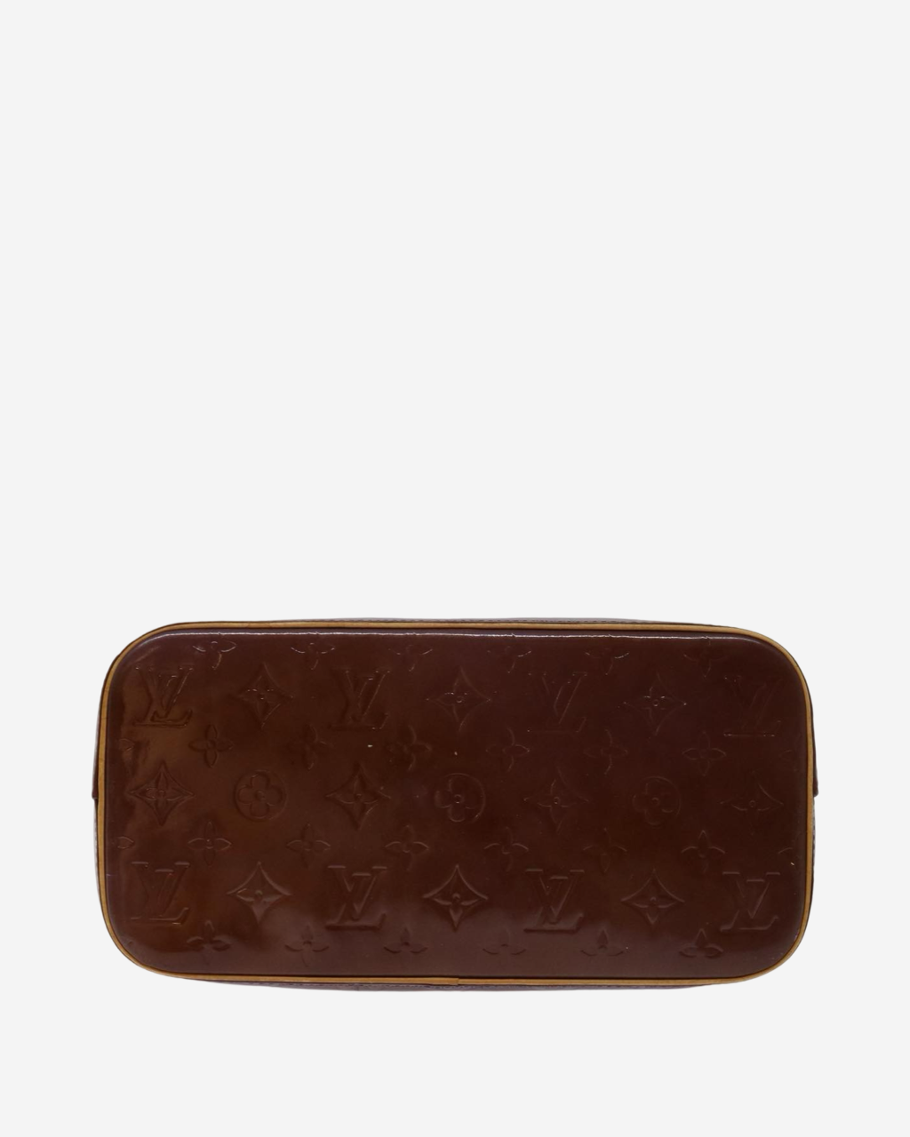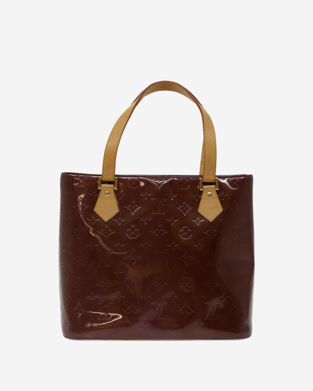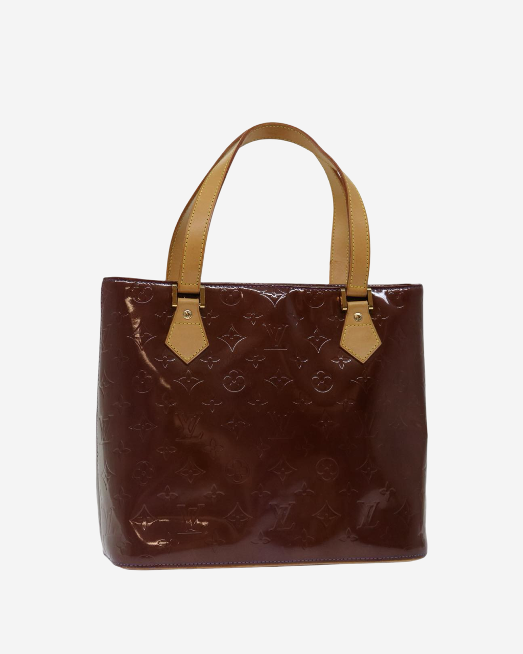 - Descripción: Bolso hombro en piel vernis, doble asa fija, abertura principal con cierre, interior en piel color morado, hardware dorado