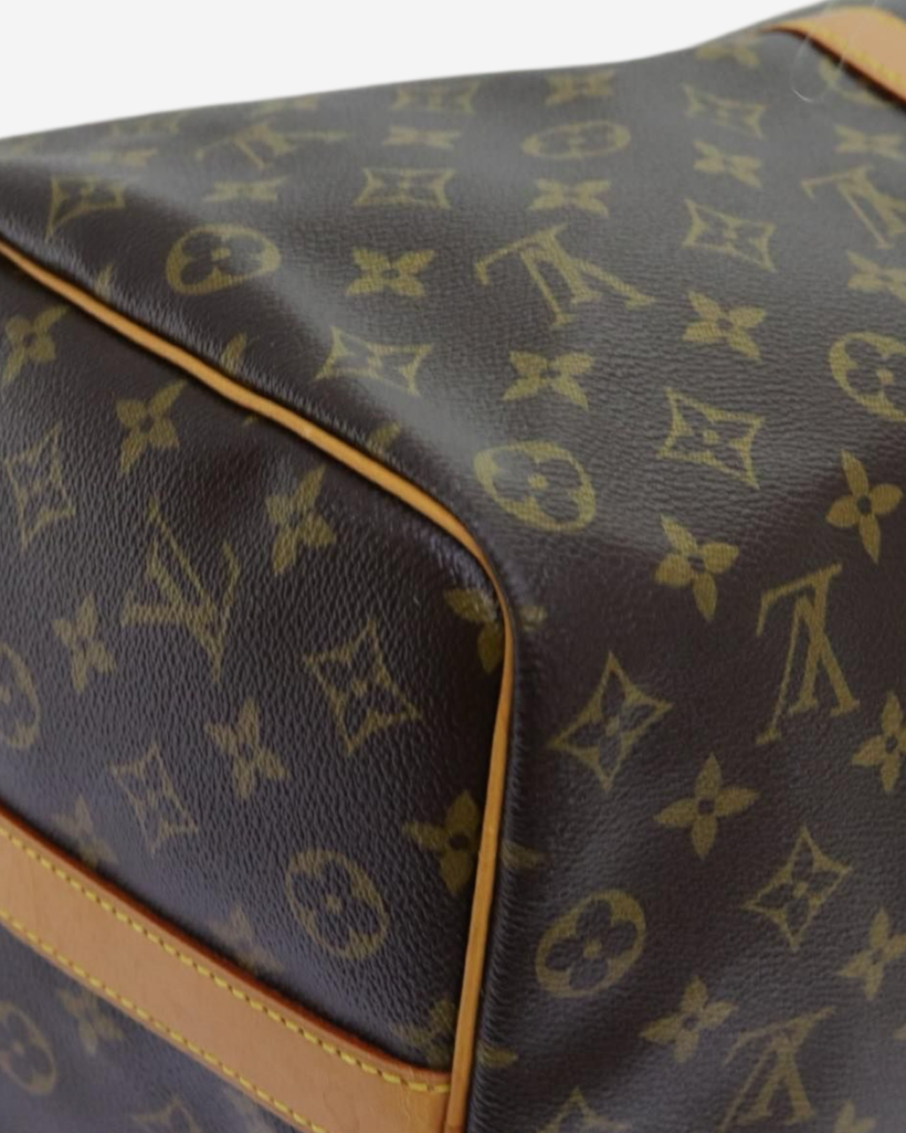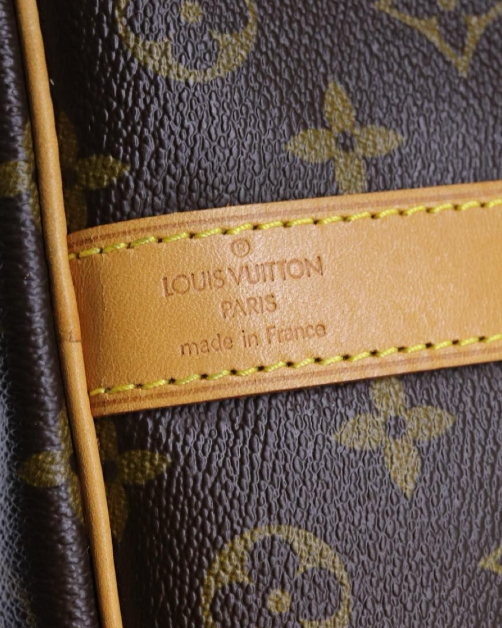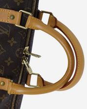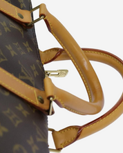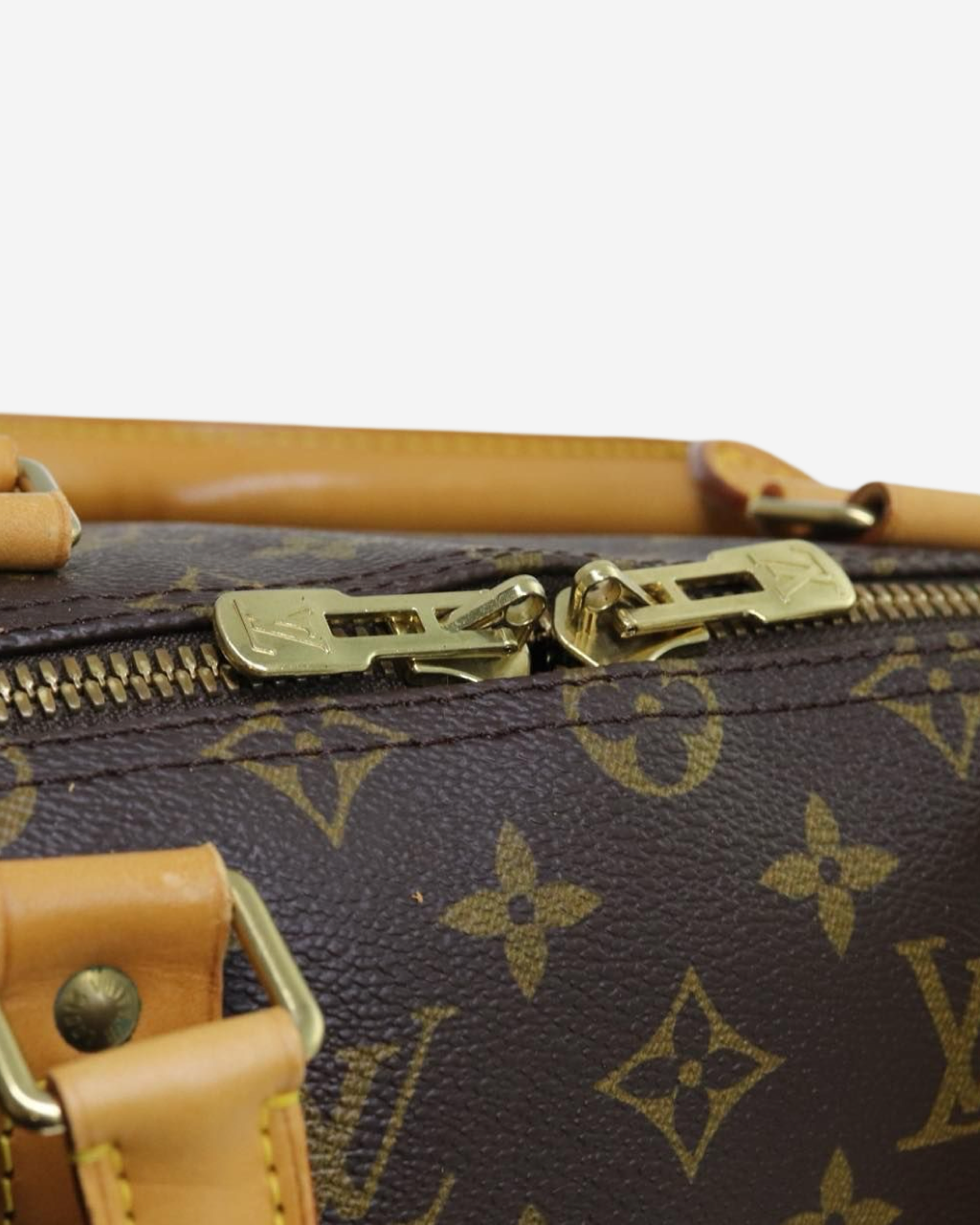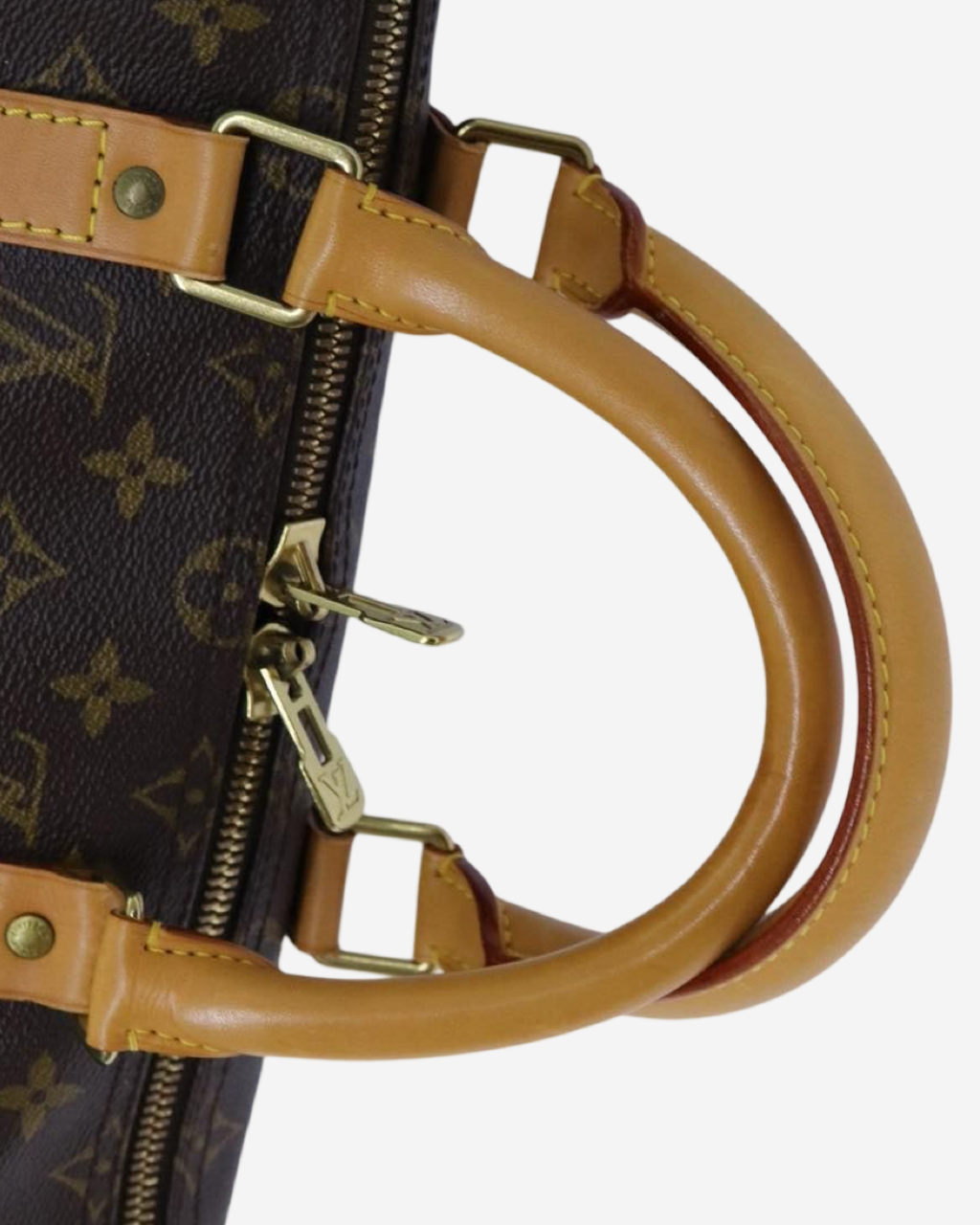 - Descripción: Bolso mano Keepall en piel, con dos asas fijas en la parte superior, cierre de doble sentido, compartimento principal, forro en canvas, color café hardware color dorado