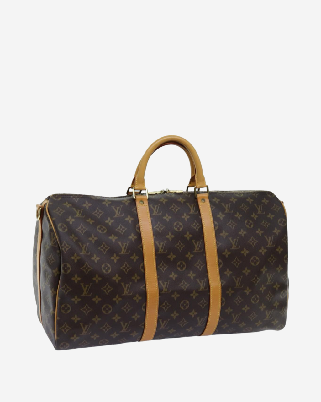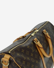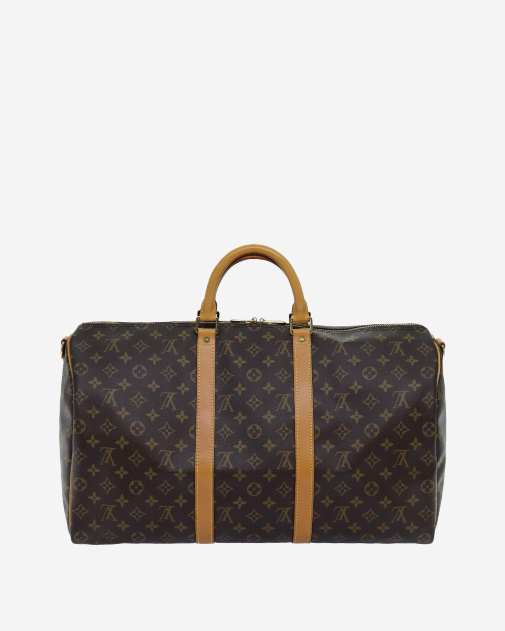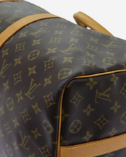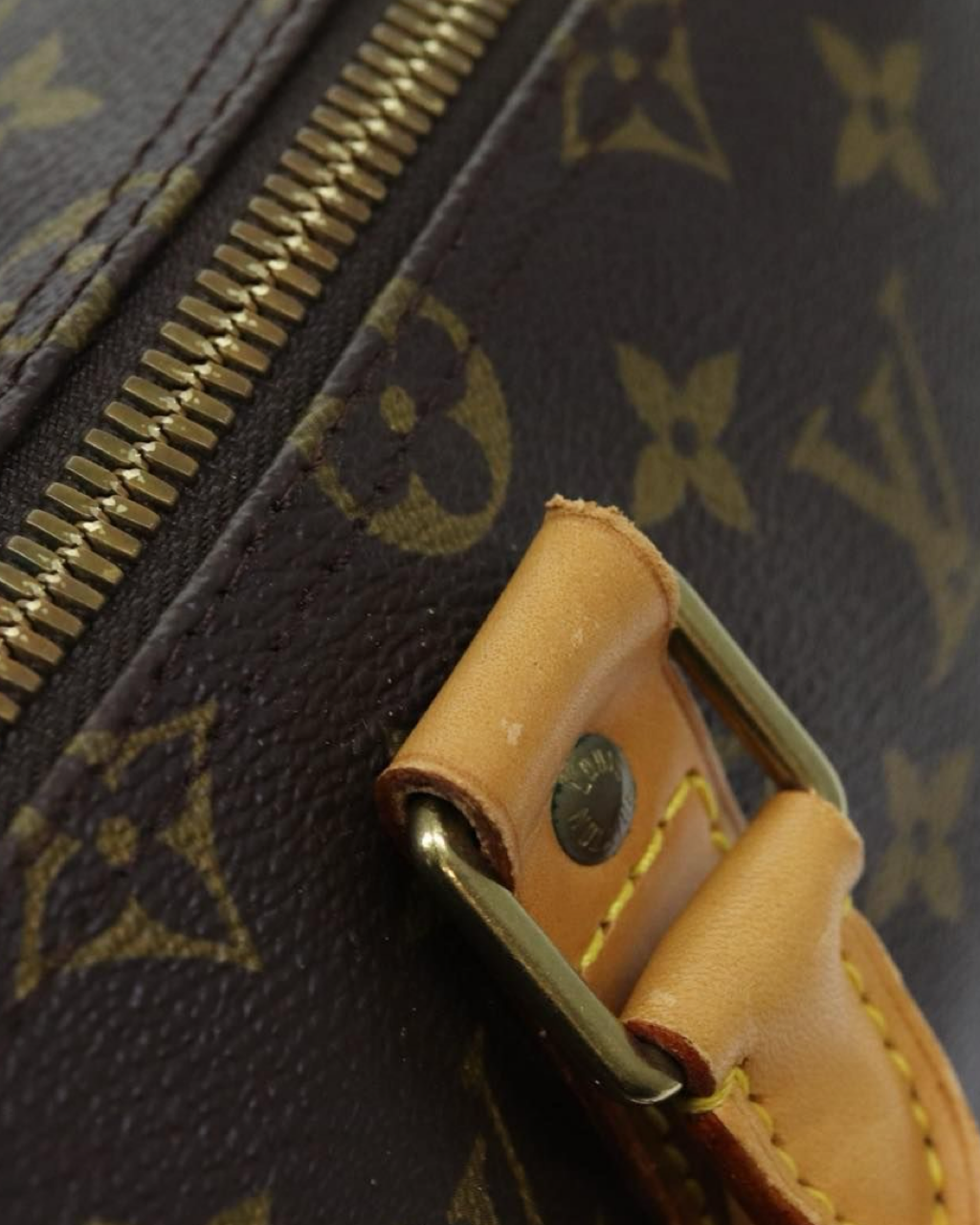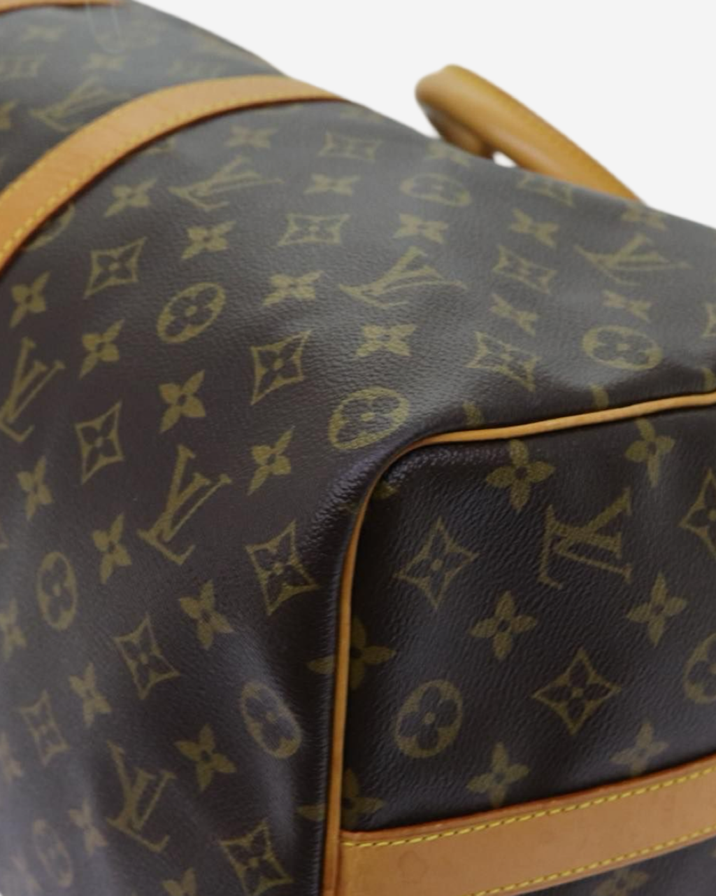 - Descripción: Bolso mano Keepall en piel, con dos asas fijas en la parte superior, cierre de doble sentido, compartimento principal, forro en canvas, color café hardware color dorado