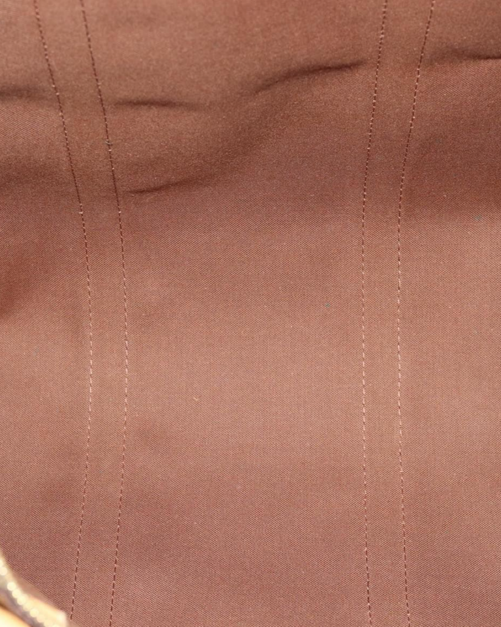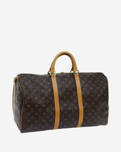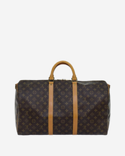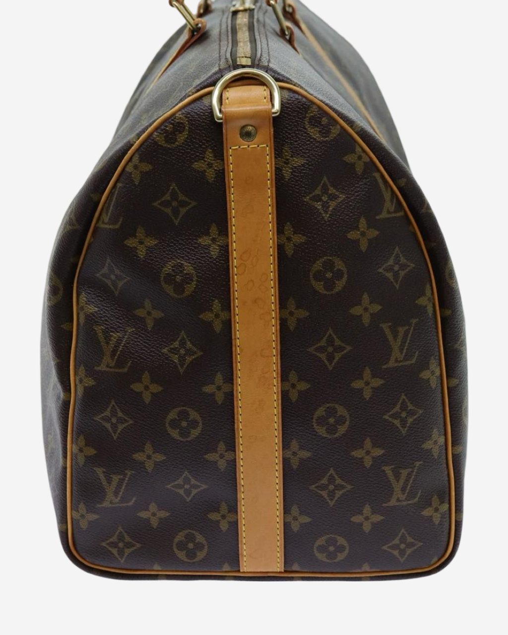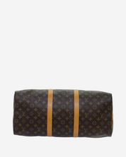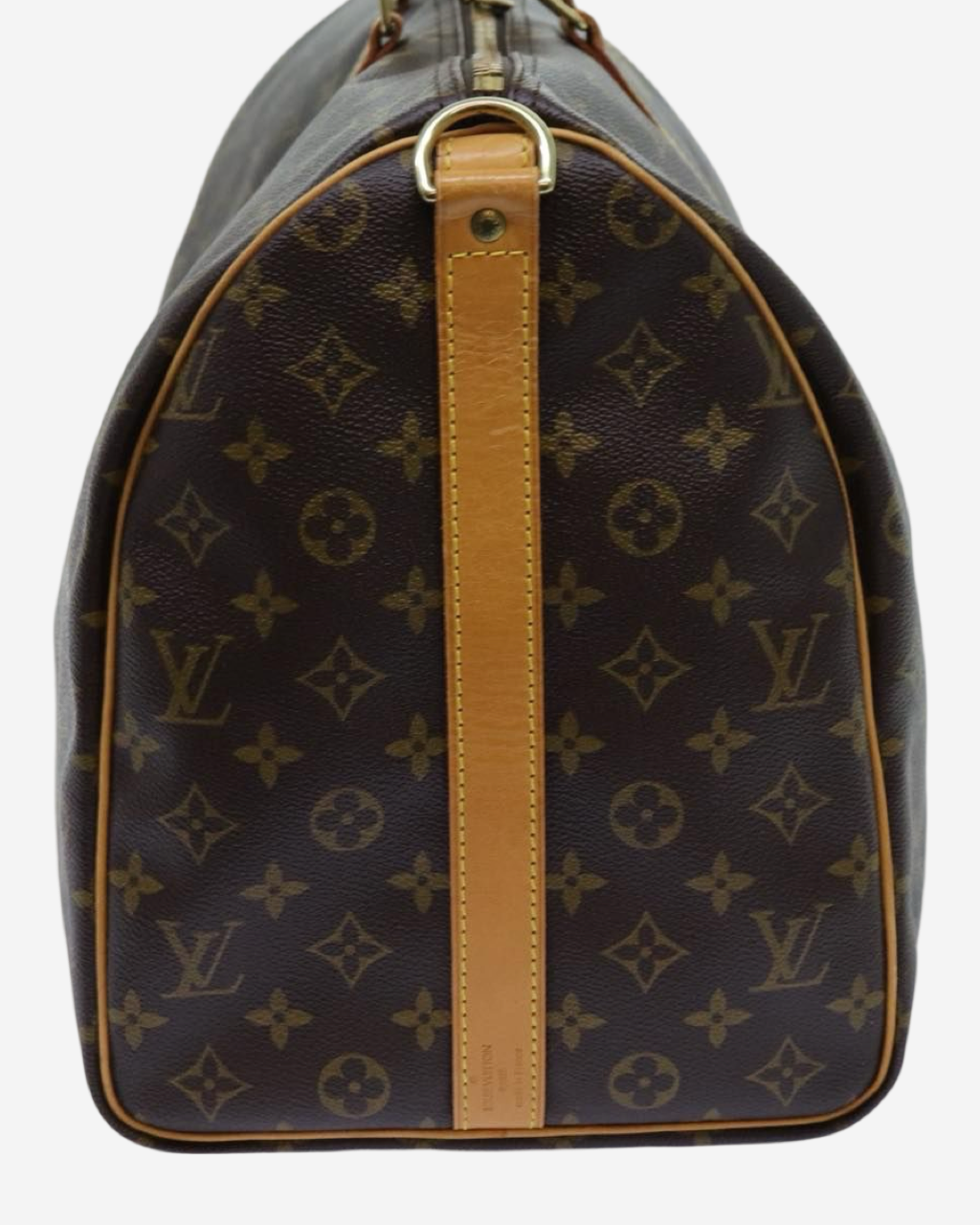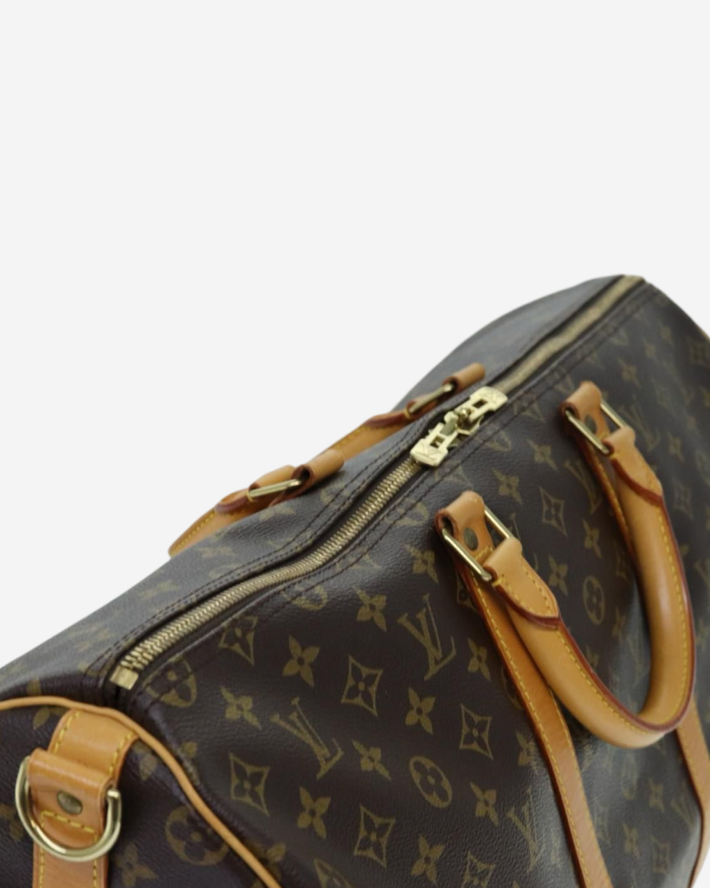 - Descripción: Bolso mano Keepall en piel, con dos asas fijas en la parte superior, cierre de doble sentido, compartimento principal, forro en canvas, color café hardware color dorado