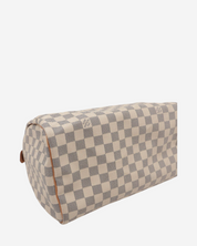 • Descripción: Bolsa de mano con dos asas, cierre con cremallera en el tope y compartimento principal, forro interior en tela, hardware color dorado