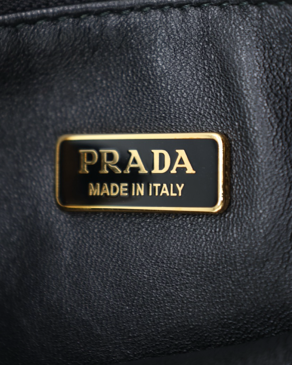 - Descripción: Bolsa de hombro con doble pochette, una en piel en tono negro, y otra en canvas de print tiangolo en tono beige y negro, placa característica frontal, asa ajustable, hardware color dorado