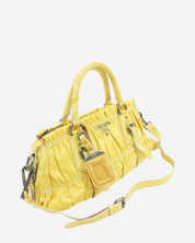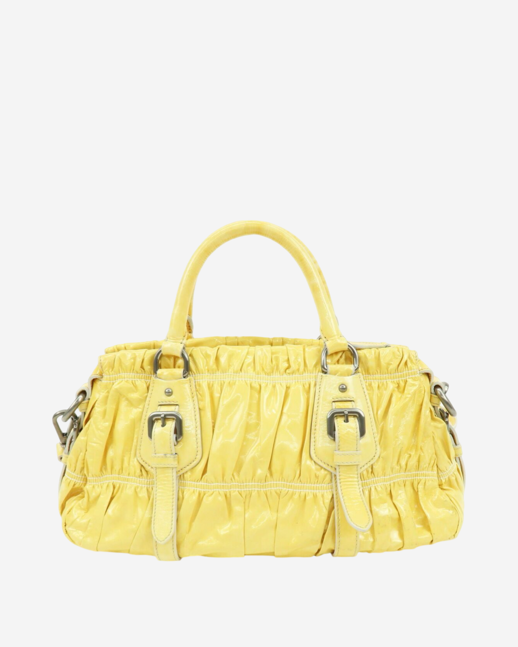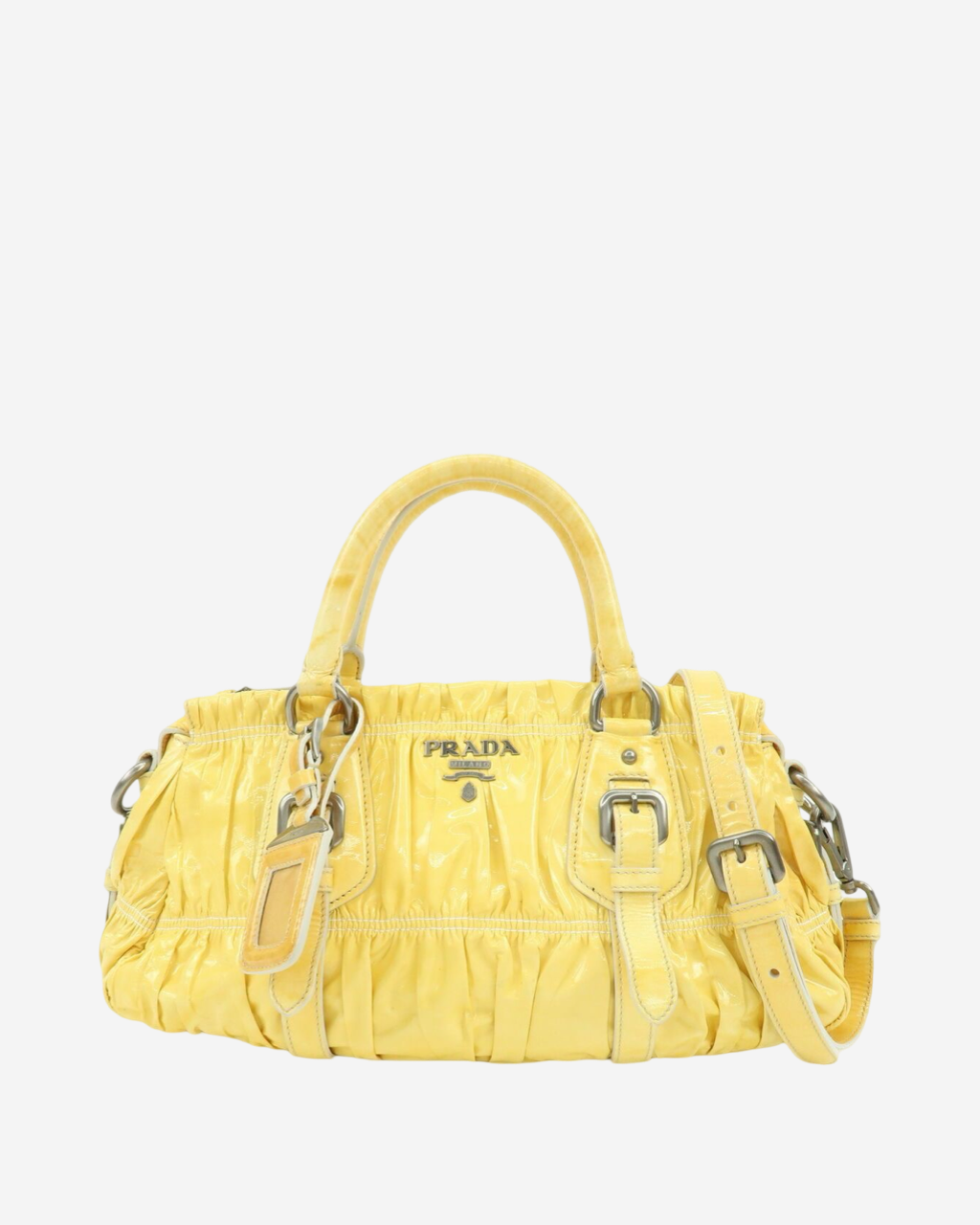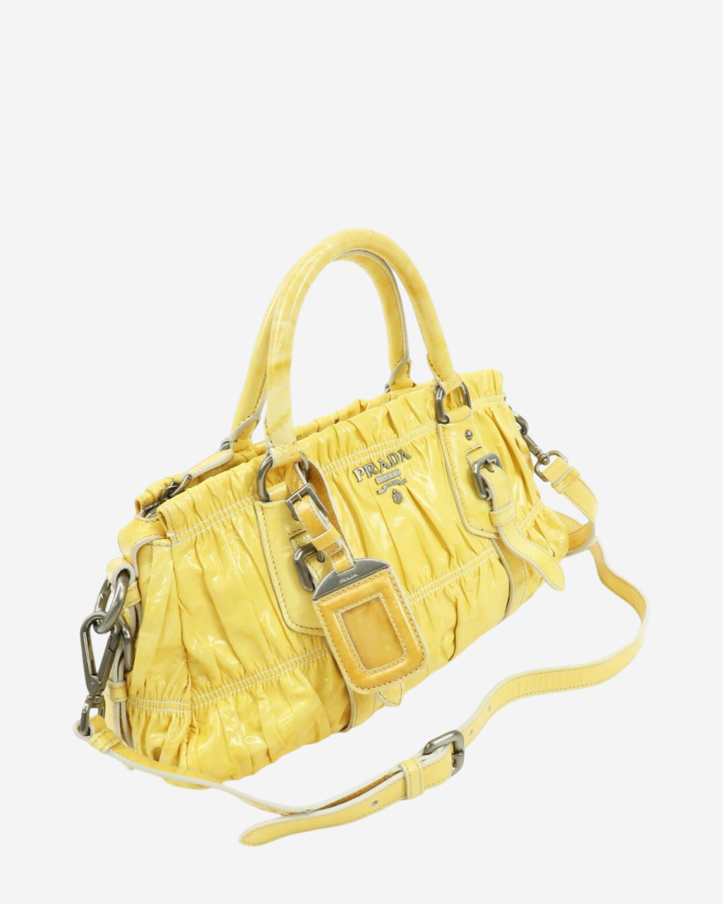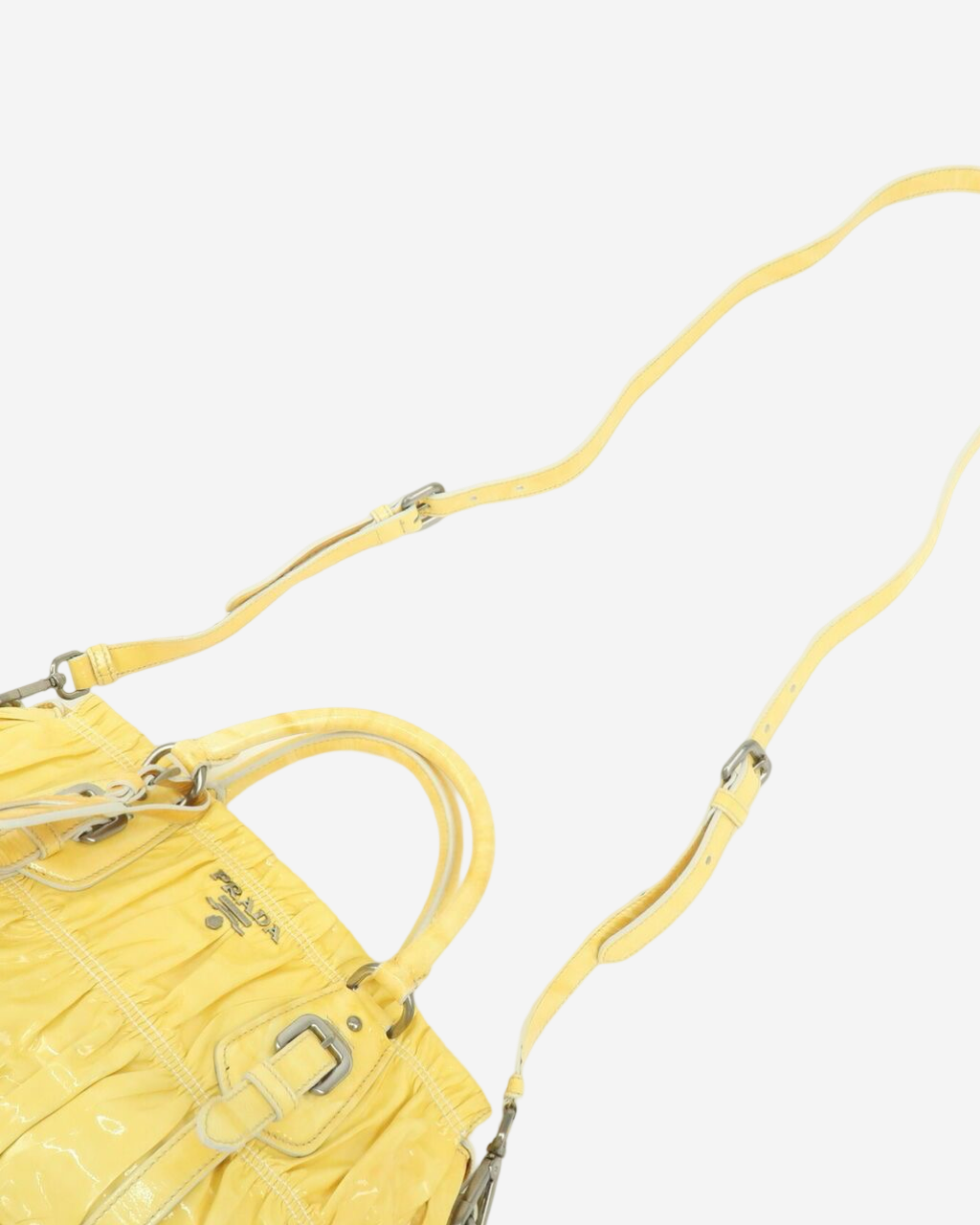 - Descripción: Bolsa Prada en piel color amarillo con detalles de broche frontal, placa característica, doble asa fija, abertura a presión, hardware color plateado