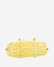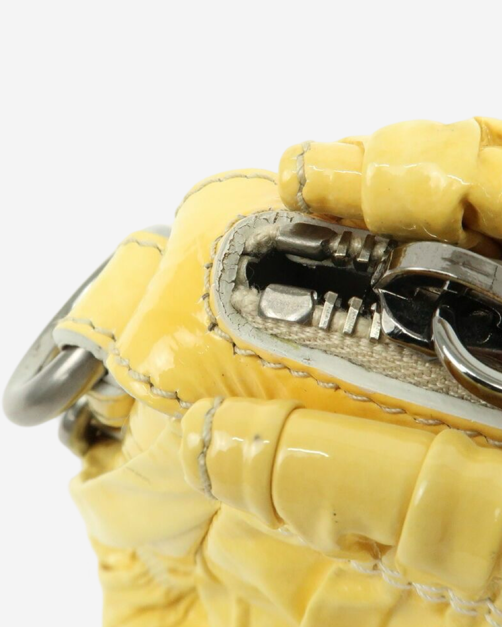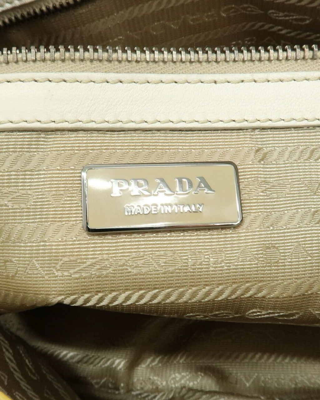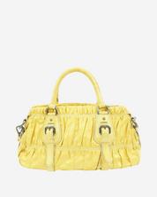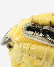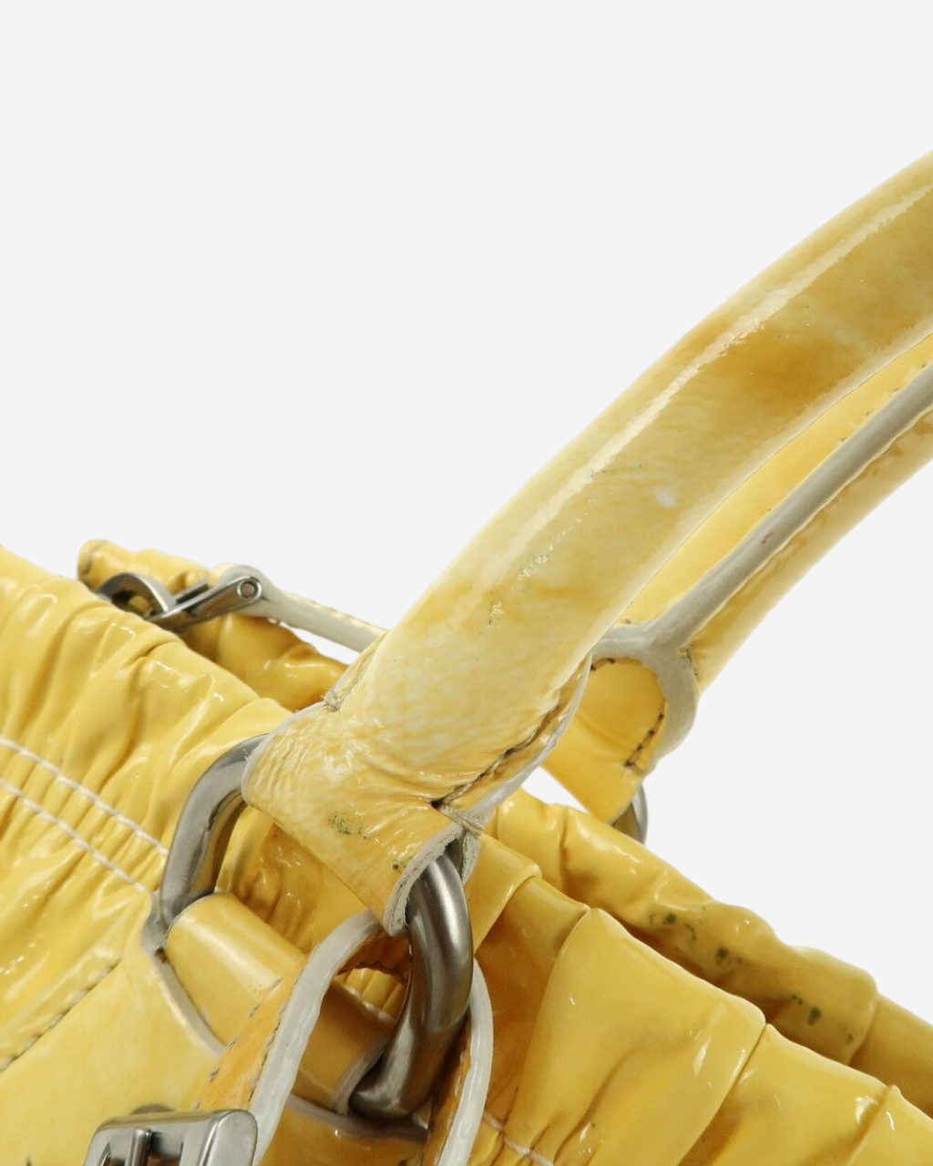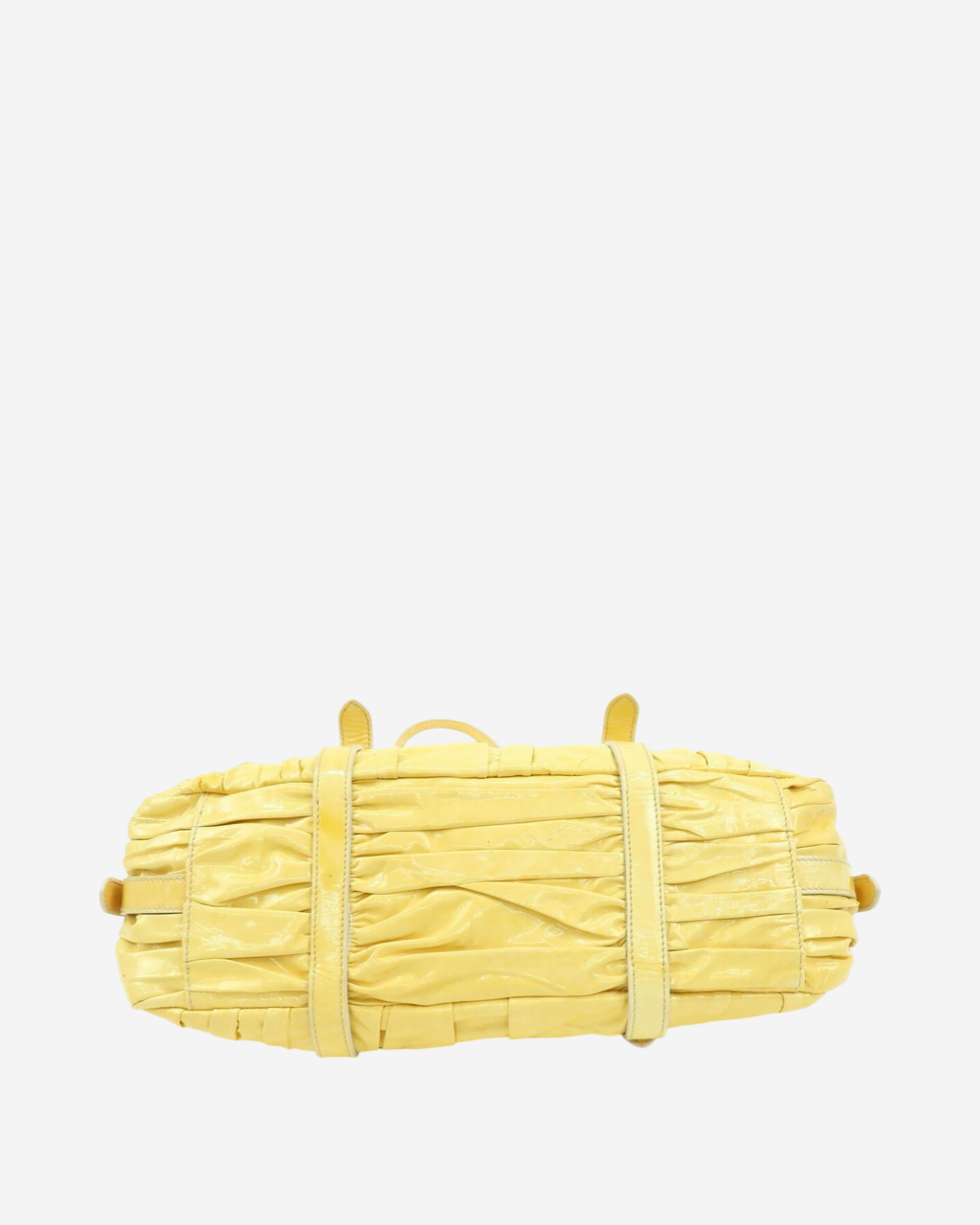 - Descripción: Bolsa Prada en piel color amarillo con detalles de broche frontal, placa característica, doble asa fija, abertura a presión, hardware color plateado