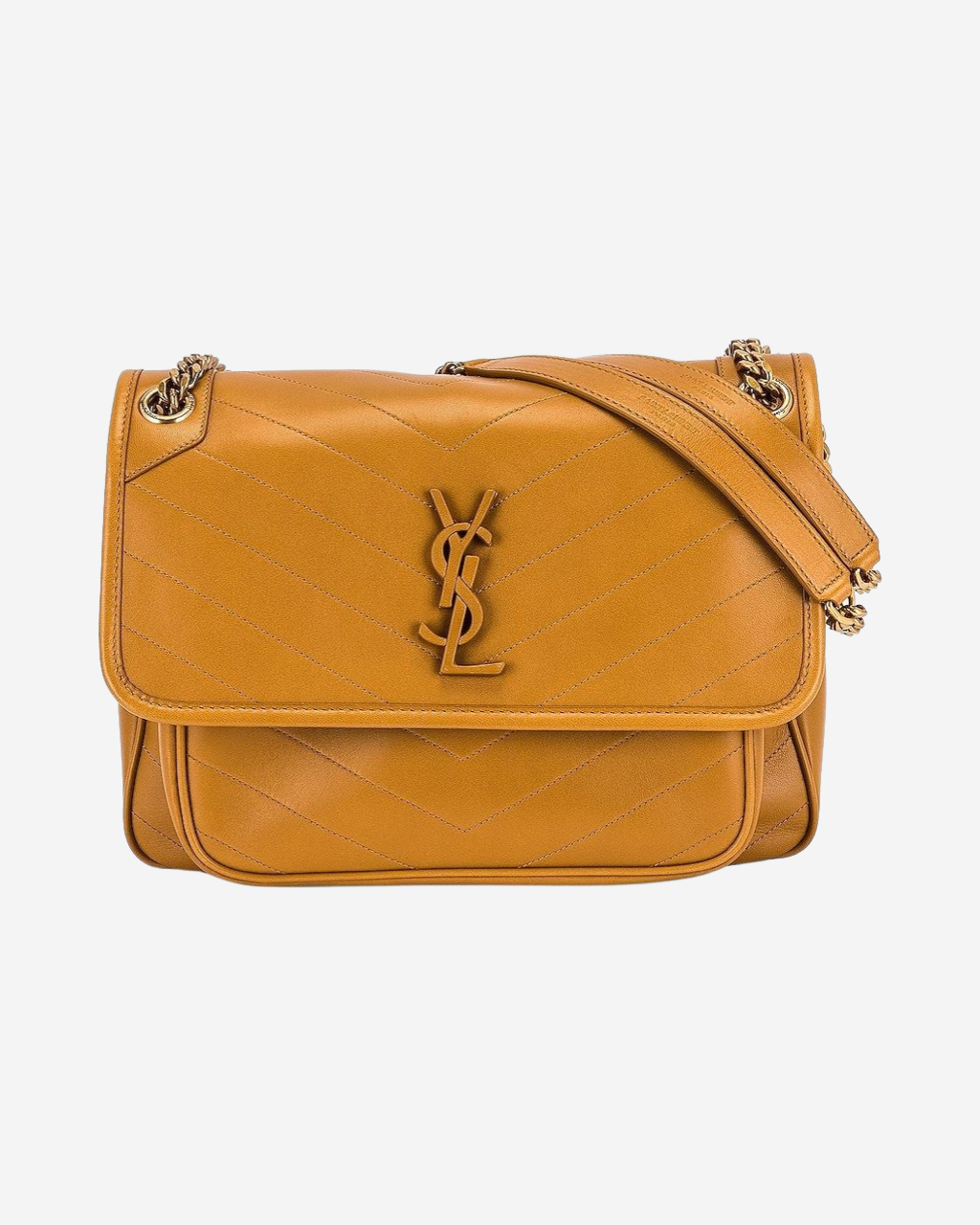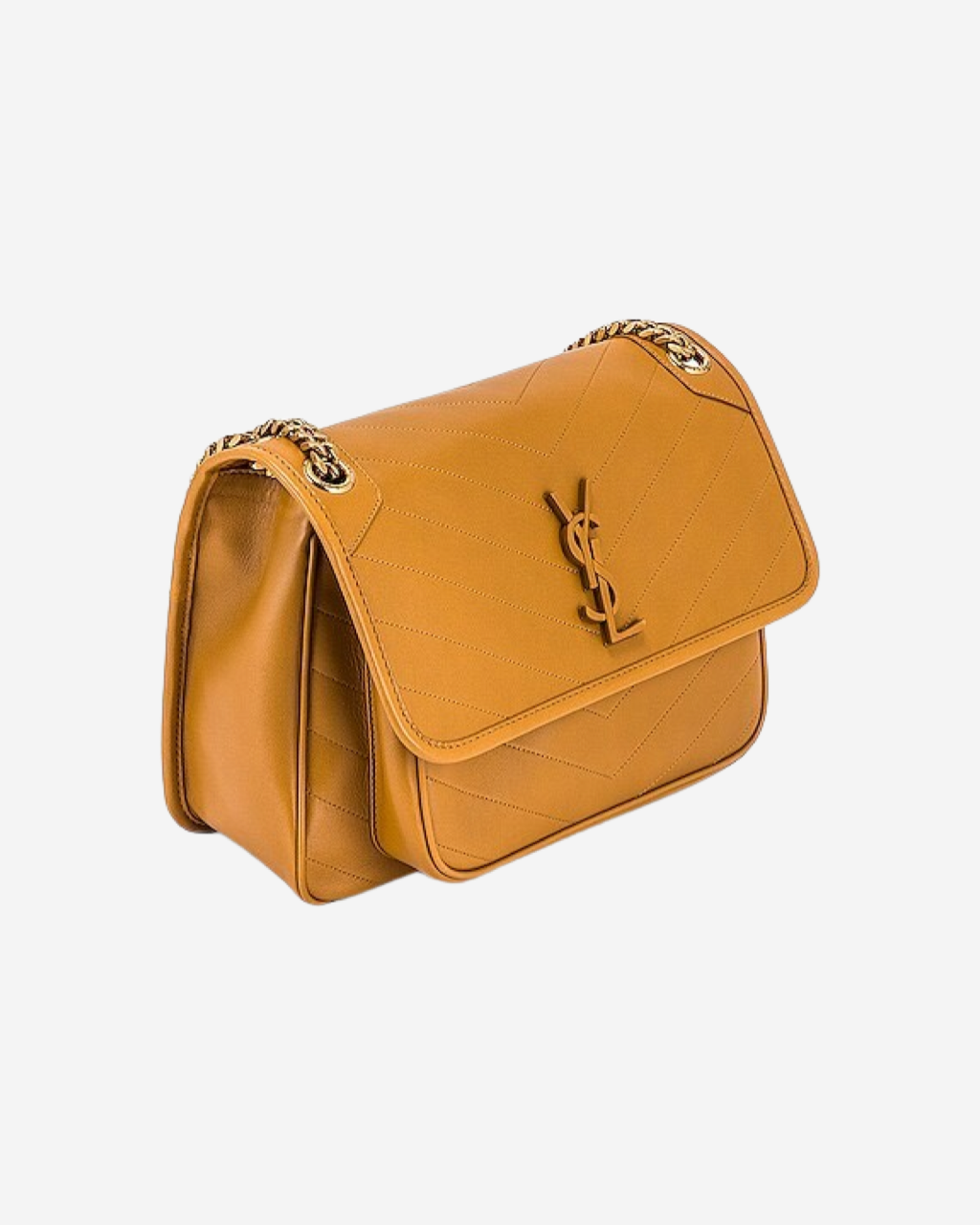 • Descripción: Bolso de hombro con placa característica del logo YSL, parte superior plegable con cierre magnético, correa de cadena para el hombro, bolsillo en la parte delantera y bolsillo interno con cierre.