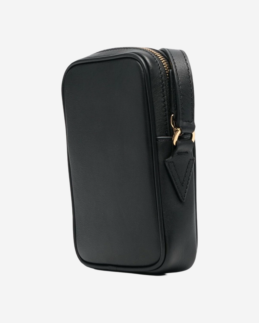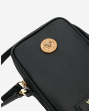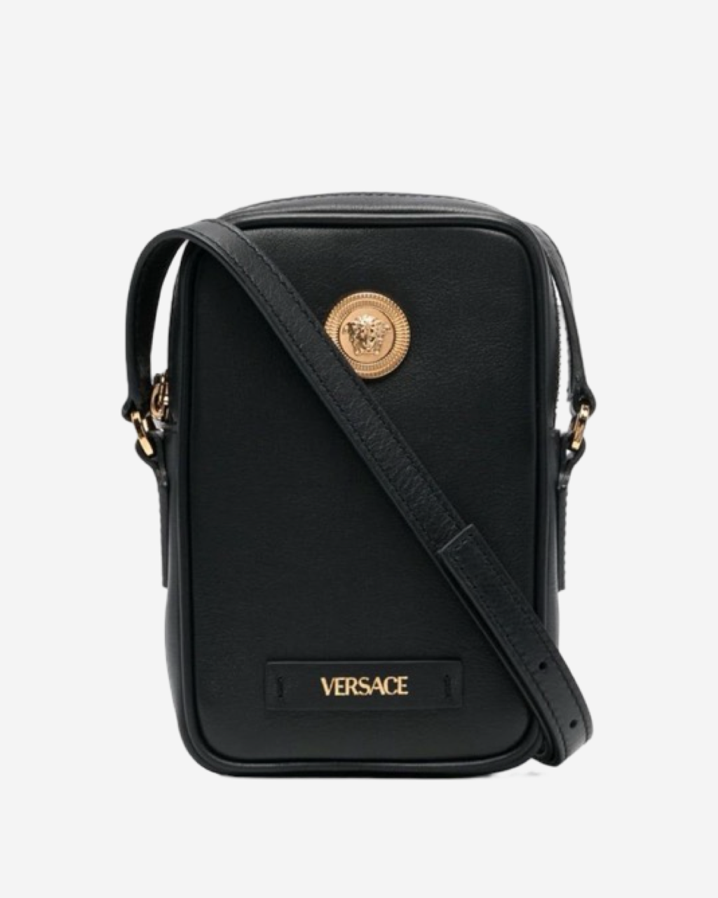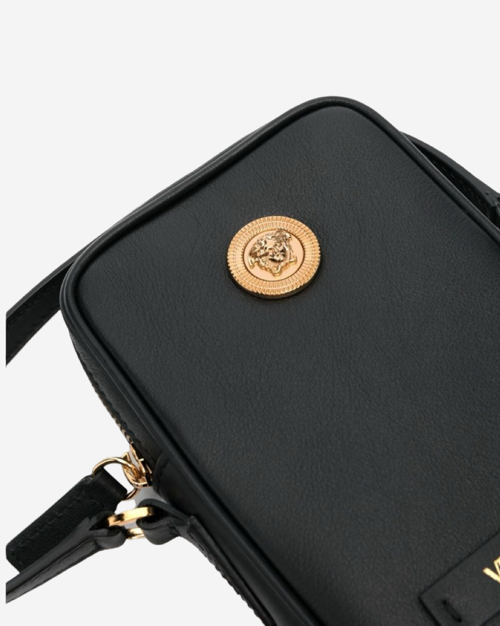 - Descripción: Bolso versace en piel color negro, placa de medusa frontal, cierre al tope, strap largo, hardware color dorado