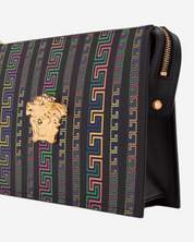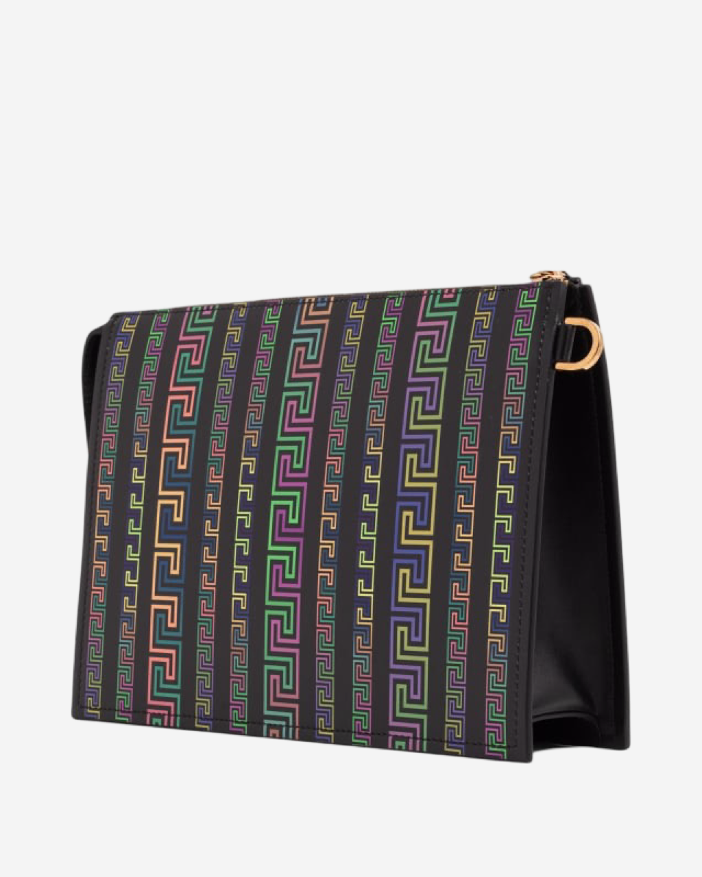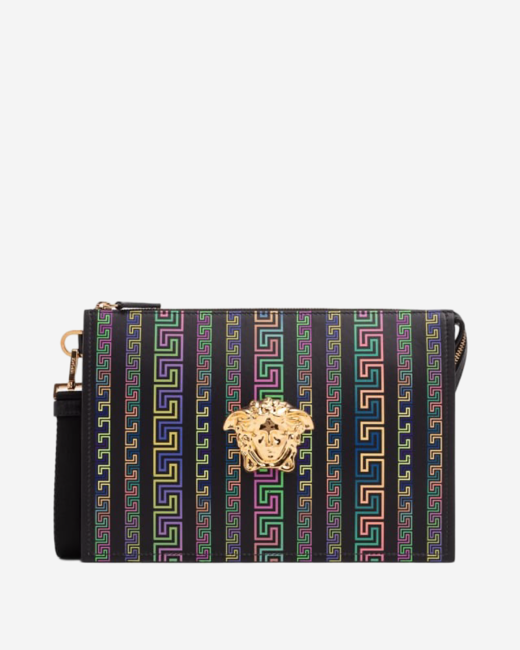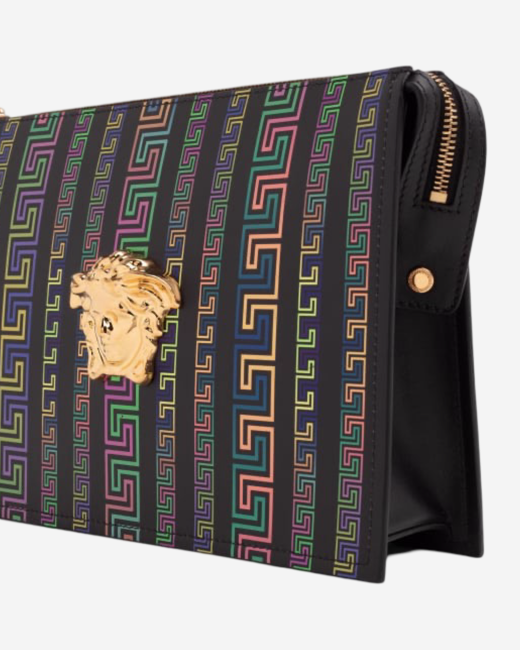 - Descripción: Pouch en print la greca multicolor, placa de medusa frontal, cierre al tope, forro interior textil, hardware en tono dorado