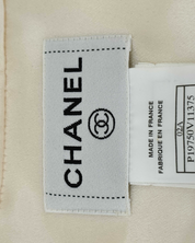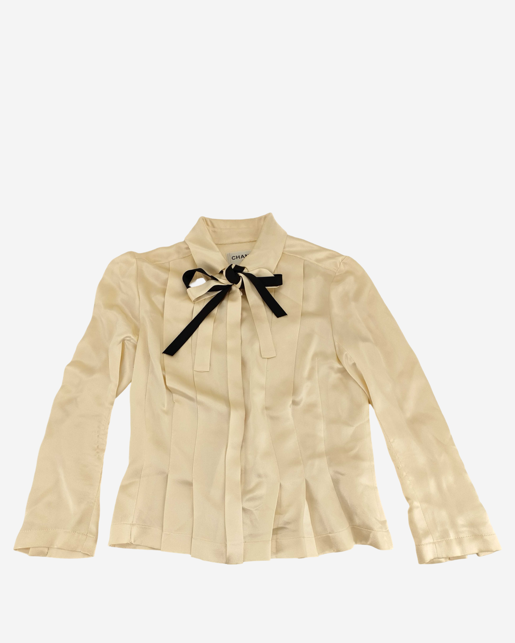 - Descripción: Camisa de seda en color blanco, ajuste con botones frontrales, cuello italiano con detalle de moño, manga larga