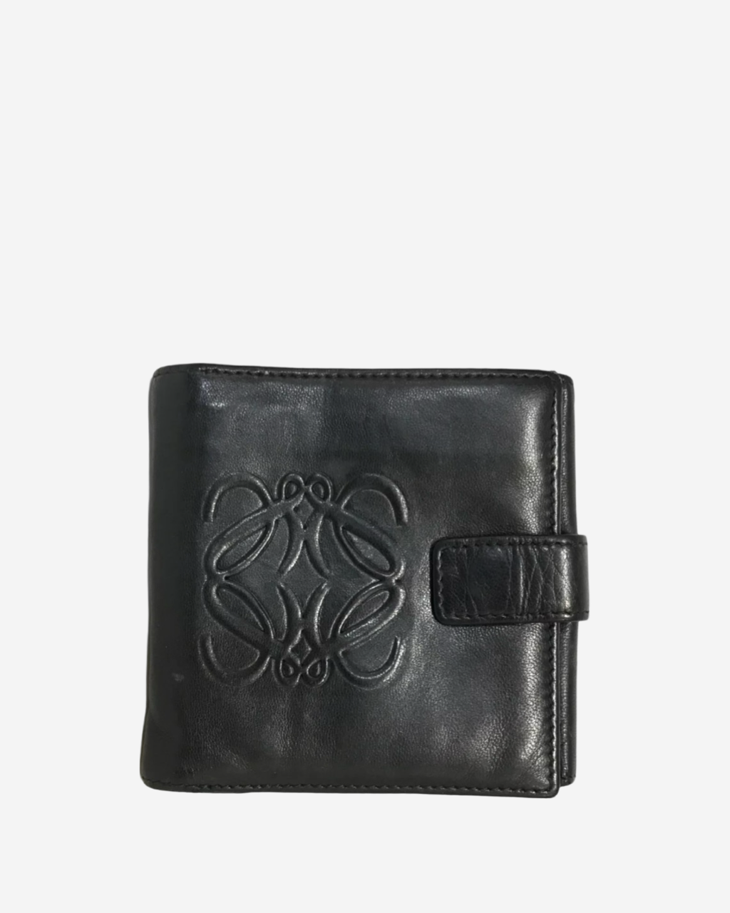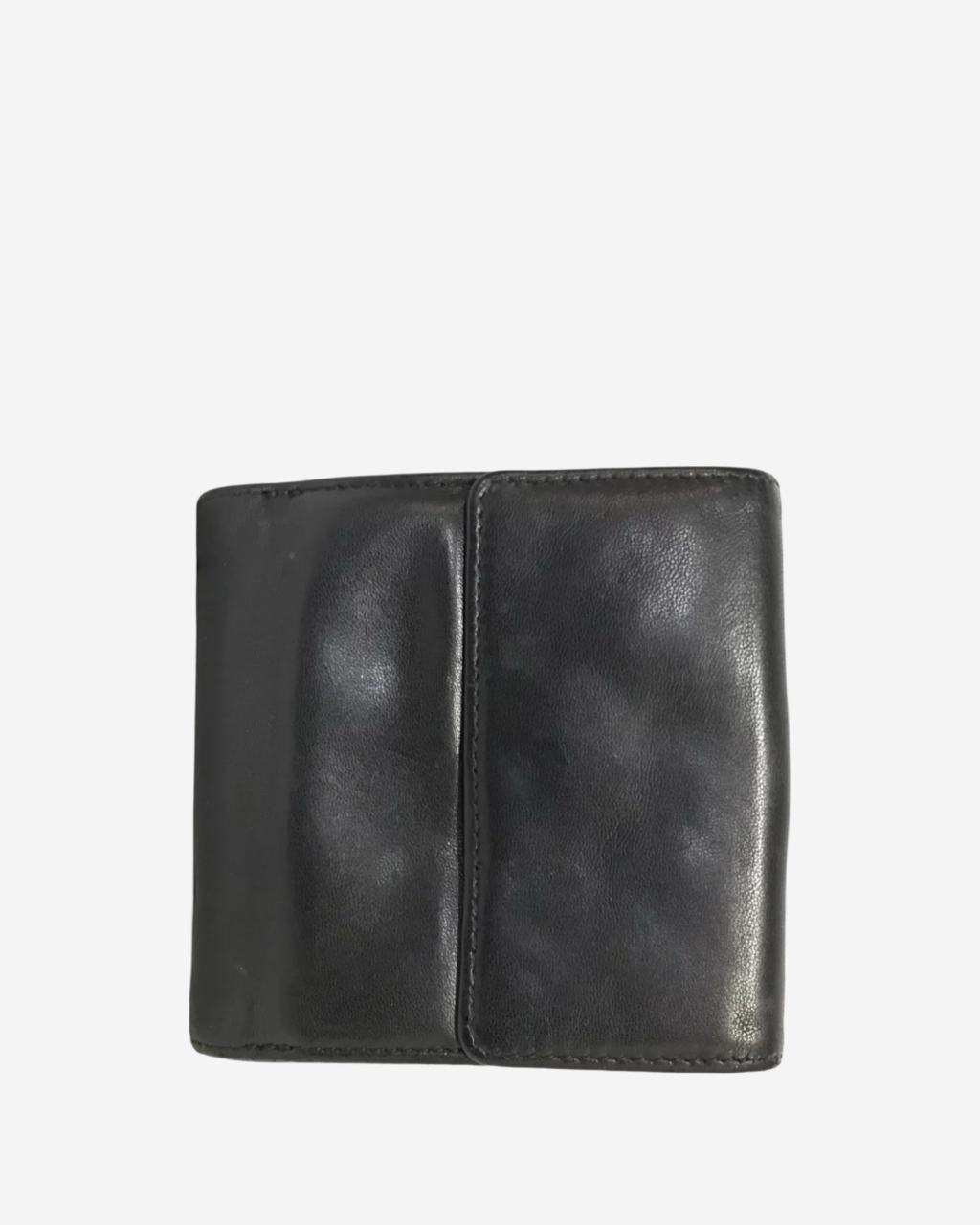 • Descripción: Cartera en piel con logo frontal característico, broche, compartimento para monedas, tarjetas y billetes, hardware color plateado