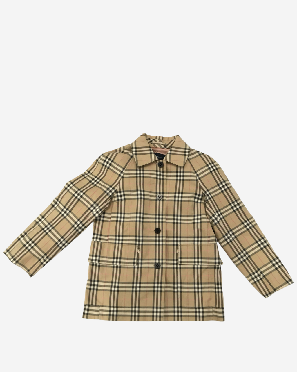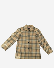- Descripción: Chamarra Burberry en color beige, cuello italiana, manga larga, ajuste con botones frontales