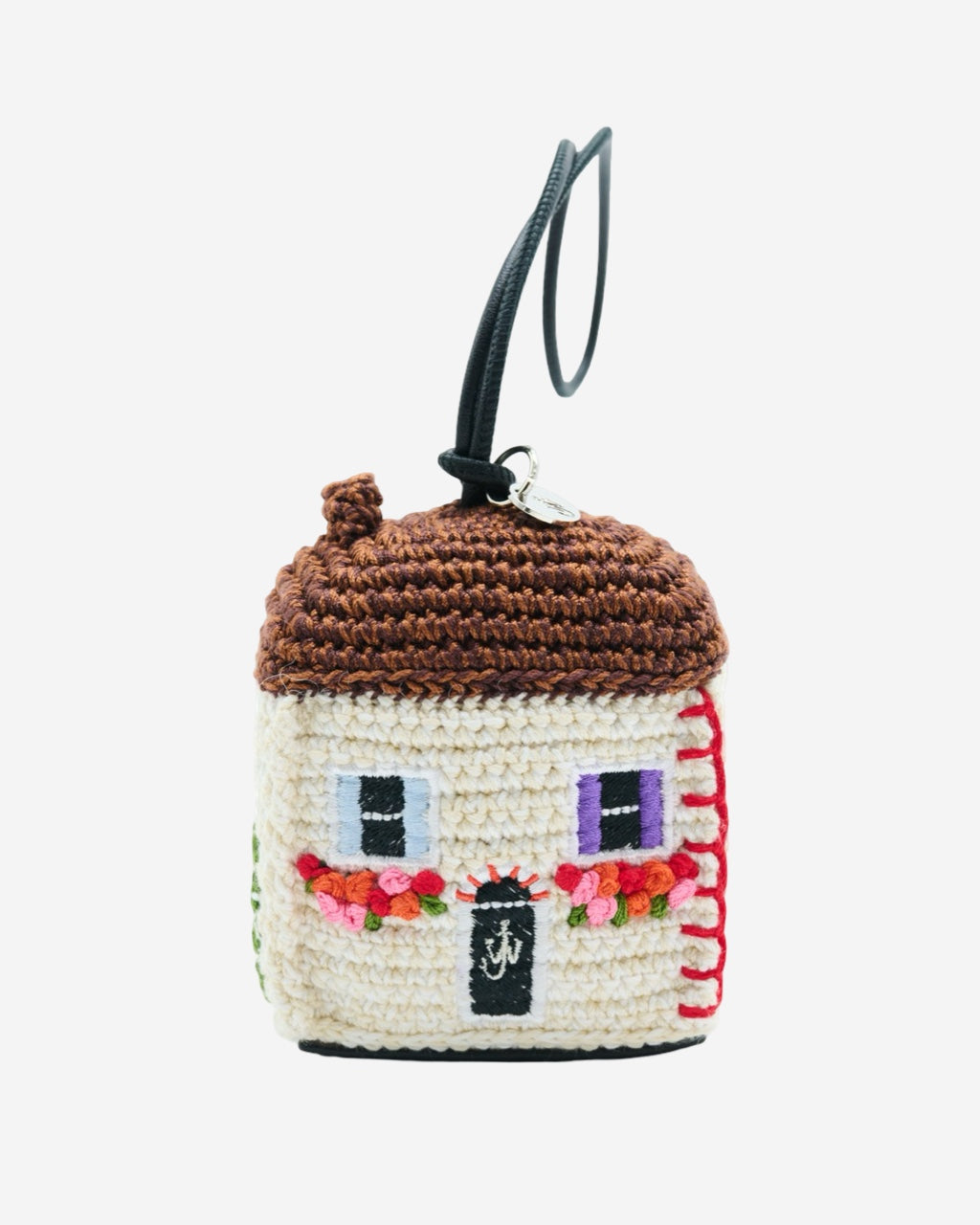 - Descripción: Charm JW Anderson tejido en color beige, forma de casa, logo grabado en la parte inferior, correa de piel para ajustar