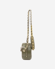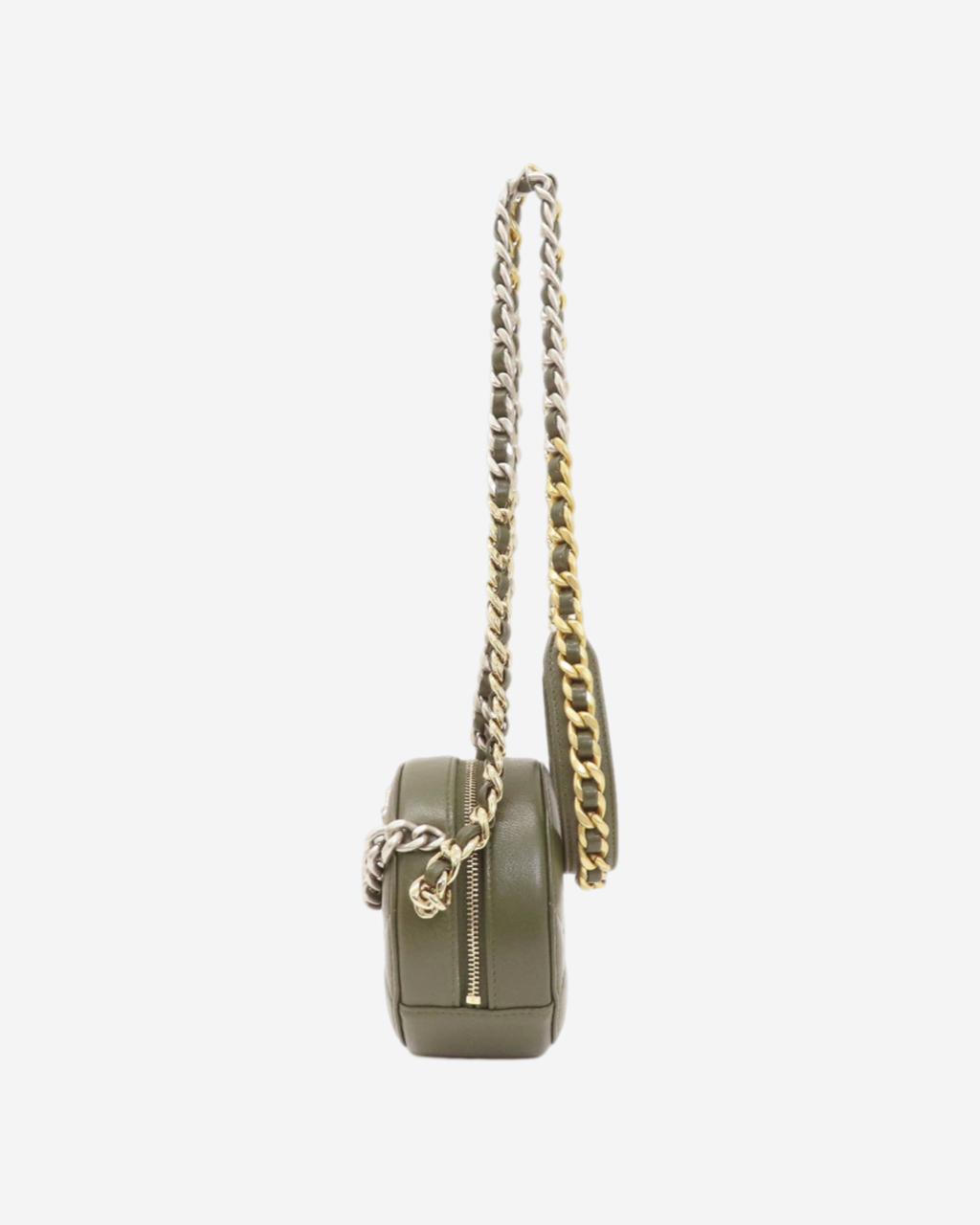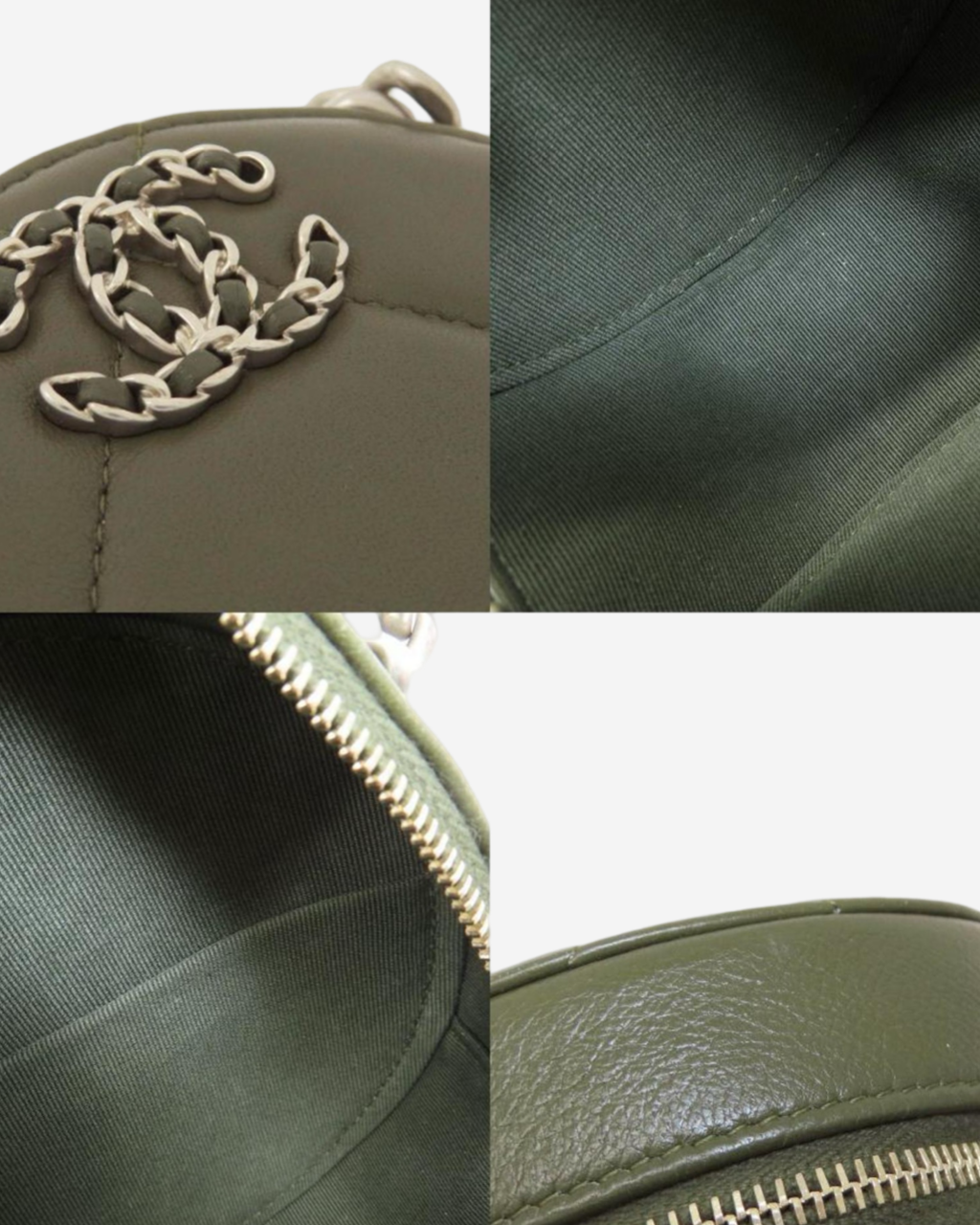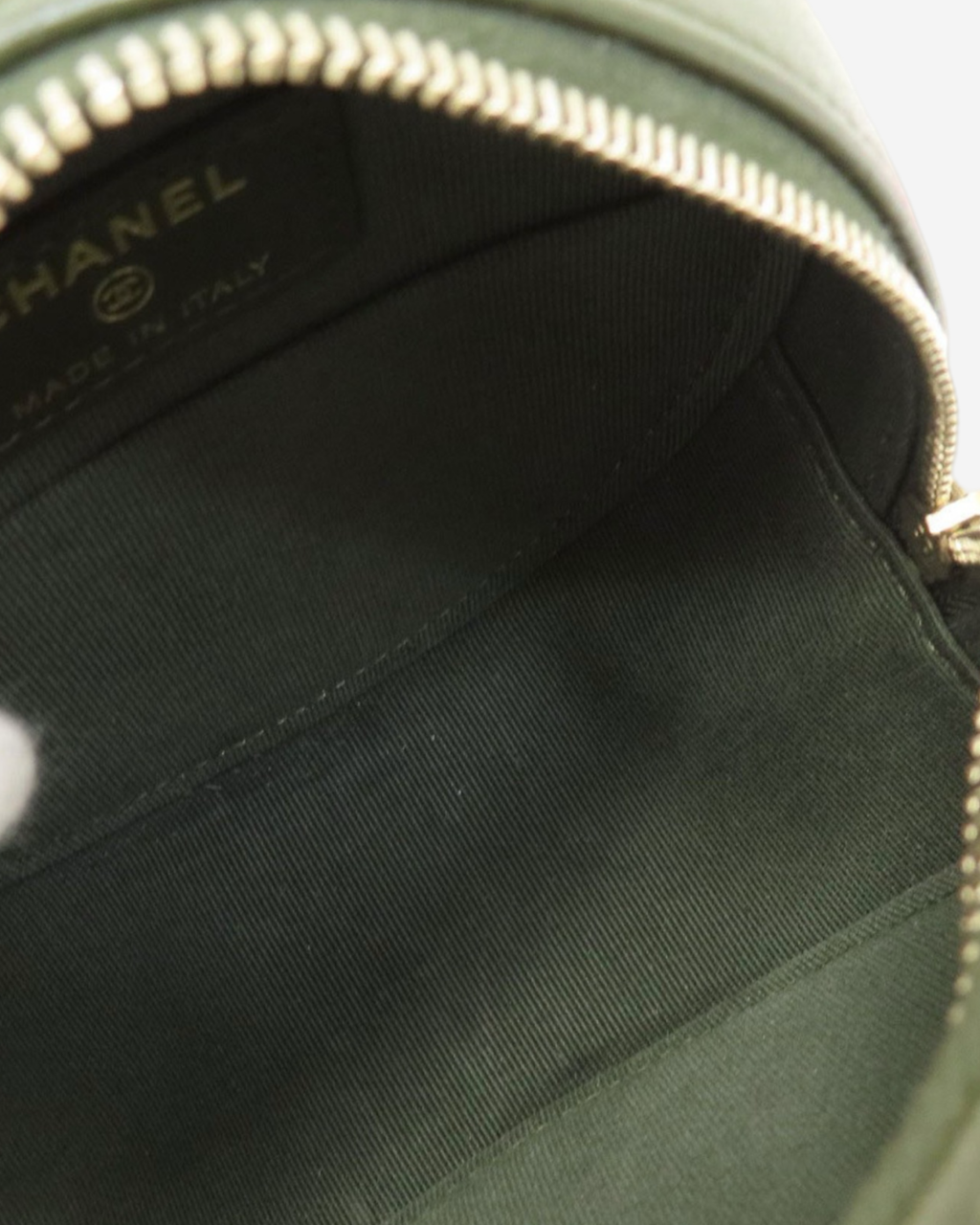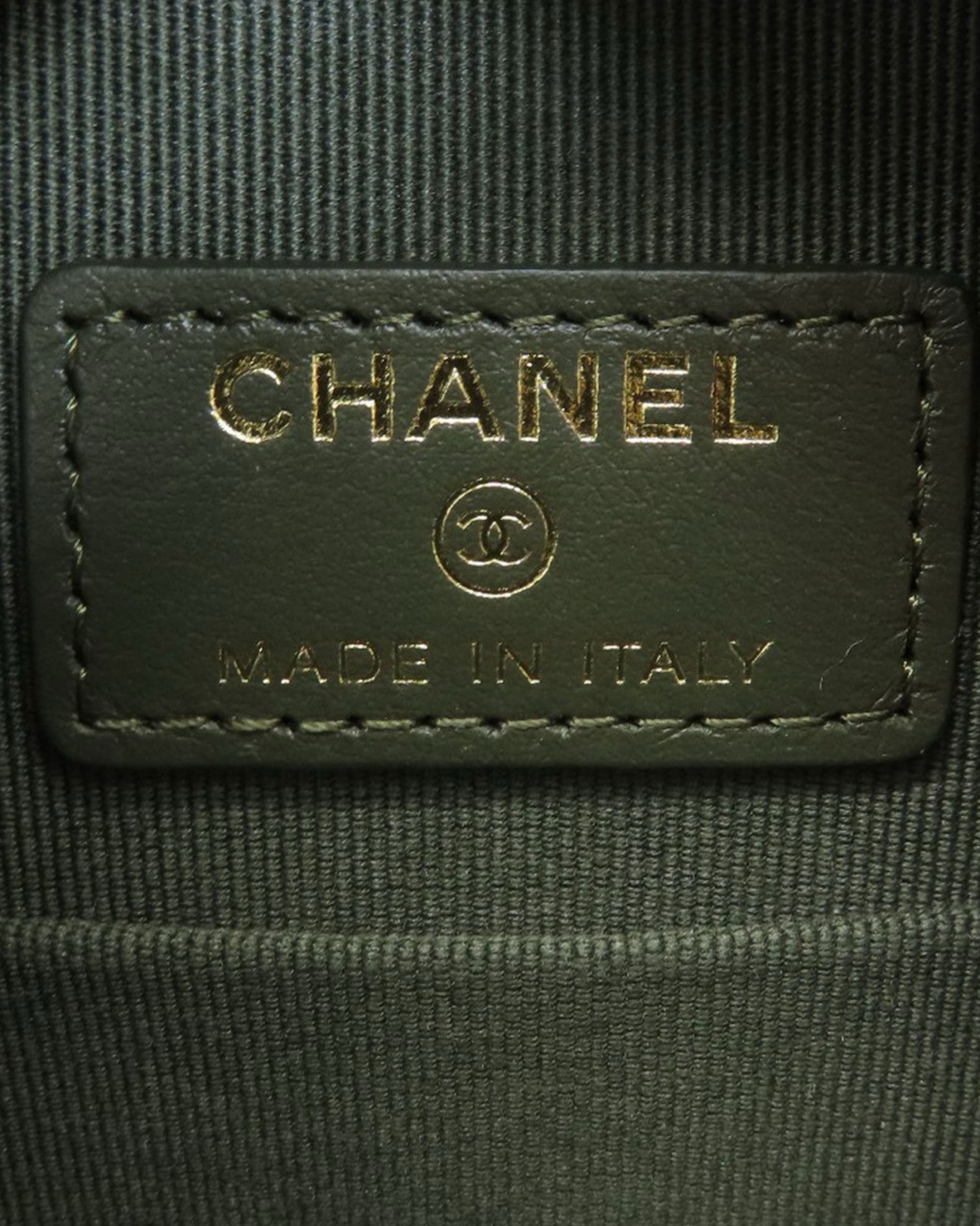 - Descripción: Clutch en piel color verde, logo CC frontal característico, cierre al tope, cadena matelassé larga, interior con bolsillos, hardware color plateado y dorado