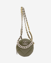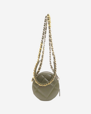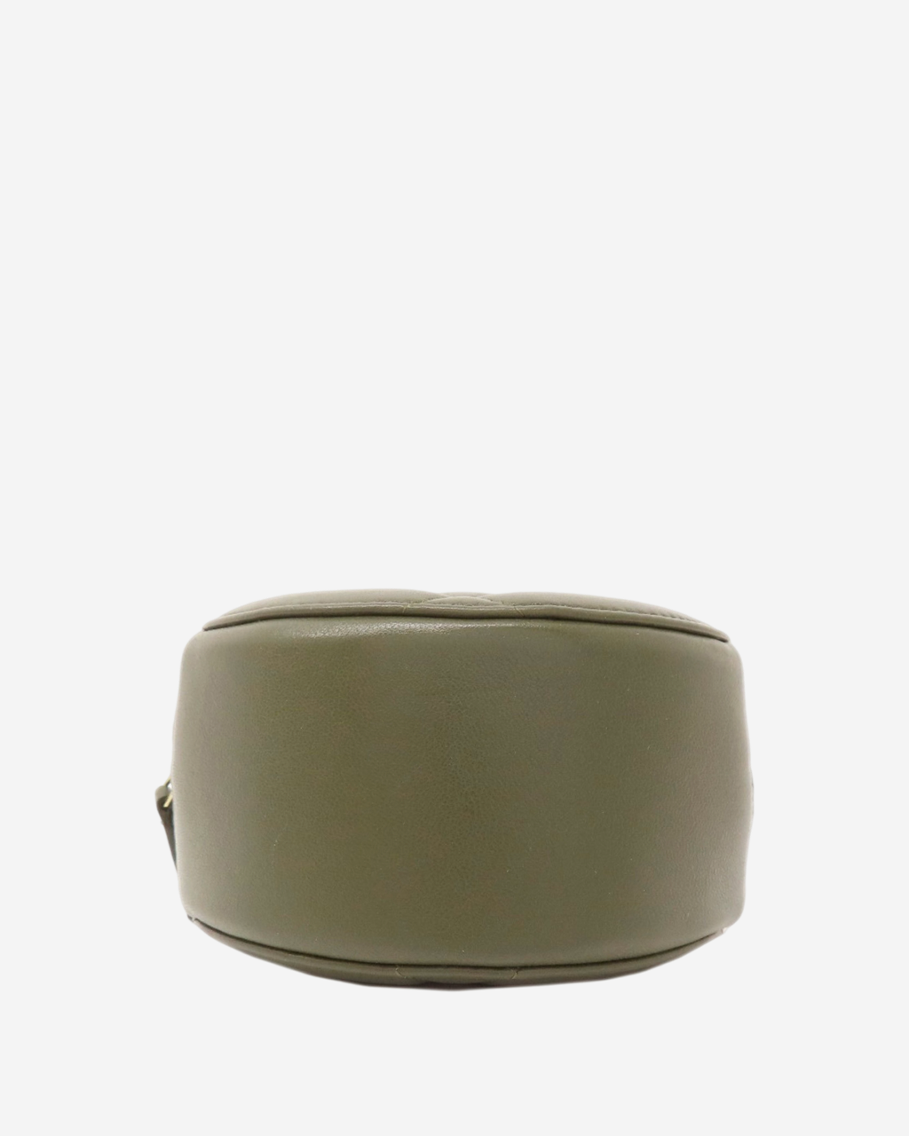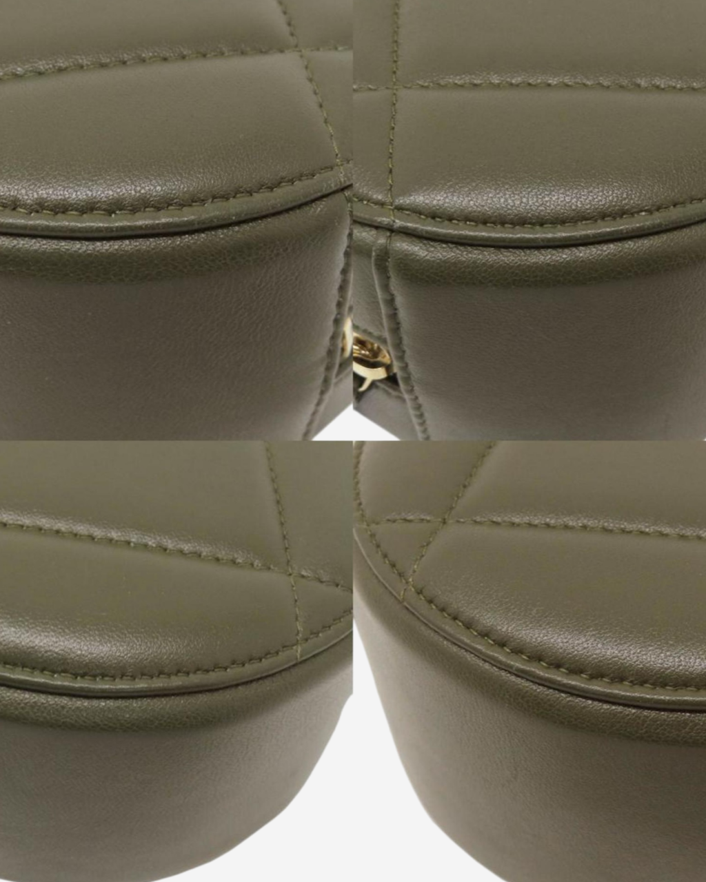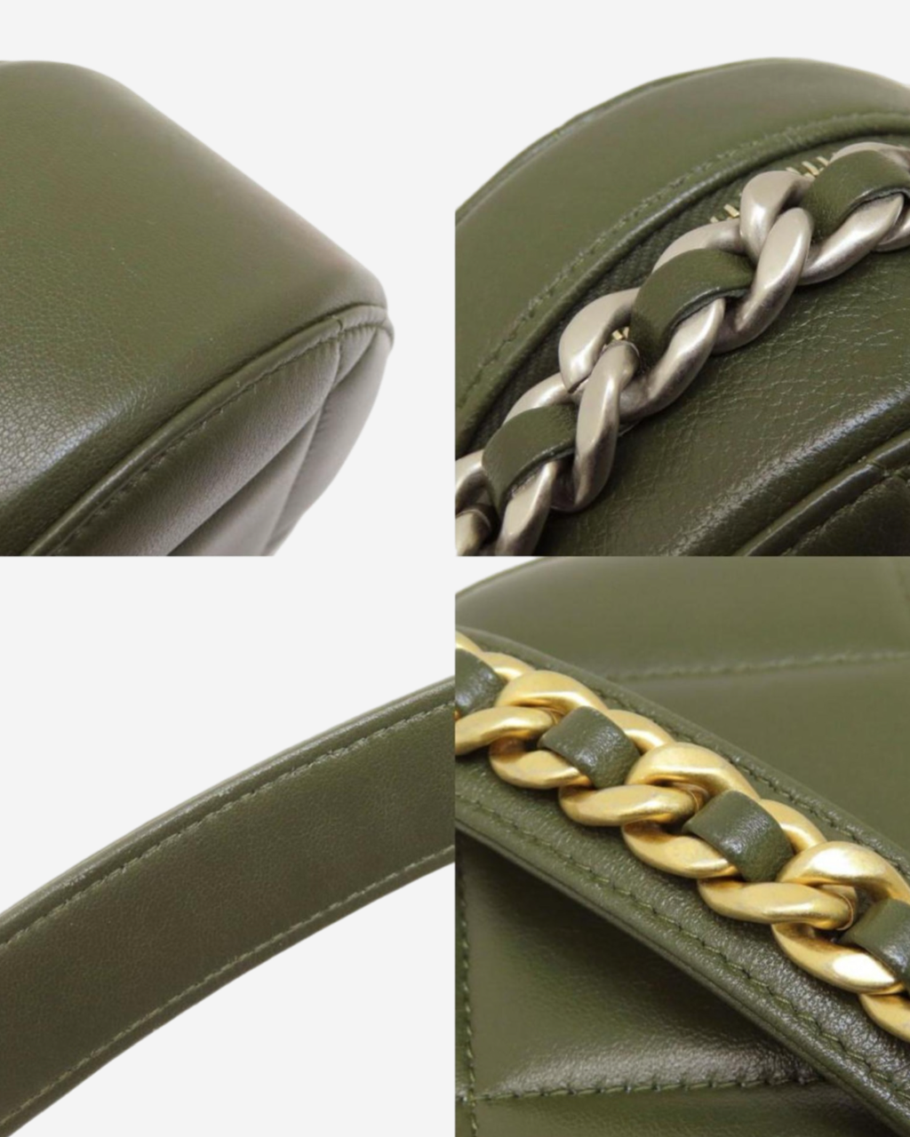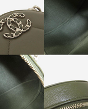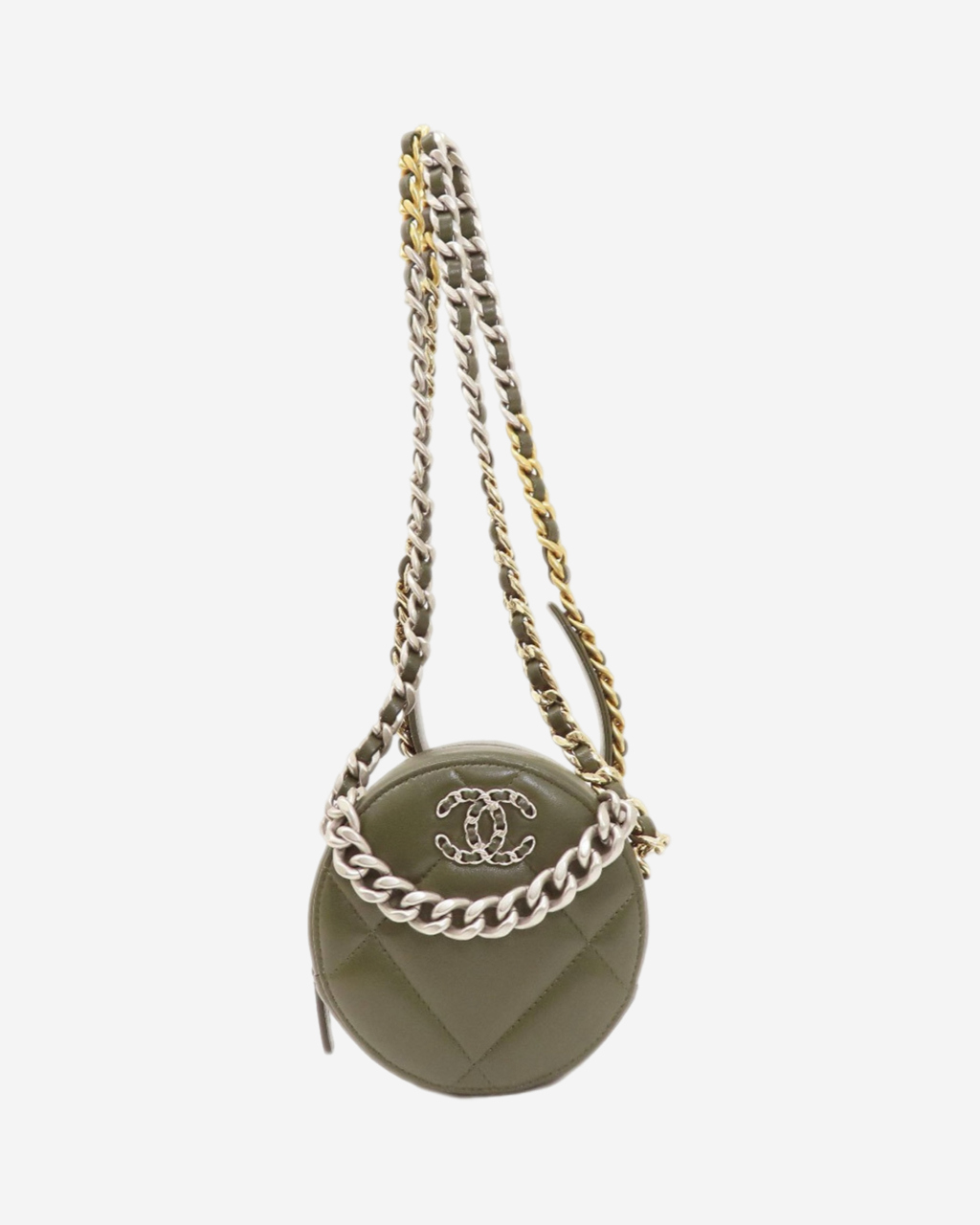 - Descripción: Clutch en piel color verde, logo CC frontal característico, cierre al tope, cadena matelassé larga, interior con bolsillos, hardware color plateado y dorado