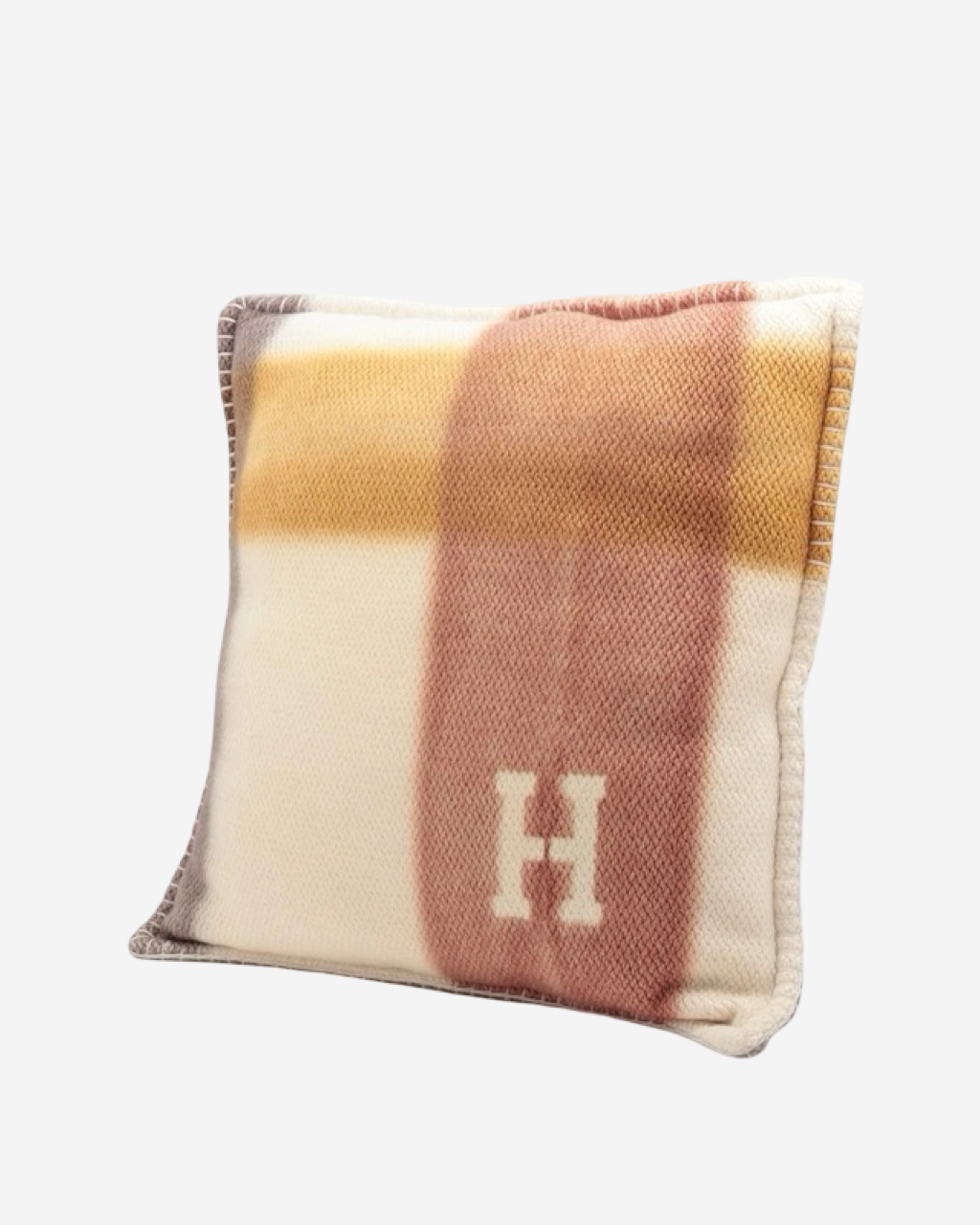 • Descripción: Cojín Hermès en lana efecto tartán en colores naranjas, logo H característico, forma cuadrada