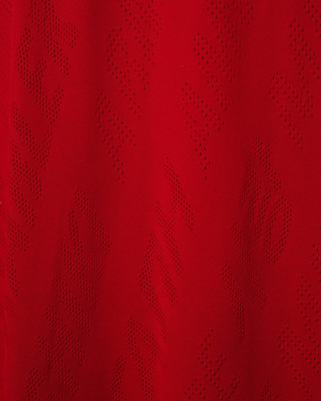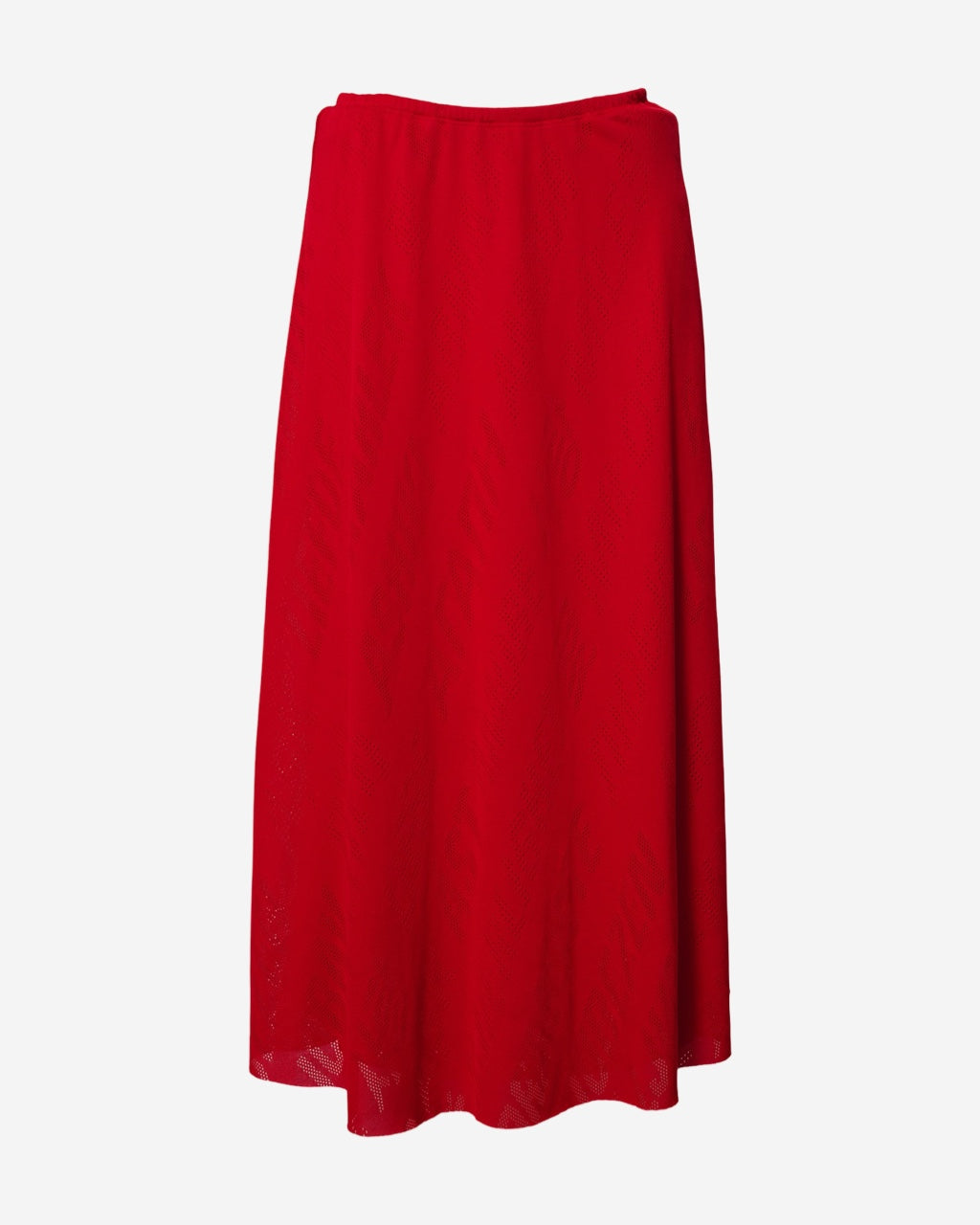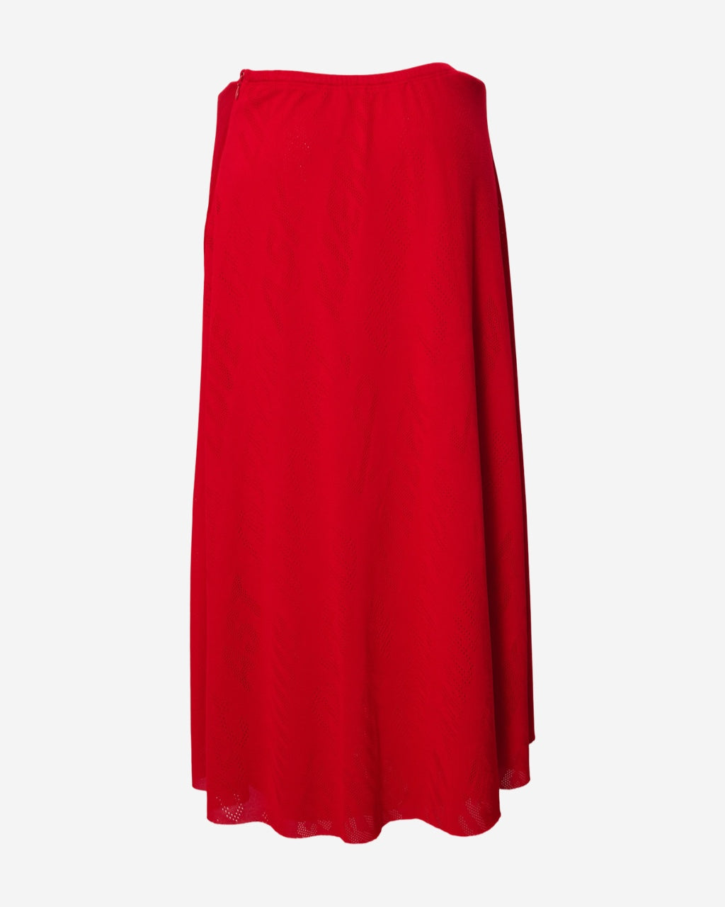 - Descripción: Falda Balenciaga en color rojo, largo midi, ajuste con resorte a la cadera y cierre de doble sentido en el lateral, motivo de perforaciones, corte en A