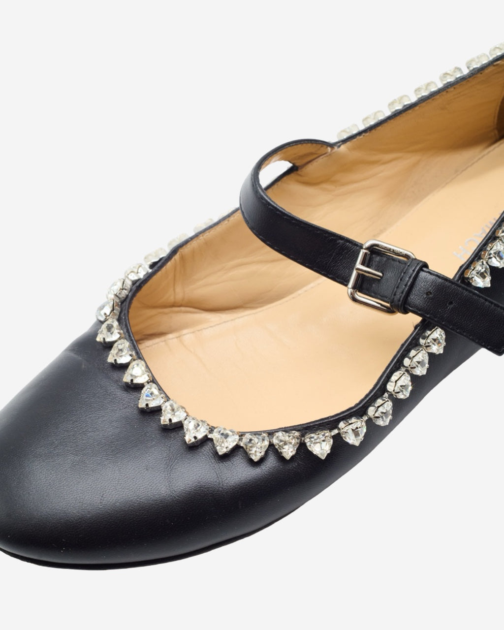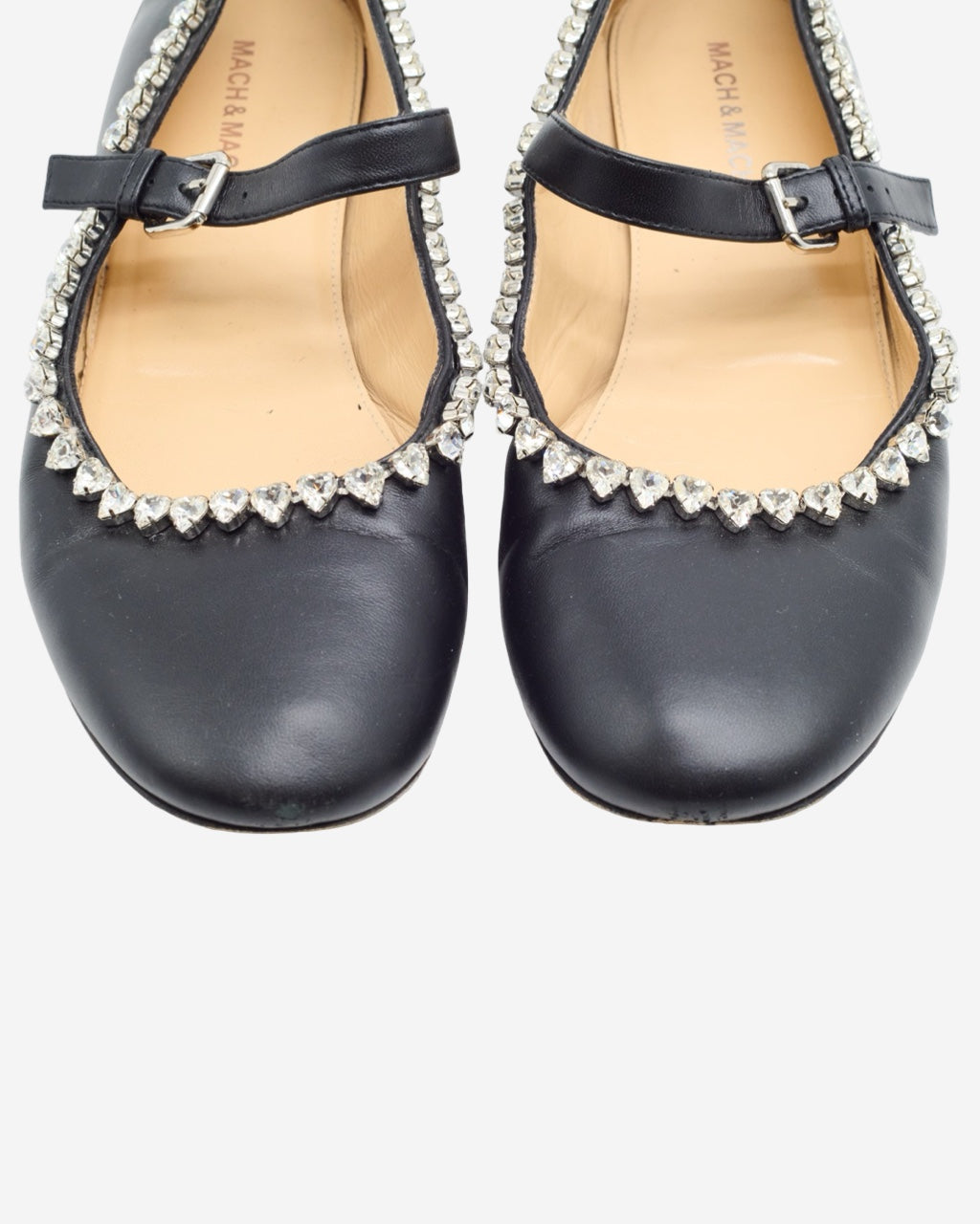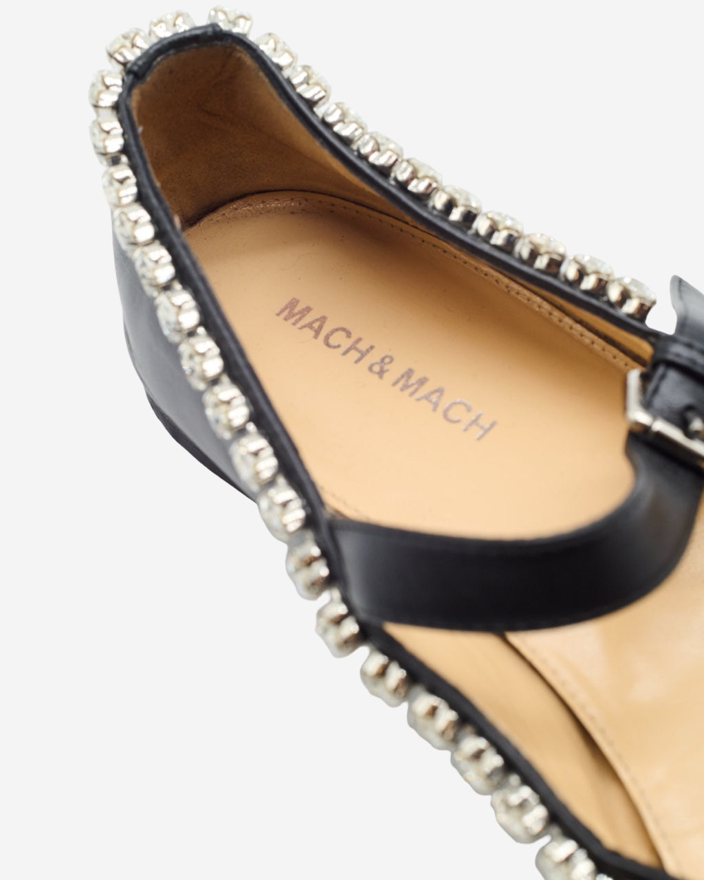 - Descripción: Flats Mach & Mach en piel color negro, puntera redondeada, ajuste con strap, motivo de rhinestones en forma de corazón en el contorno, hardware en tono plateado