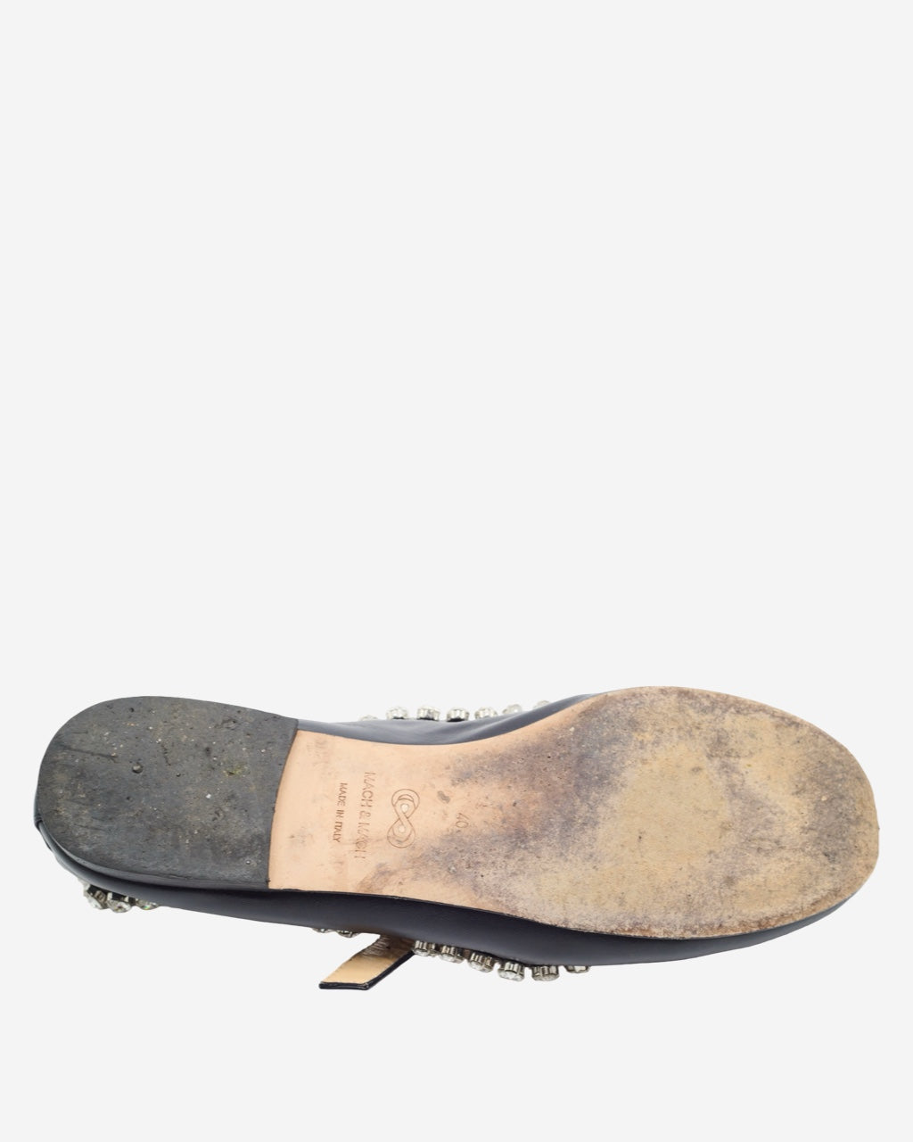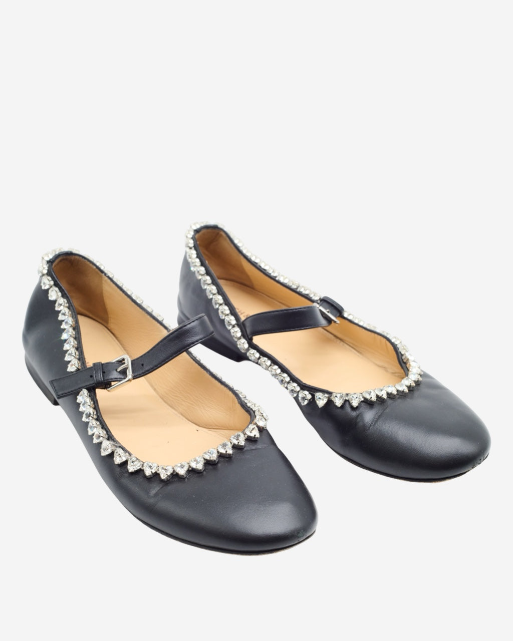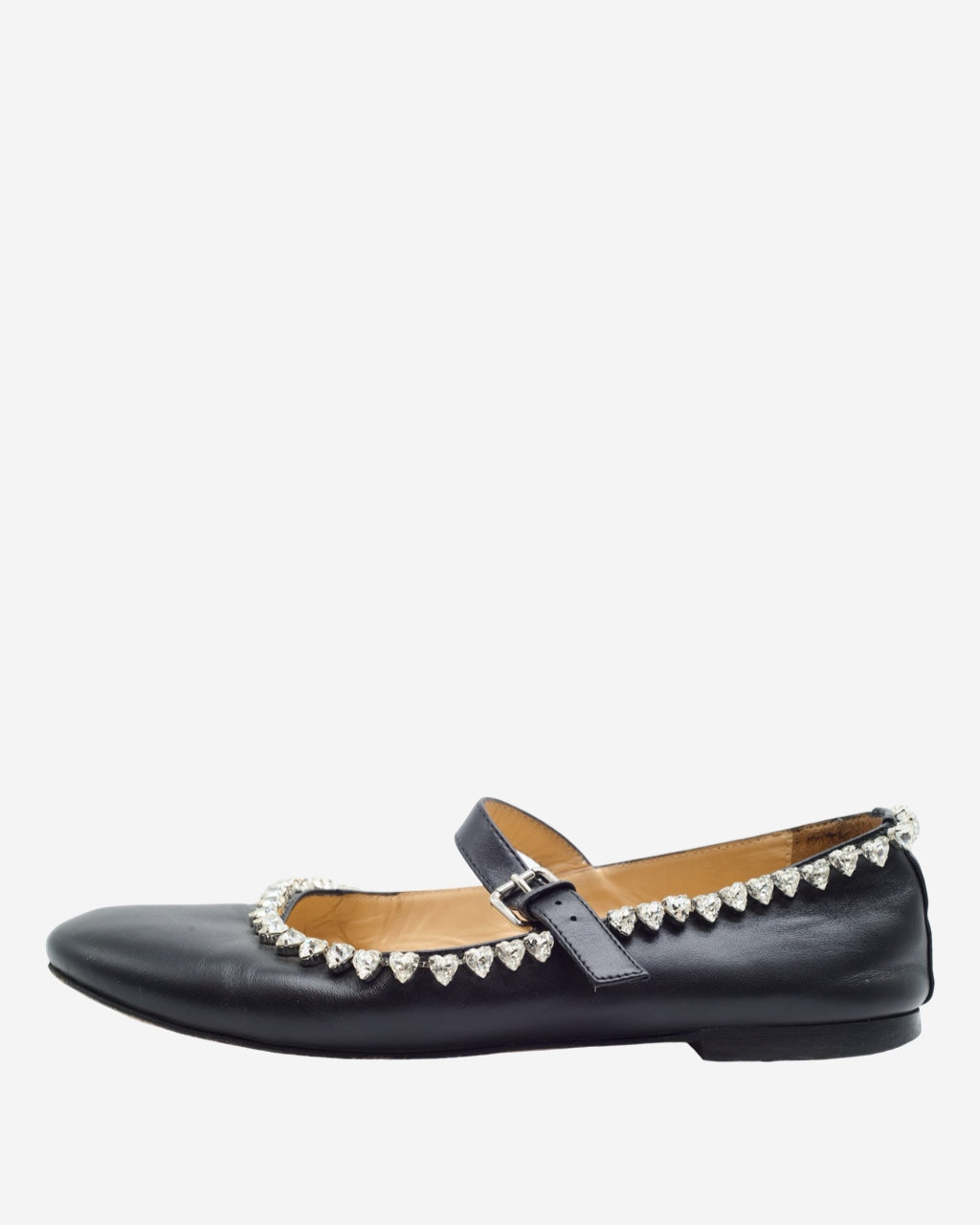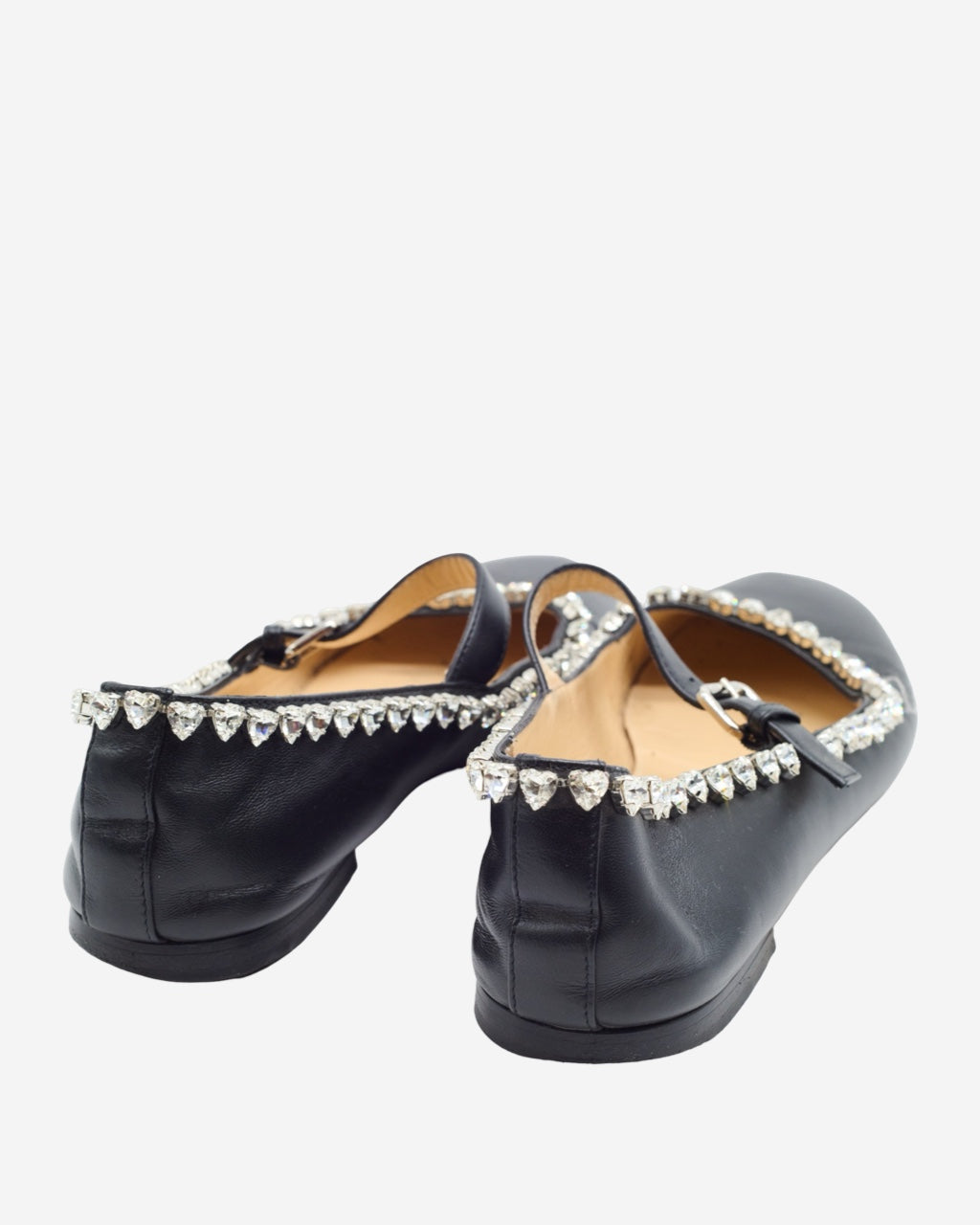 - Descripción: Flats Mach & Mach en piel color negro, puntera redondeada, ajuste con strap, motivo de rhinestones en forma de corazón en el contorno, hardware en tono plateado