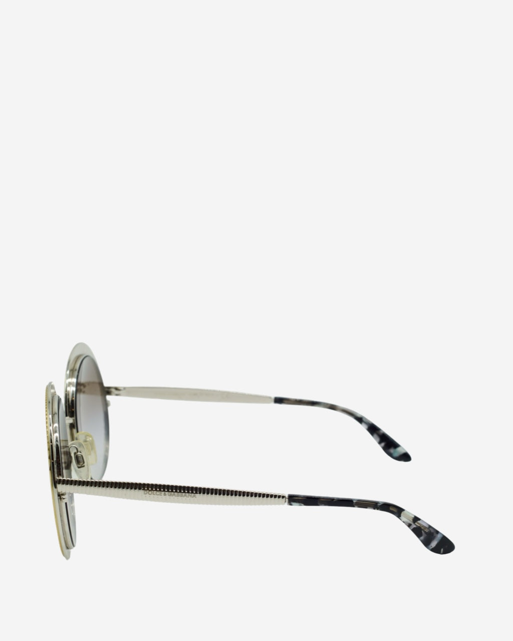 - Descripción: Lentes de sol Dolce & Gabbana en acero inoxidable, forma redondeada, logo característico grabado en los laterales, lente entintado en color negro