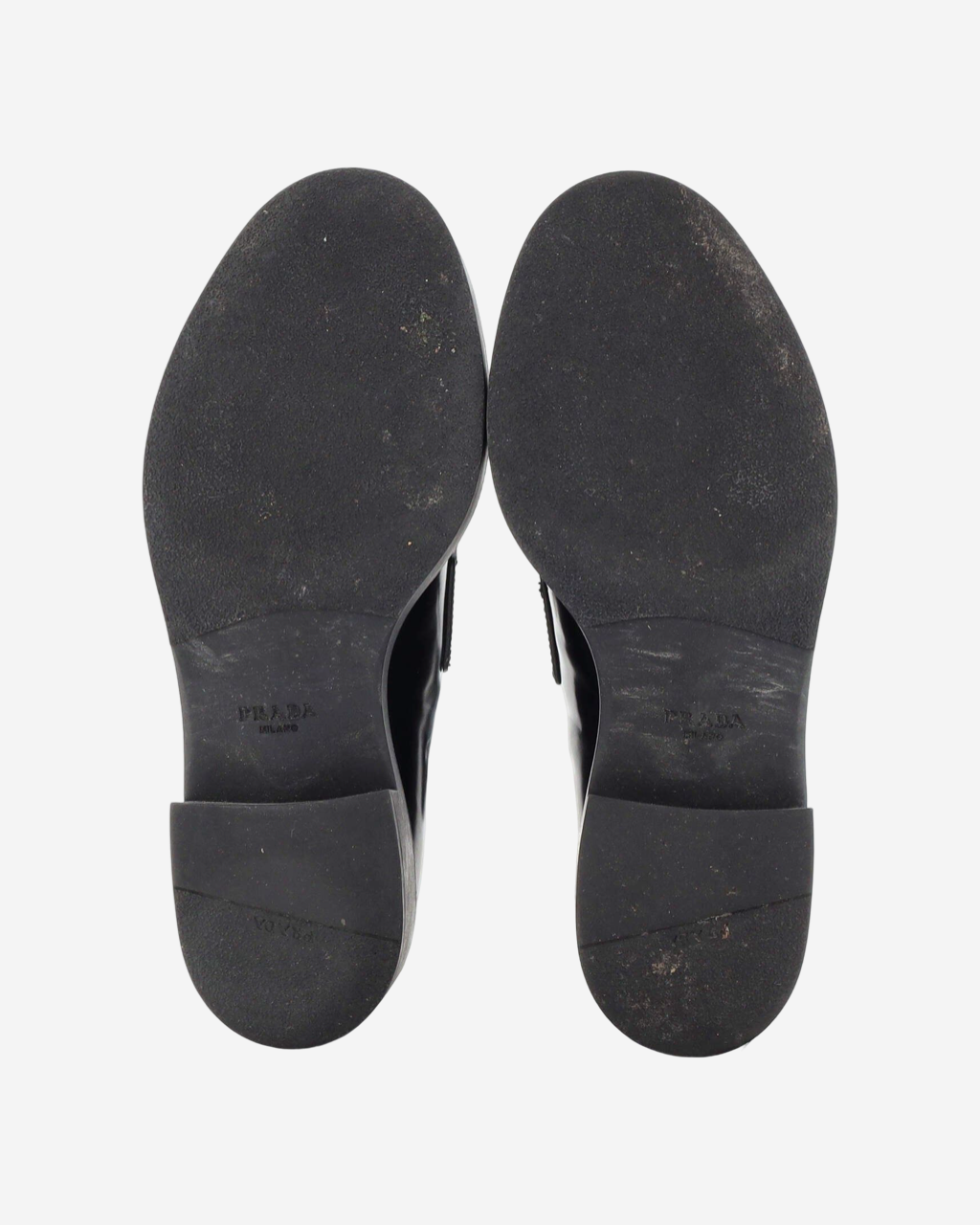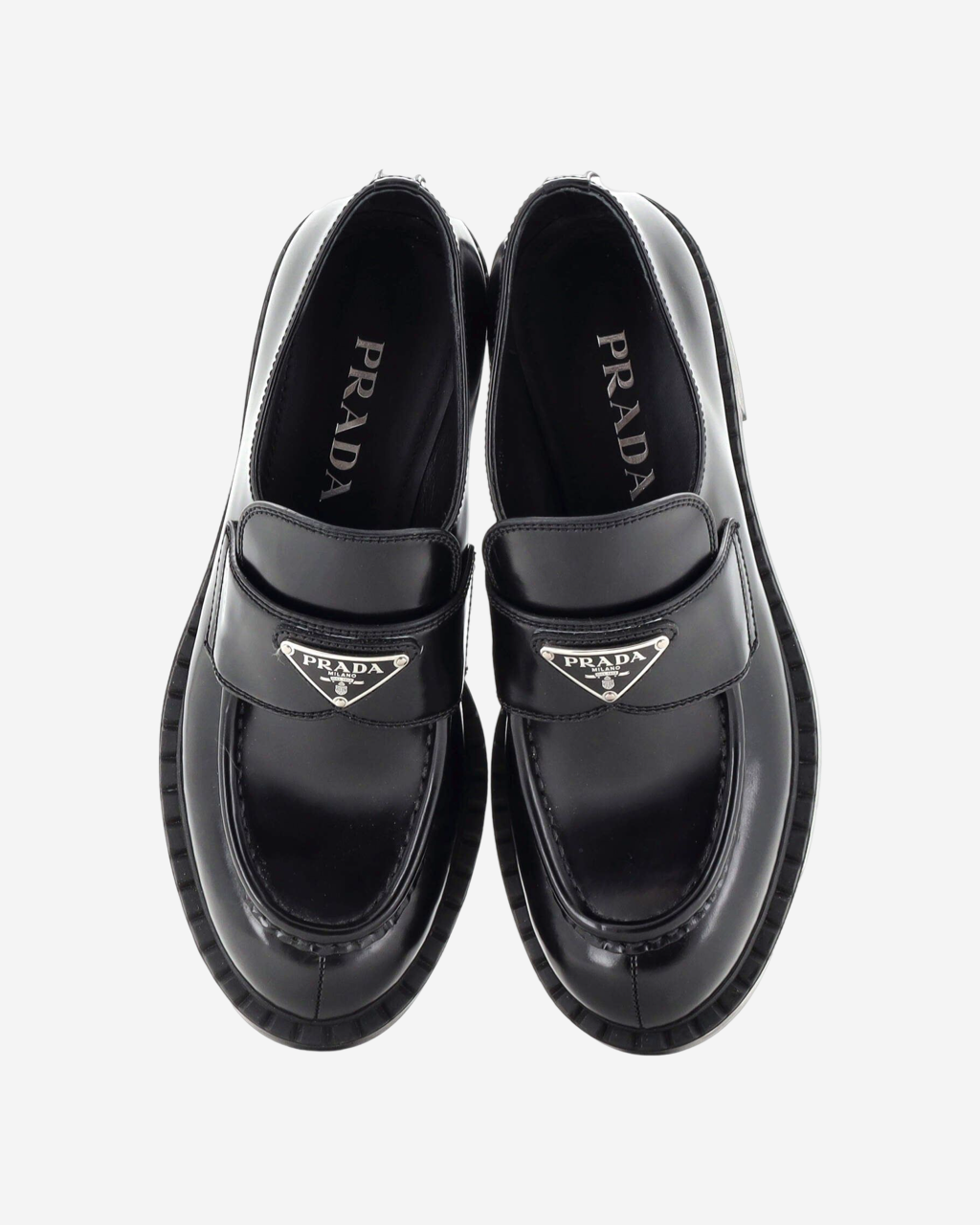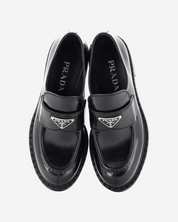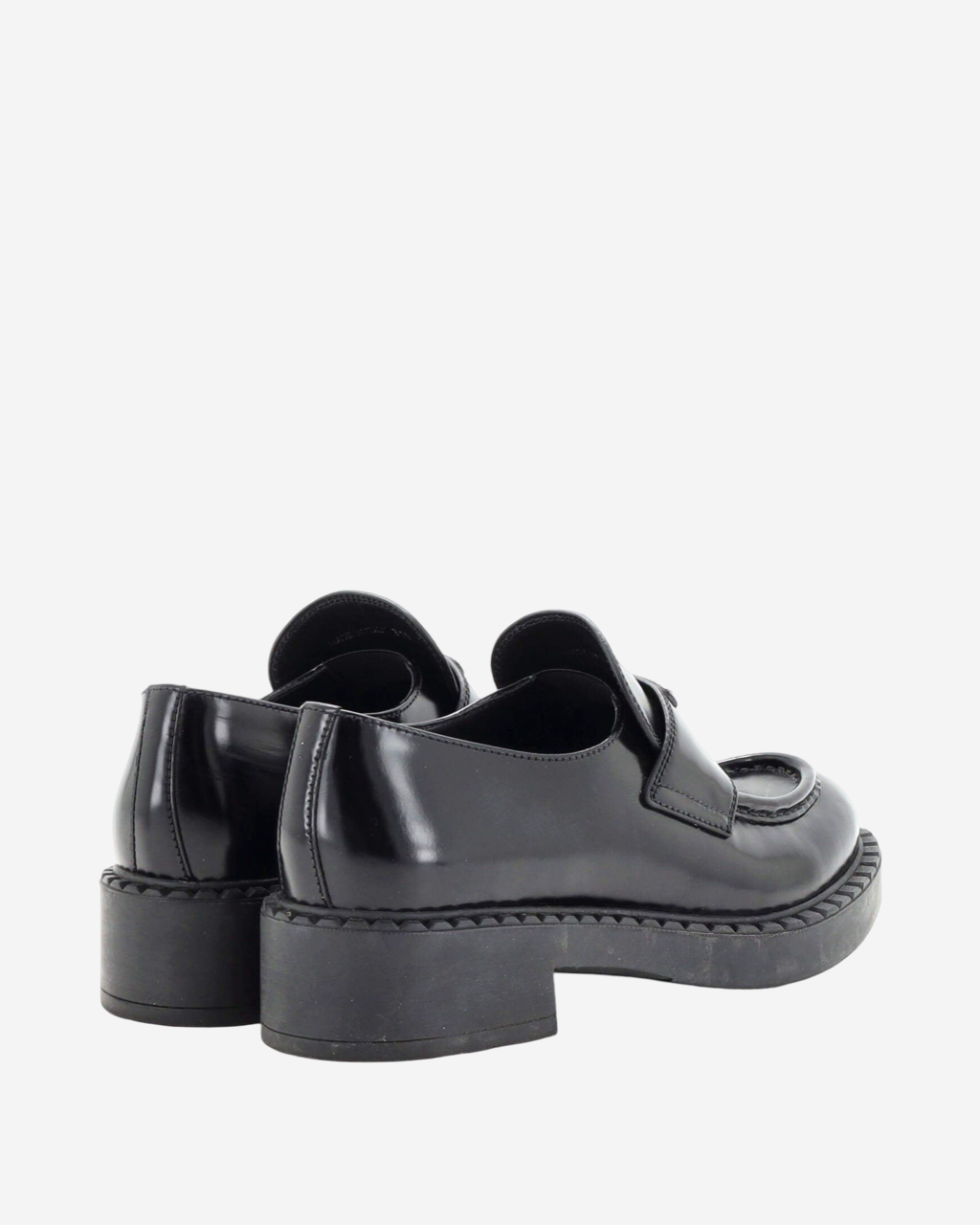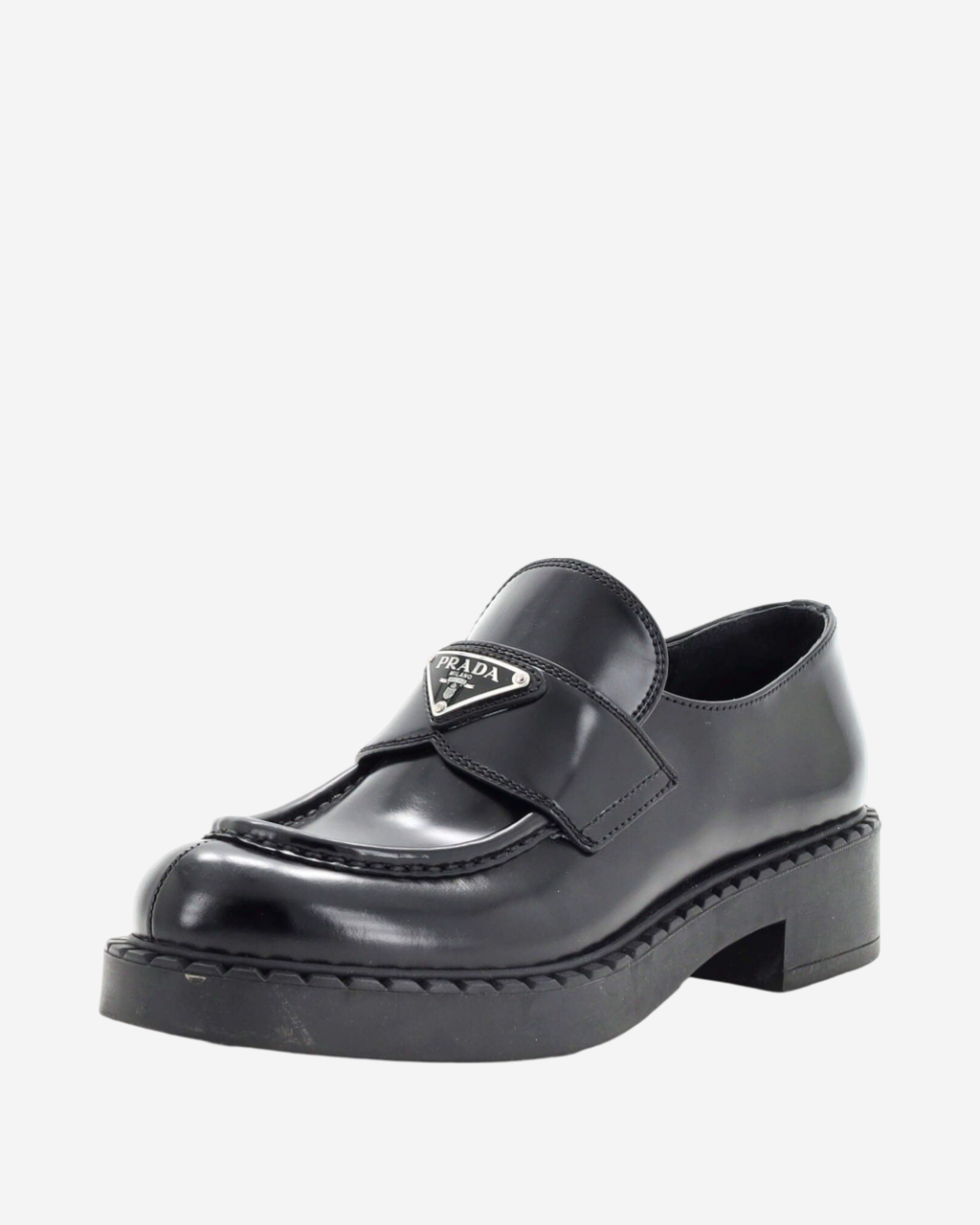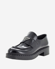 - Descripción: Loafers en piel color negro con placa triangular característica, puntera redondeada, tacón pequeño, hardware plateado